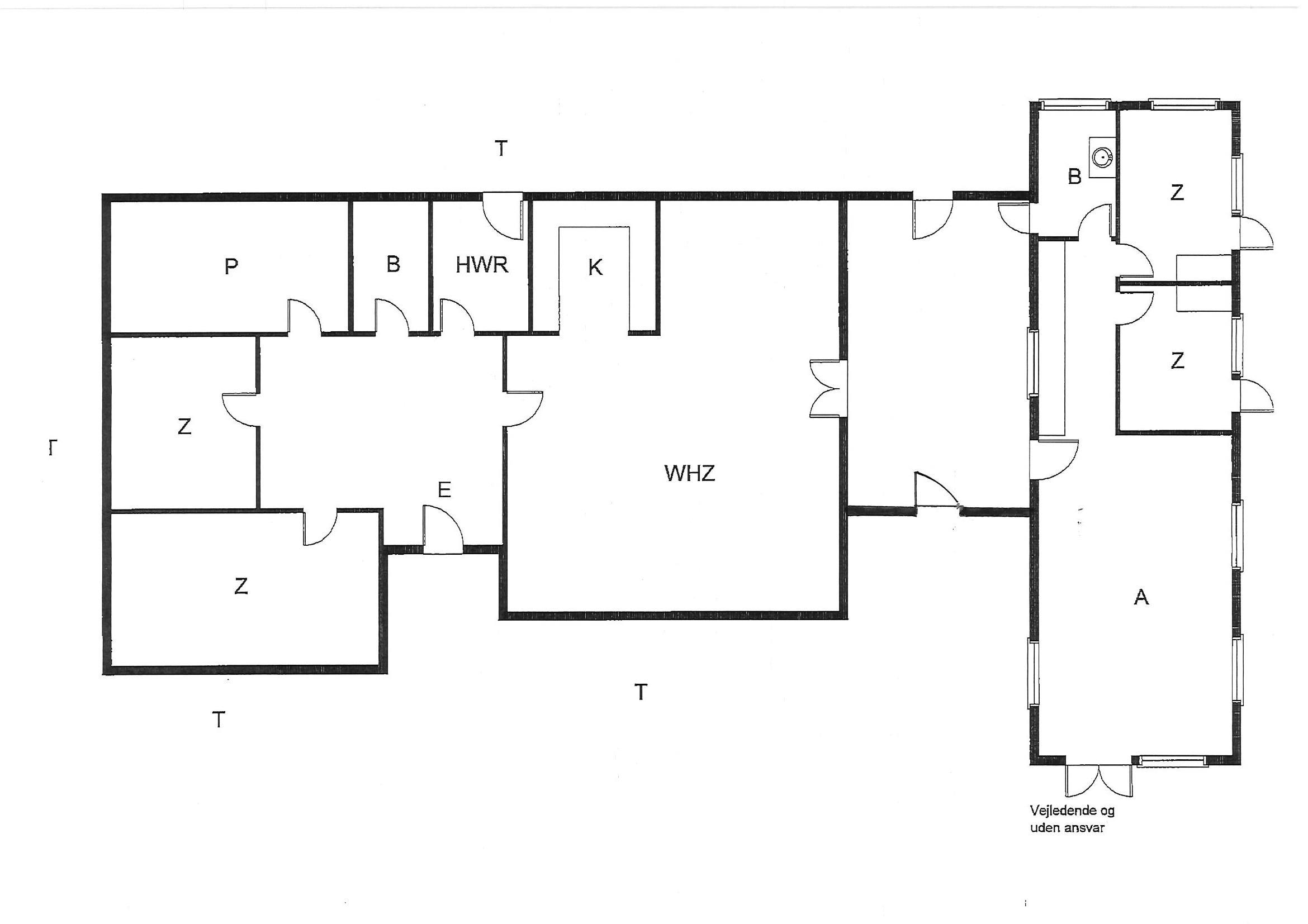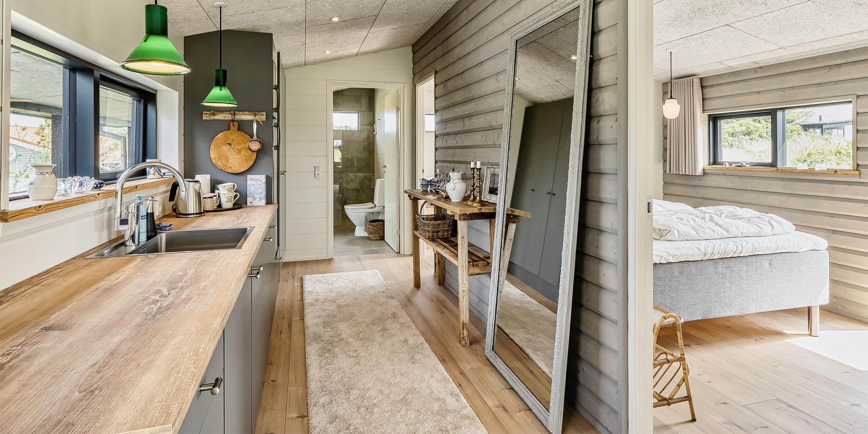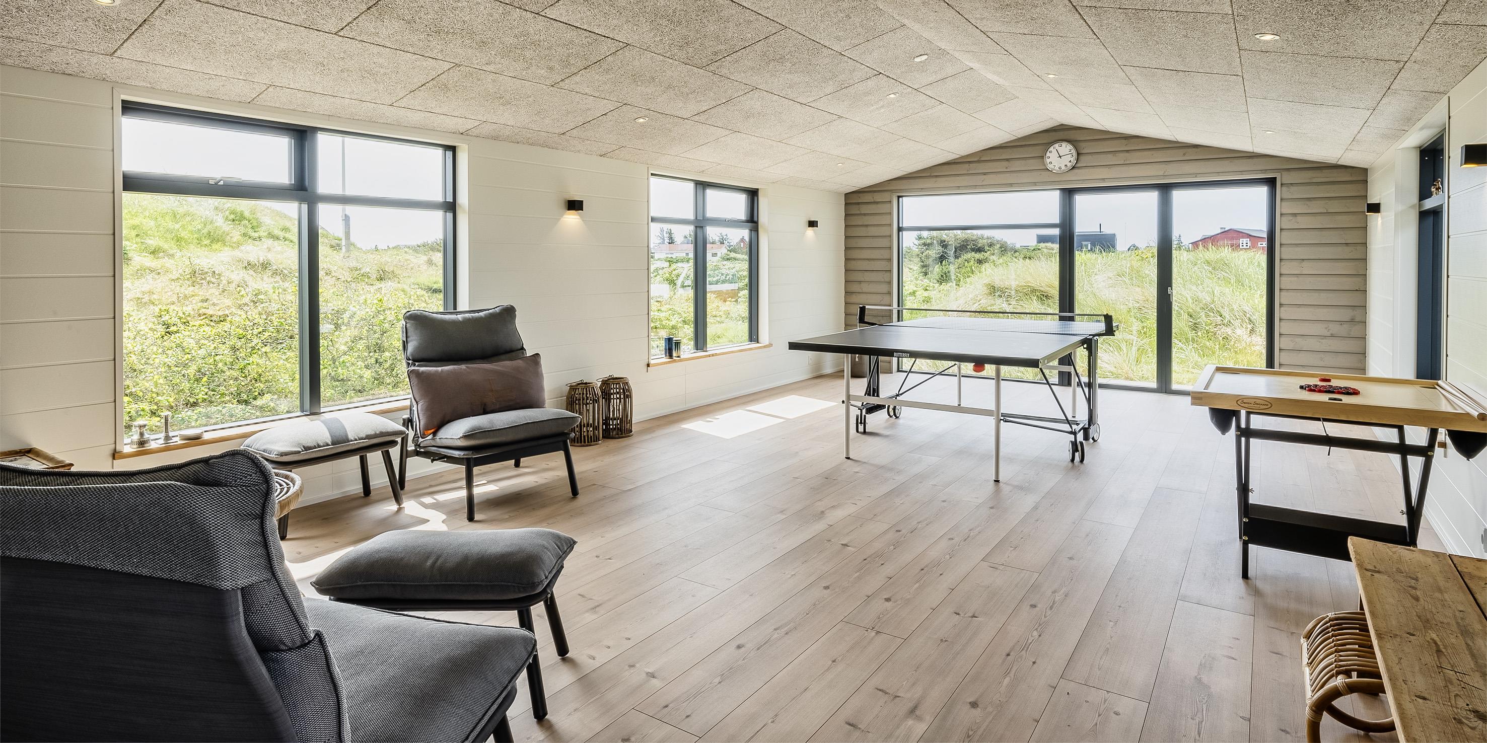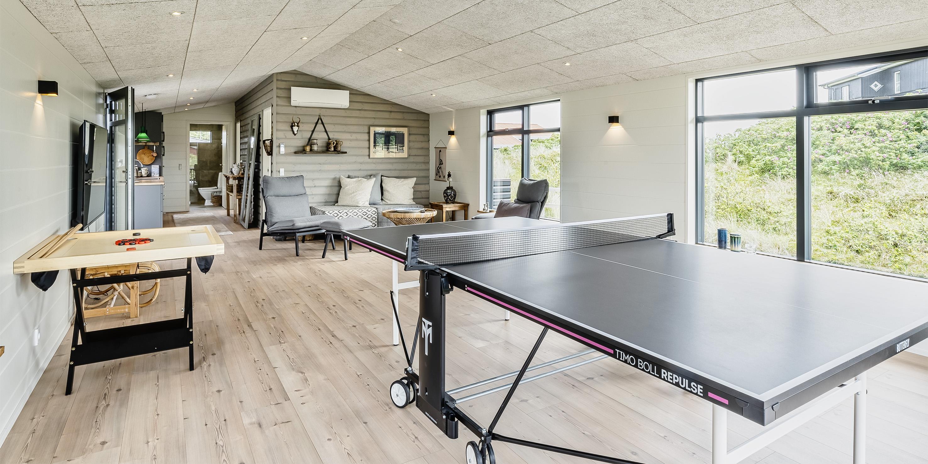 Huset indeholder: entré samt bryggers med vaskemaskine. 4 gode soveværelser, hvor 2 soveværelser befinder sig i annekse: DS + DS + DS + 4S. Et masterbadeværelse med bruser, vaskearrangement og toilet. I annekset befinder der sig også et badeværelse med en bruser, toilet og vaskearrangement. Køkkenet fremstår med alt komfort og med bageovn, kogeplader, emhætte, mikroovn, køle-fryseskab og opvaskemaskine. Spiseafdelingen og stuen er i åben forbindelse med køkkenet. Rummet har store panoramavinduer, hvor omgivelserne kan nydes. I annekset er der et stort aktivitetsrum med bordtennis og bop bord samt fjernsyn til Chromecast. Tekøkken med vask og køle-/frysekombination.