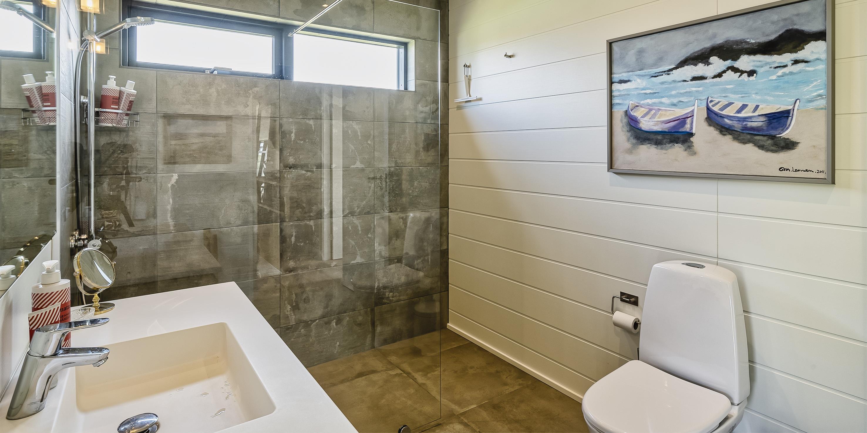Bad med toilet, bruser og vask