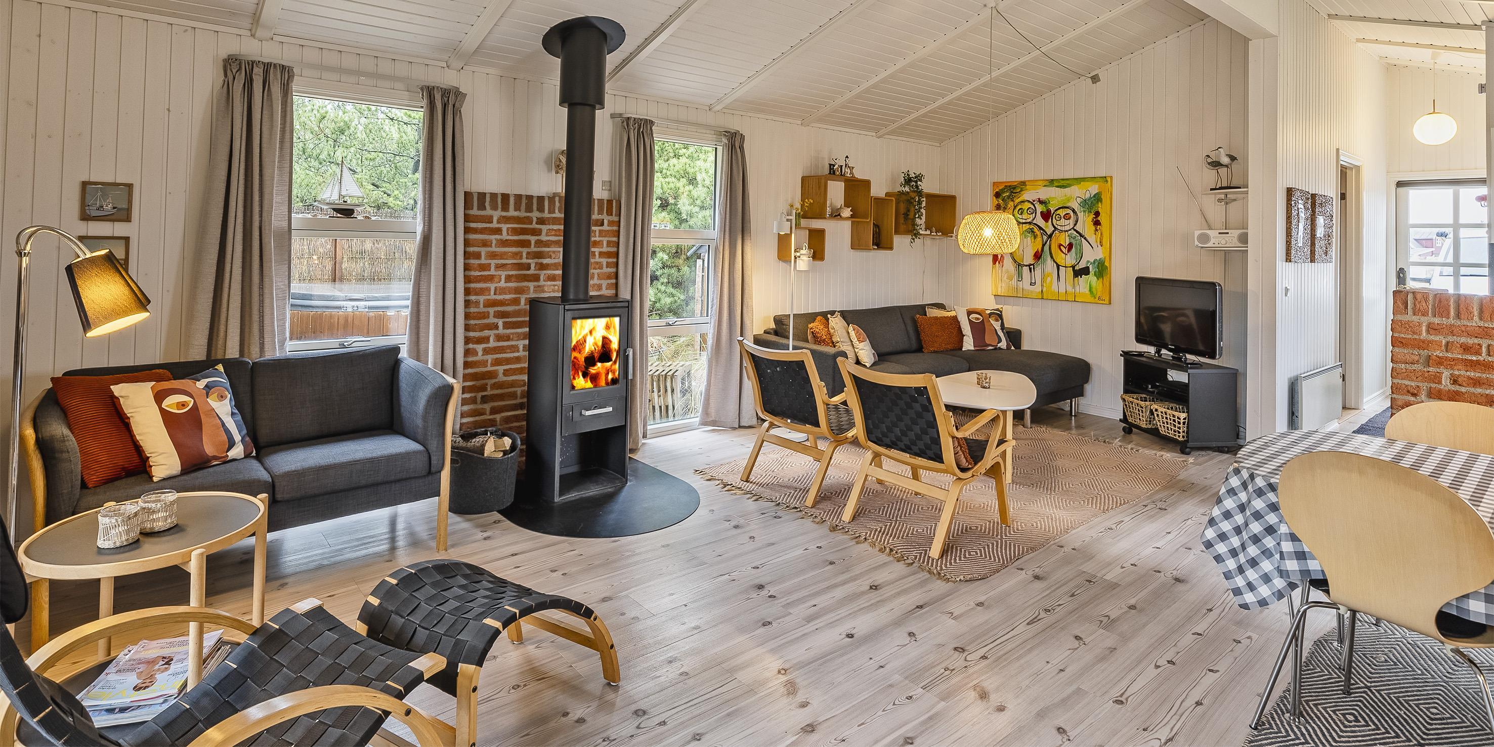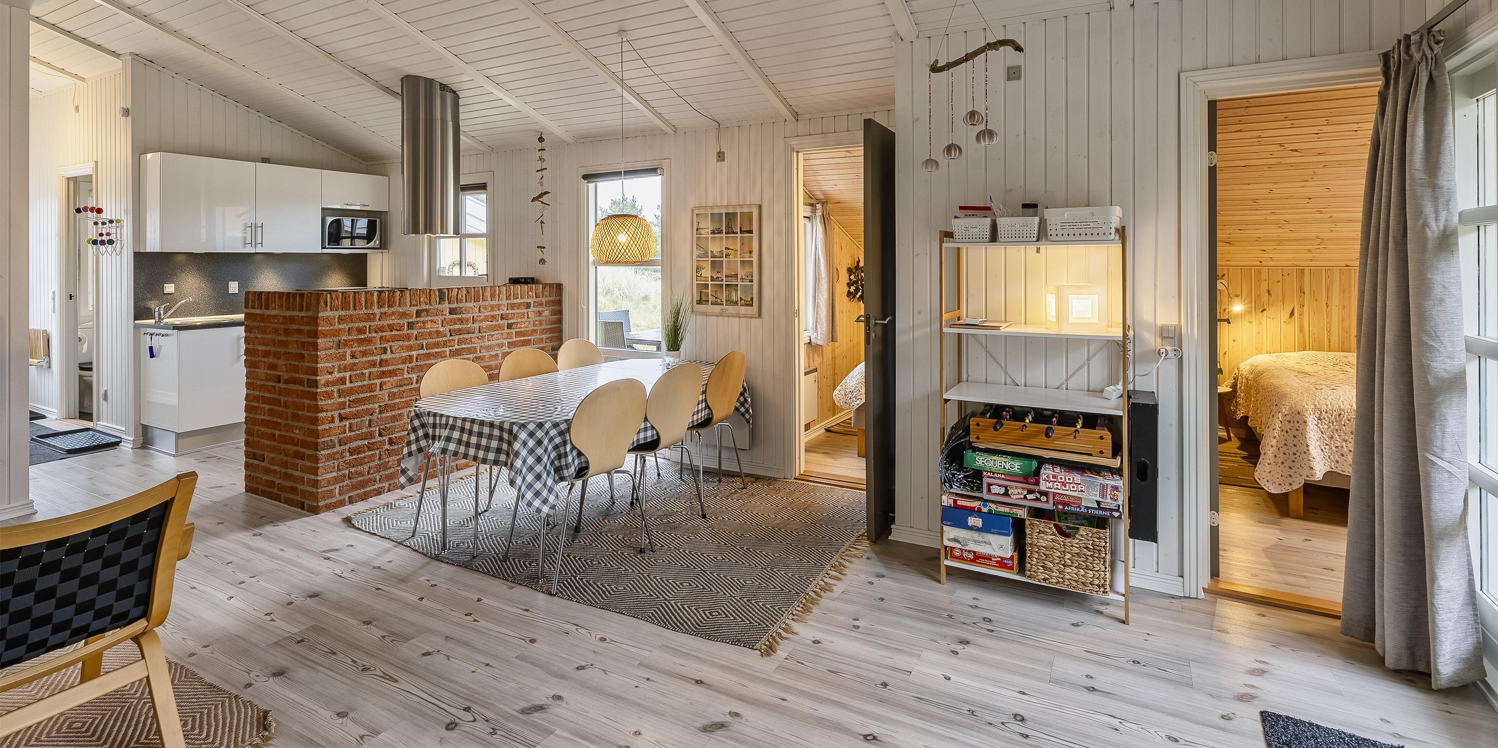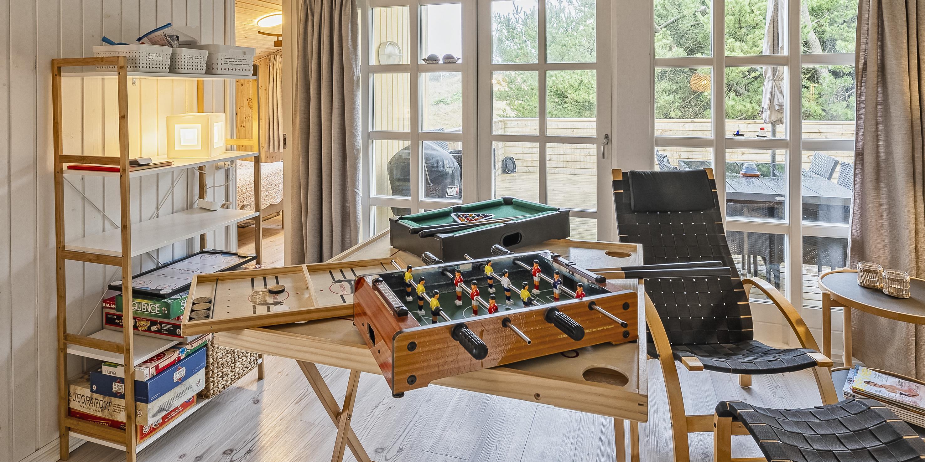 Indenfor i sommerhuset på Risvej 4 venter en lys og venlig indretning, der skaber en behagelig atmosfære. Alrummet er husets samlingspunkt, hvor I kan se film, lave mad og nyde brændeovnens knitrende flammer. På badeværelset finder I en dejlig sauna, perfekt til afslapning efter en tur ved havet eller en frisk gåtur i naturen. Derudover byder huset på masser af indendørs aktiviteter for familier og gæster i alle aldre, såsom bobspil, minifodbold, minibordtennis, bordhockey, en reol fyldt med brætspil, DVD og diverse film.