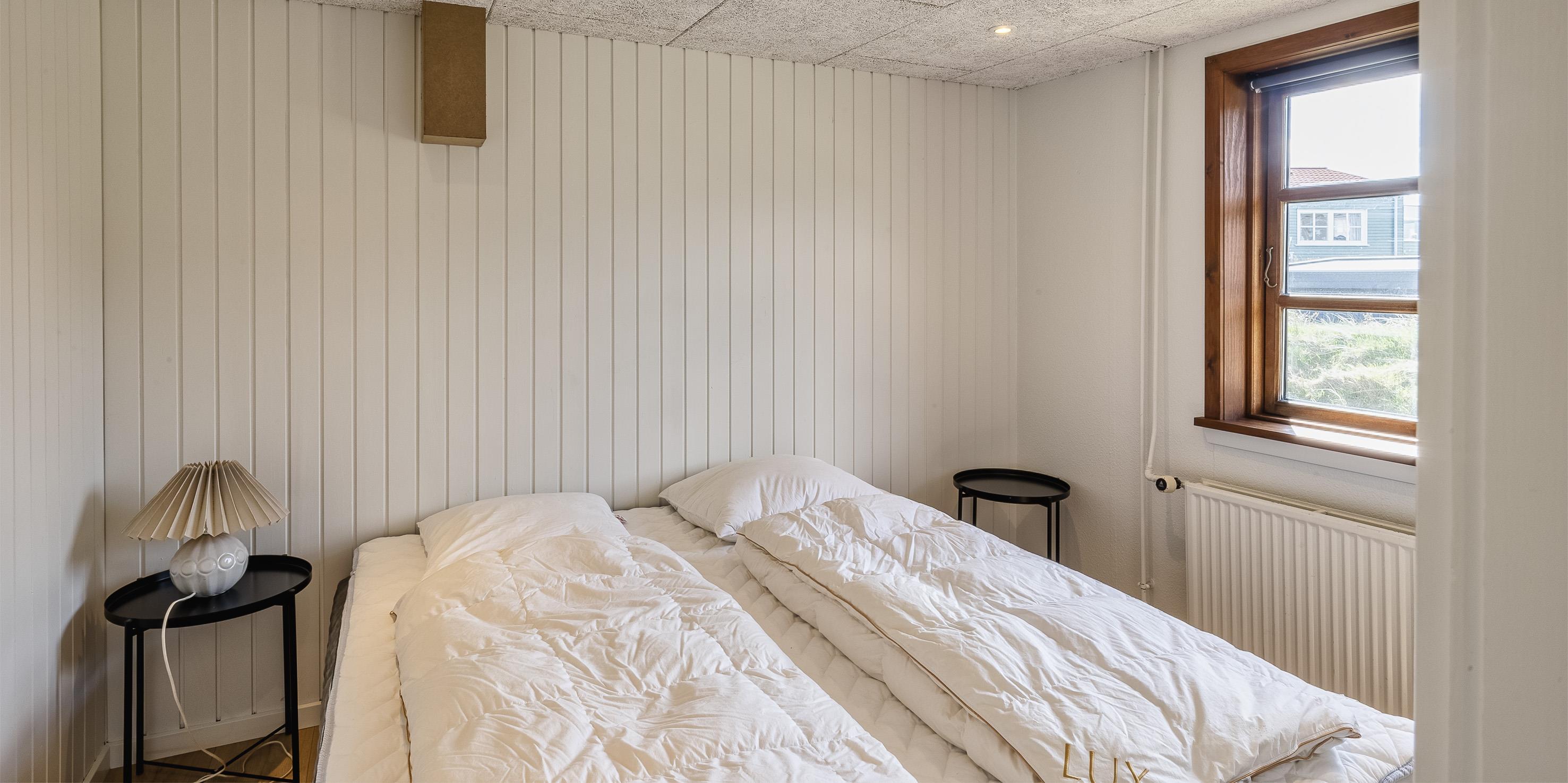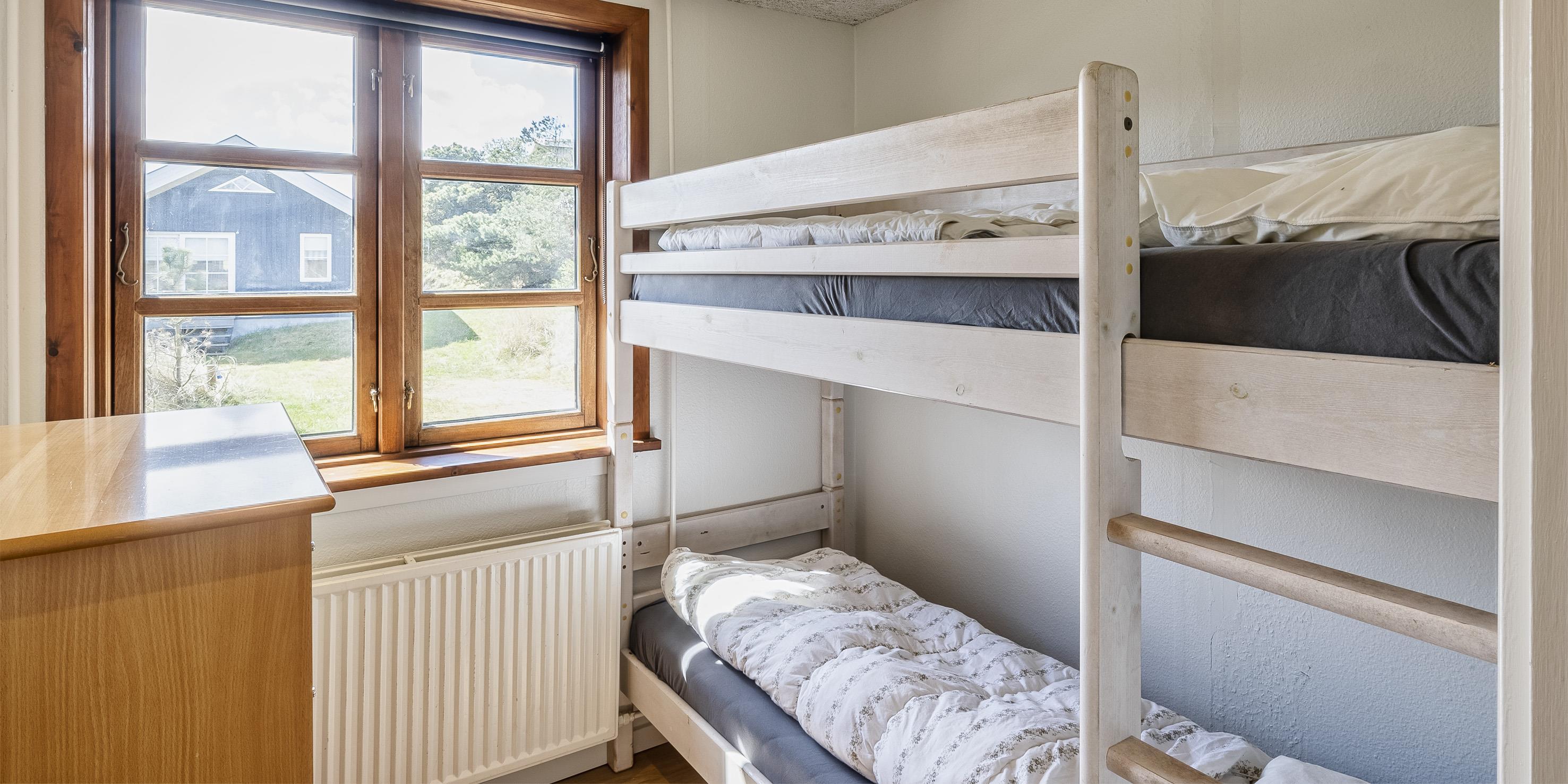 3 soveværelser. 2 med dobbeltseng 180x200 cm. 1 med Køjeseng (á 90x200 cm)