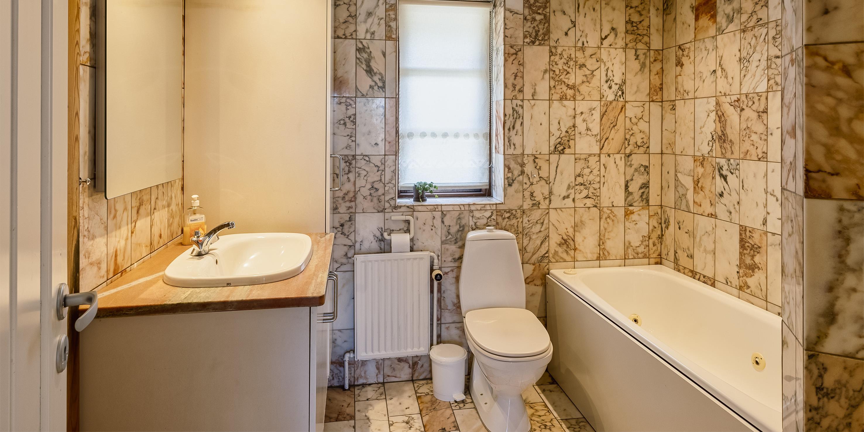 Bad med toilet, bruser og vask