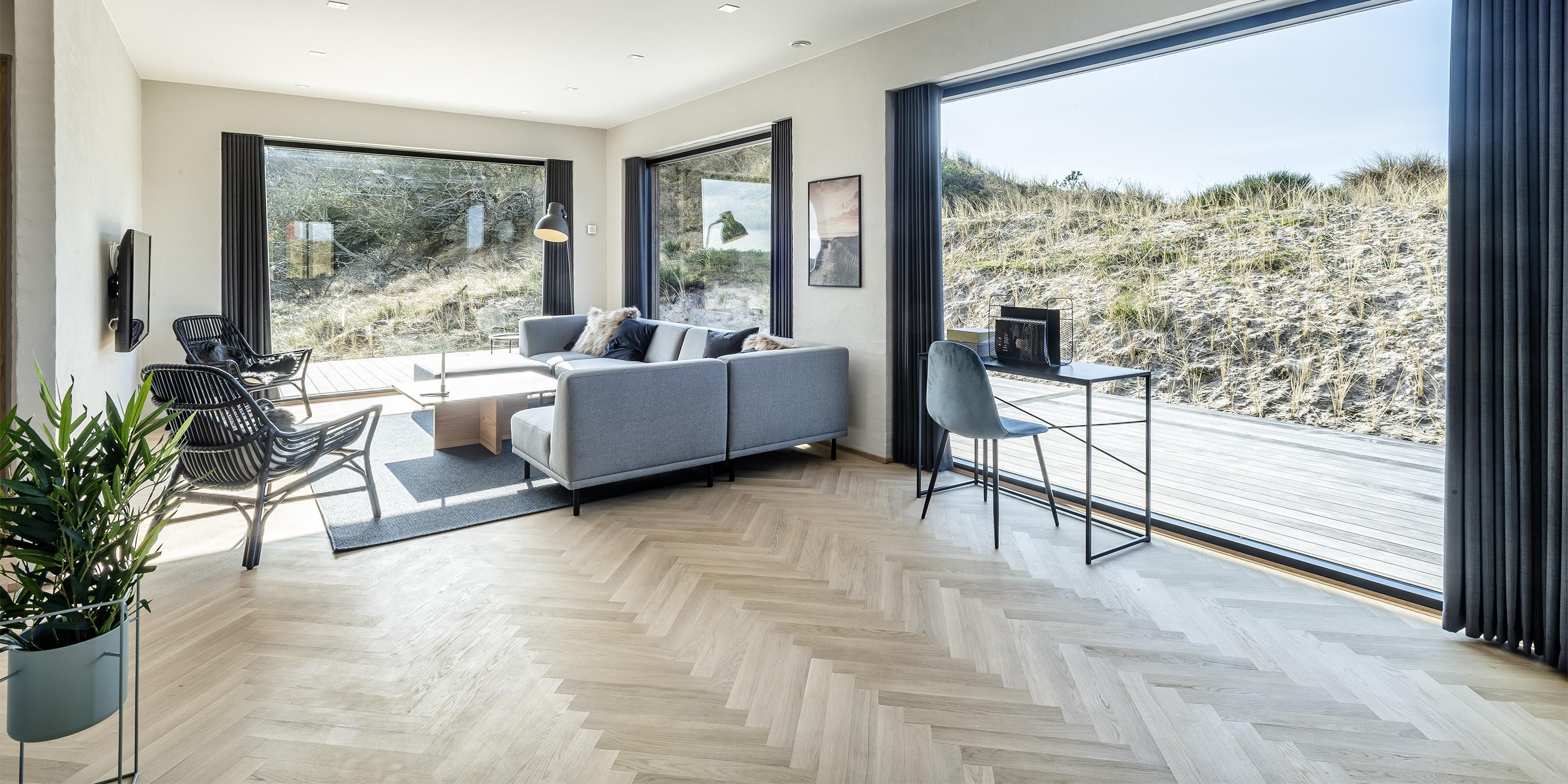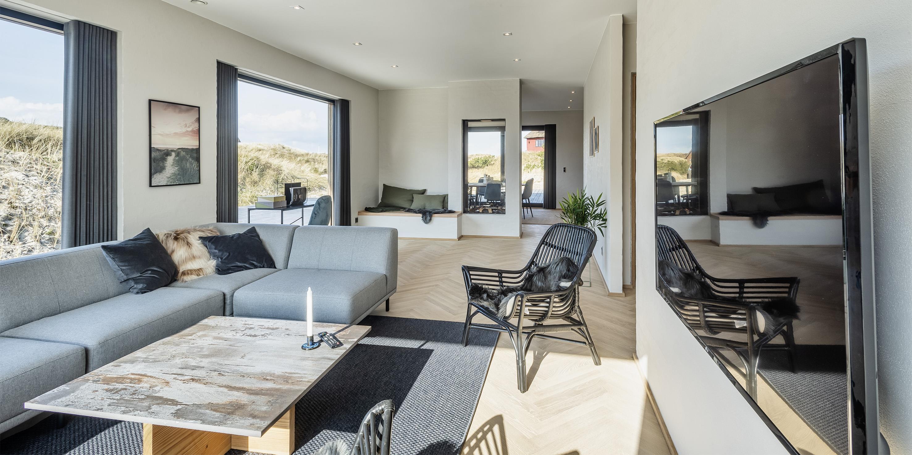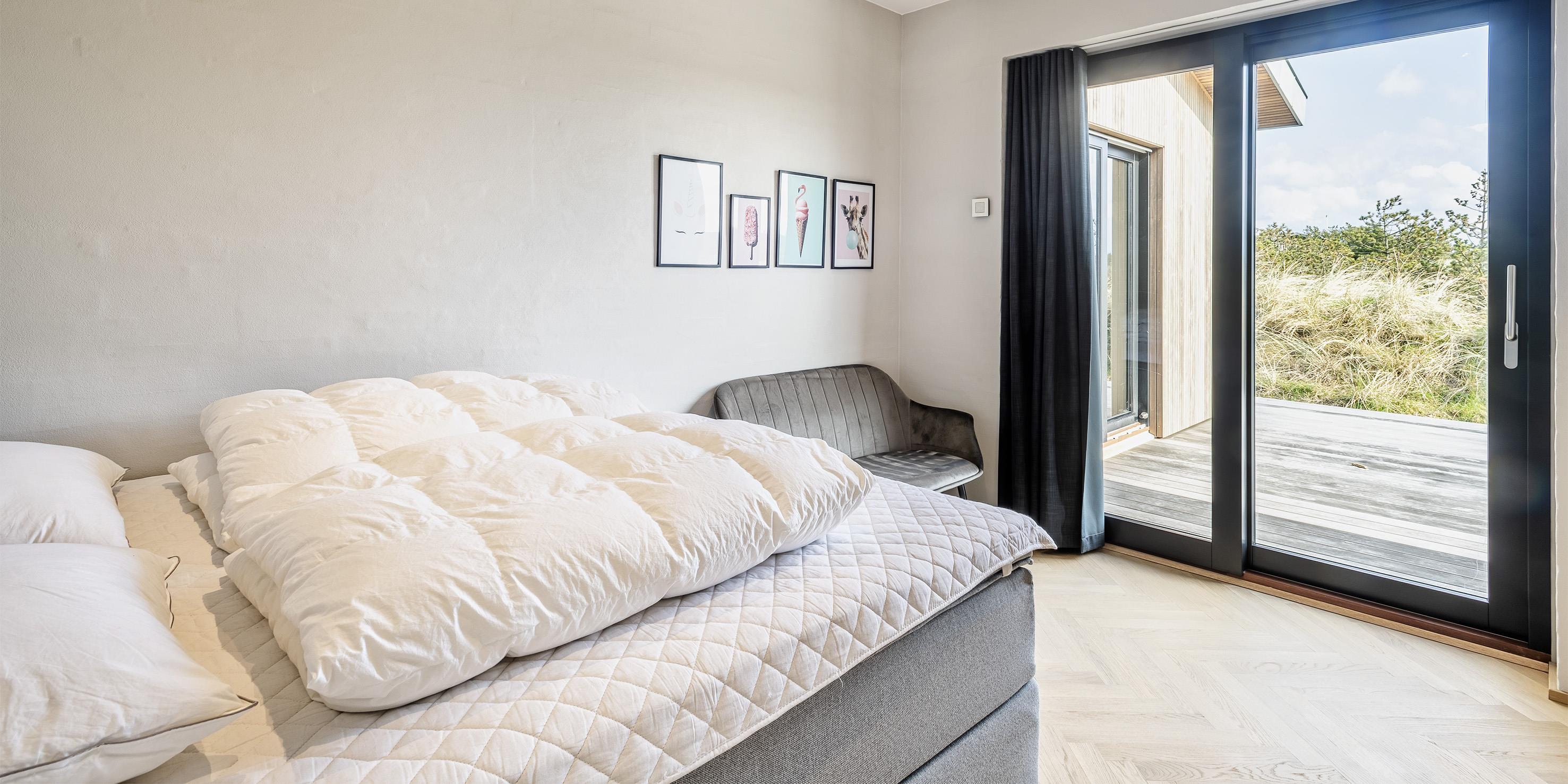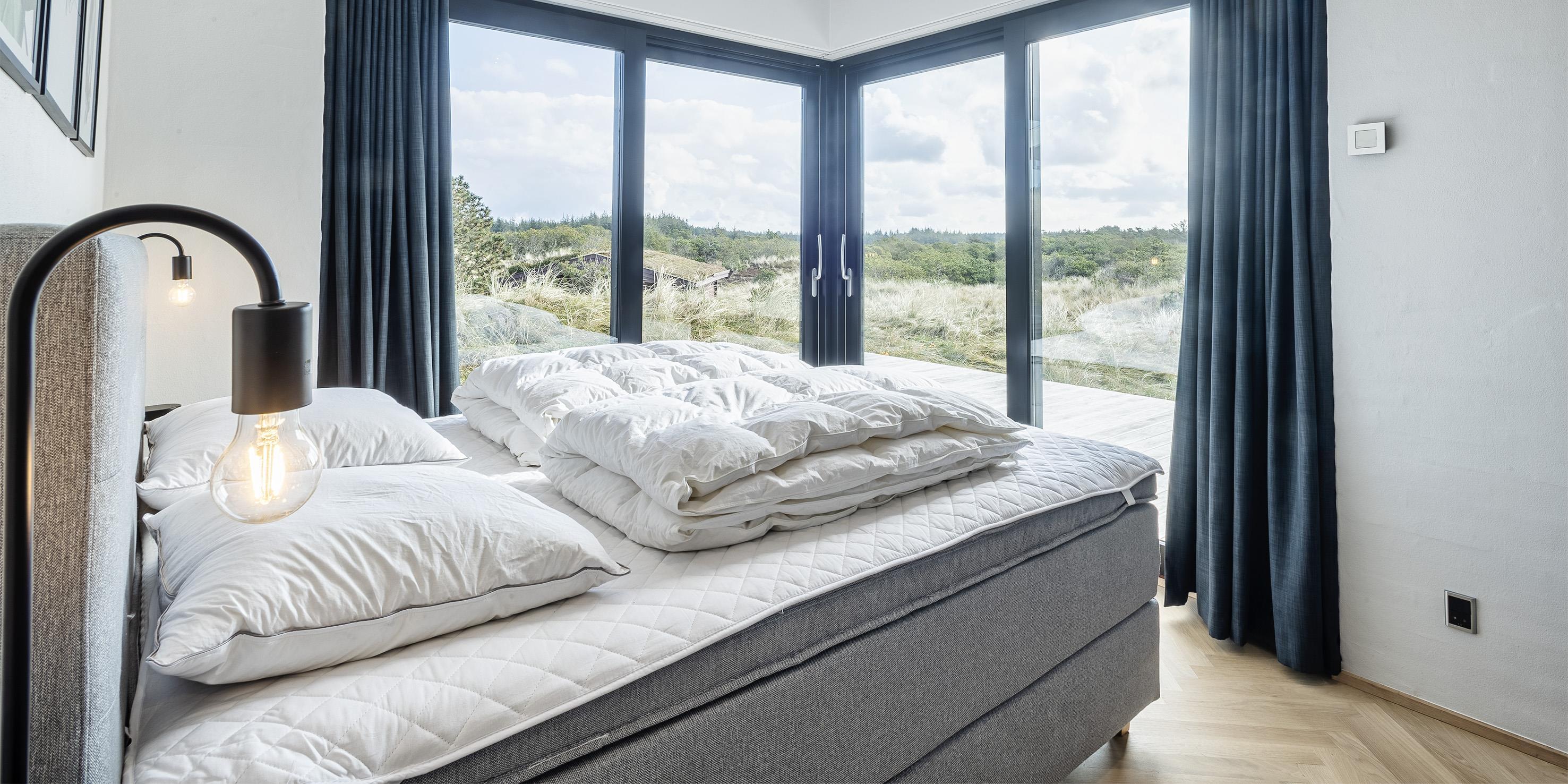 Herfra kommer man ind til entreen. Til venstre for hoveddøren forefindes der et stort bryggers med vaskemaskine og tørretumbler, god garderobeplads og plads til ekstra opbevaring. 2 store soveværelser på hver side af entreen, med dobbelt luksussenge, dobbelt garderobeskabe og udgang til terrasse. Et af soveværelserne er med Smart-TV. Wellness badeværelse med marmorfliser, stort vaskearrangement, garderobeskabe, væghængt toilet, stor bruseniche med glasvæg. Fra entréen kommer man over i det det åbne køkkenalrum, som går på tværs af huset. Fra køkkenet er der udgang til syd-østvendt terrasse hvor morgenmaden kan nydes over solopgangen med panoramablik over skovområde. Endvidere byder køkkenalrummet på et stort rundt spisebord, hvorfra udsigten kan nydes fra de store panoramavinduer og aftensmåltidet kan indtages med varmen fra den gaspejsen. Fra alrummet kommer man over i opholdsrummet, hvor varmen fra den gennemgående gaspejs kan nydes fra hyggekrogen ved pejsebænken (ekstra udgift til gas. Gasflasker kan ombyttes mod lille gebyr ved købmanden). Smart-Tv med danske og udenlandske kanaler. Trådløs internet. Værelsesfløj med endnu 2 store soveværelser med dobbelt luksussenge, dobbelt garderobeskabe, udgang til terrasse. Det ene soveværelse har panoramavinduer mod det syd-/østlige hjørne, hvor solopgangen kan følges fra sengen. Wellness badeværelse med marmorfliser, stort vaskearrangement, garderobeskabe, væghængt toilet, stor bruseniche og udgang til terrassen.