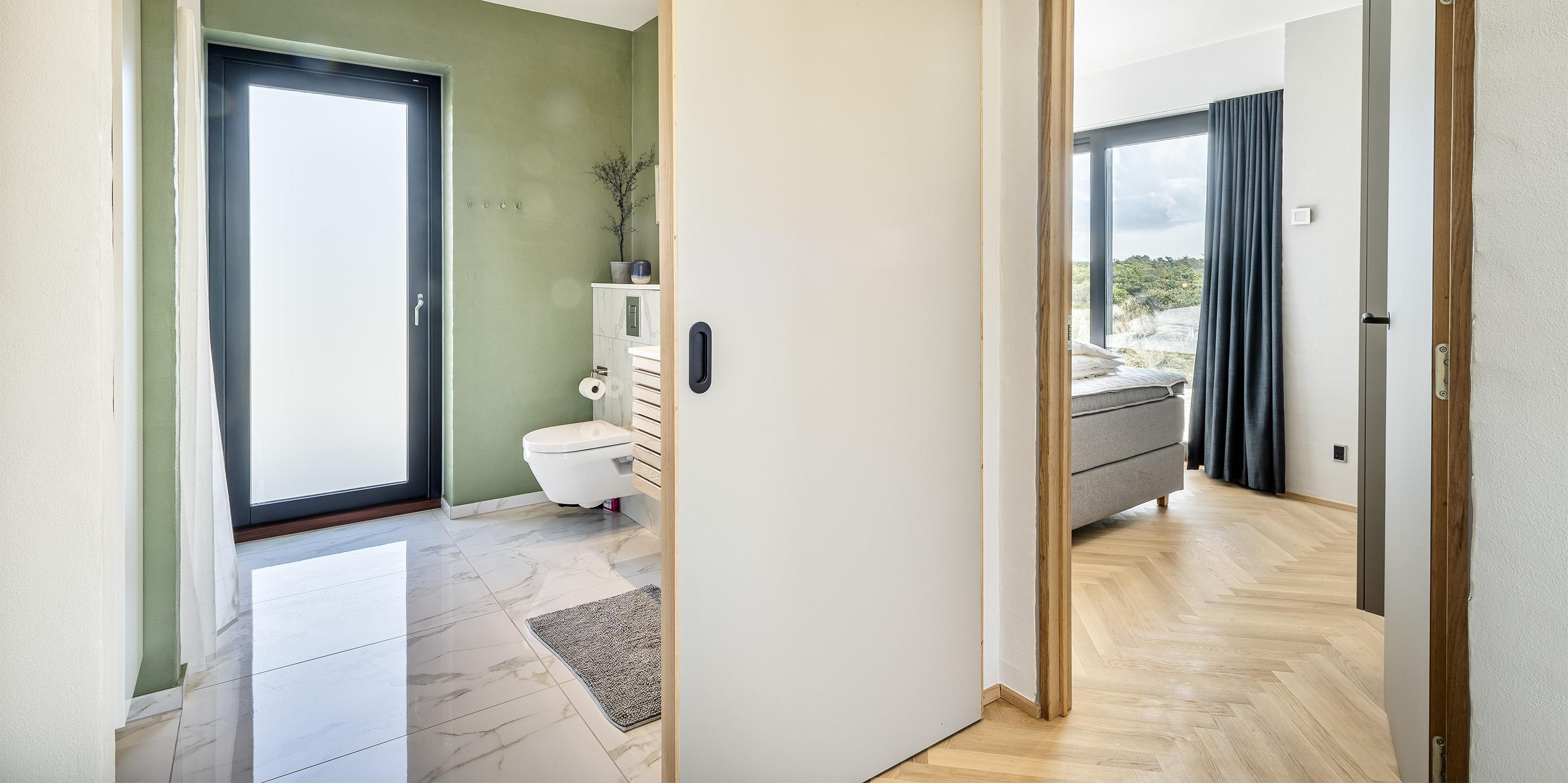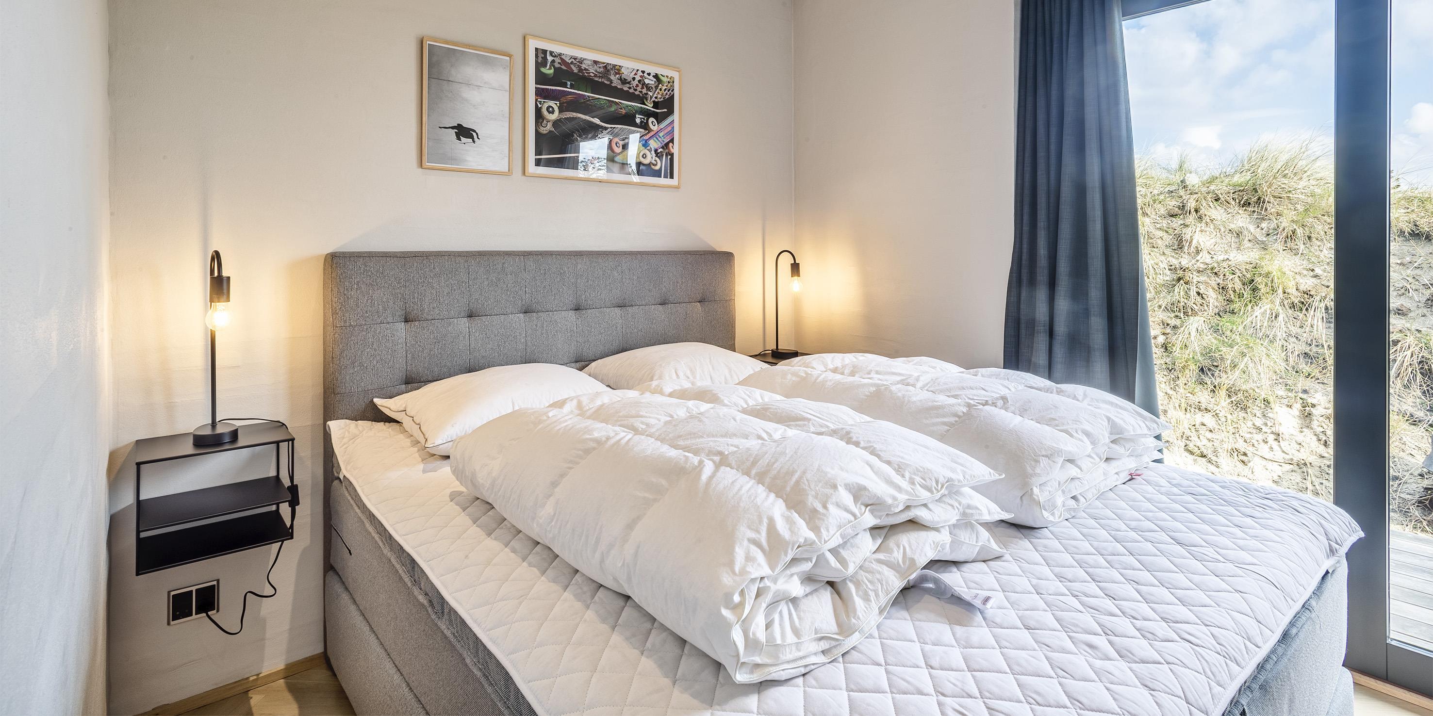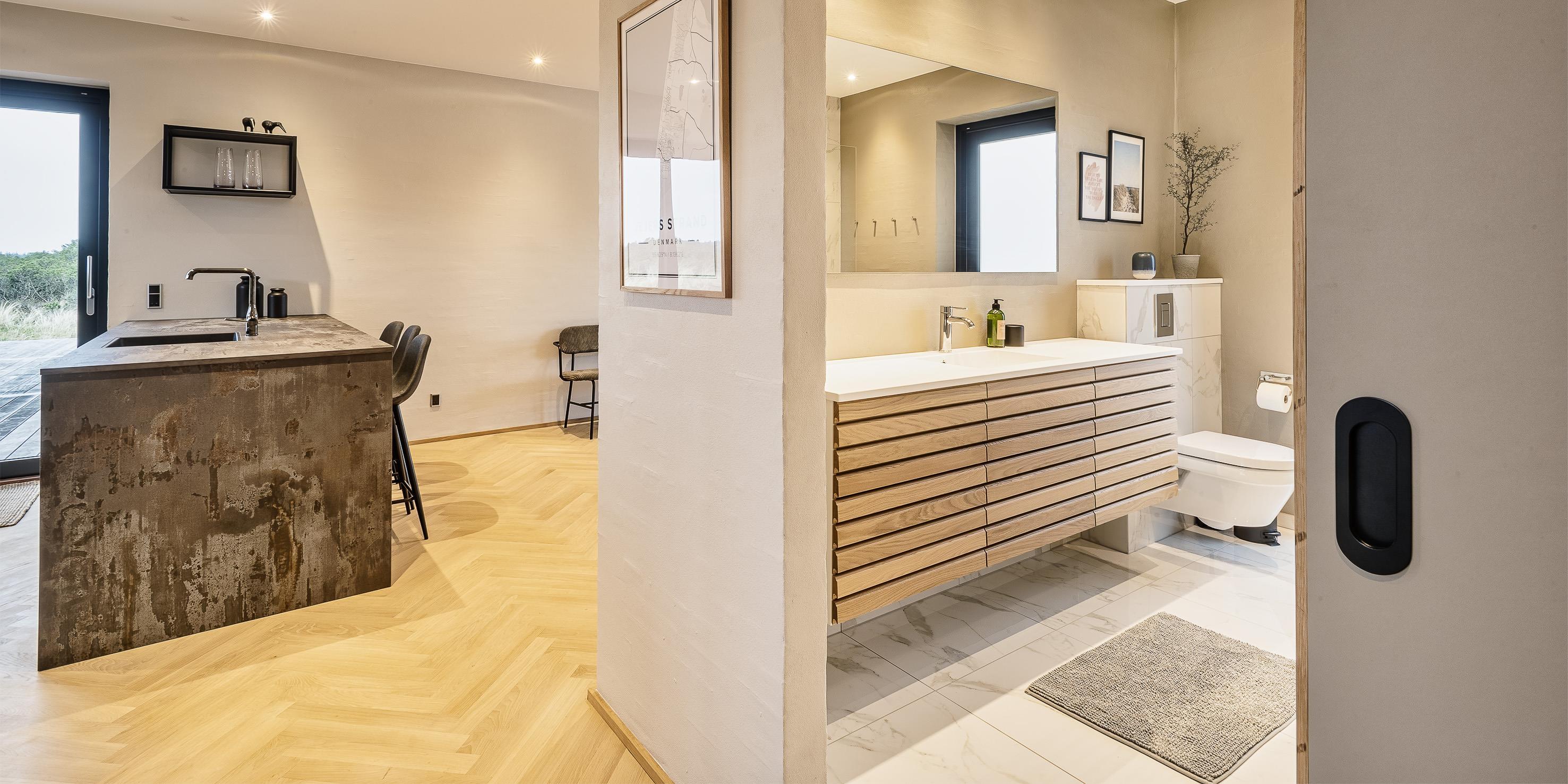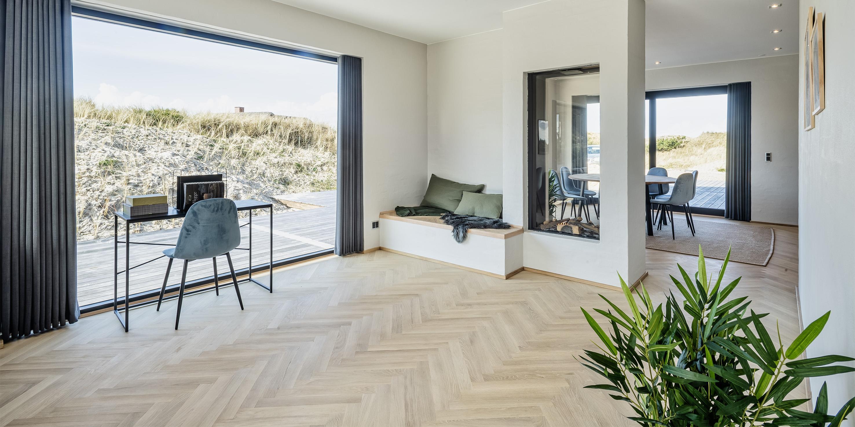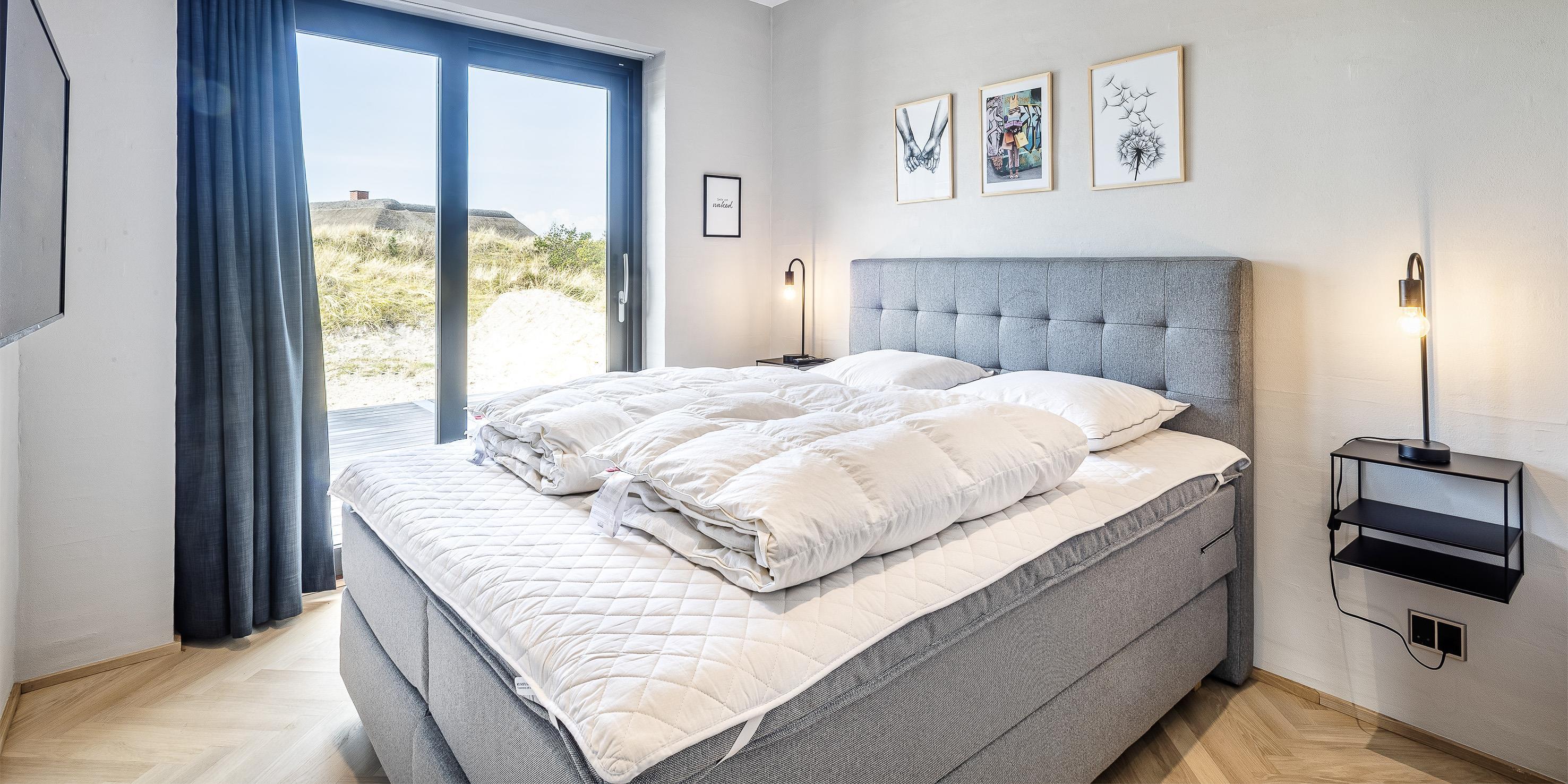 Herfra kommer man ind til entreen. Til venstre for hoveddøren forefindes der et stort bryggers med vaskemaskine og tørretumbler, god garderobeplads og plads til ekstra opbevaring. 2 store soveværelser på hver side af entreen, med dobbelt luksussenge, dobbelt garderobeskabe og udgang til terrasse. Et af soveværelserne er med Smart-TV. Wellness badeværelse med marmorfliser, stort vaskearrangement, garderobeskabe, væghængt toilet, stor bruseniche med glasvæg. Fra entréen kommer man over i det det åbne køkkenalrum, som går på tværs af huset. Fra køkkenet er der udgang til syd-østvendt terrasse hvor morgenmaden kan nydes over solopgangen med panoramablik over skovområde. Endvidere byder køkkenalrummet på et stort rundt spisebord, hvorfra udsigten kan nydes fra de store panoramavinduer og aftensmåltidet kan indtages med varmen fra den gaspejsen. Fra alrummet kommer man over i opholdsrummet, hvor varmen fra den gennemgående gaspejs kan nydes fra hyggekrogen ved pejsebænken (ekstra udgift til gas. Gasflasker kan ombyttes mod lille gebyr ved købmanden). Smart-Tv med danske og udenlandske kanaler. Trådløs internet. Værelsesfløj med endnu 2 store soveværelser med dobbelt luksussenge, dobbelt garderobeskabe, udgang til terrasse. Det ene soveværelse har panoramavinduer mod det syd-/østlige hjørne, hvor solopgangen kan følges fra sengen. Wellness badeværelse med marmorfliser, stort vaskearrangement, garderobeskabe, væghængt toilet, stor bruseniche og udgang til terrassen.