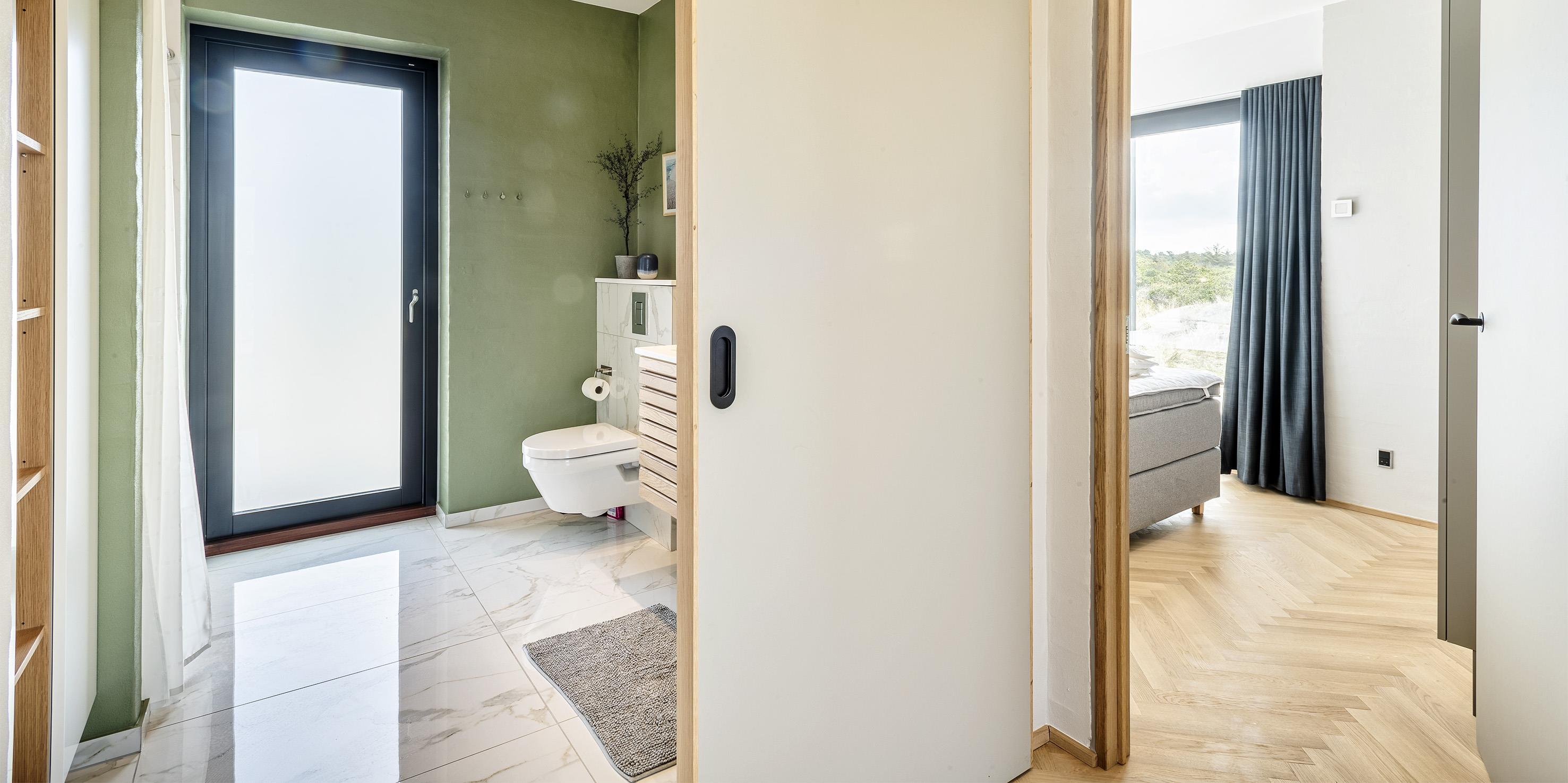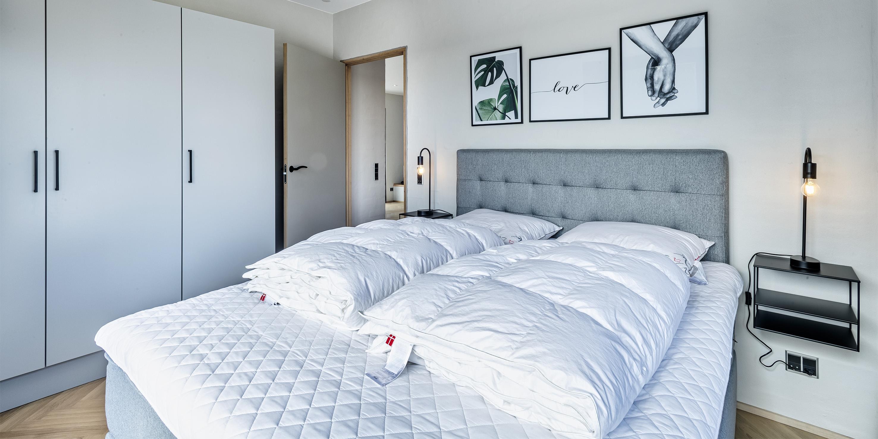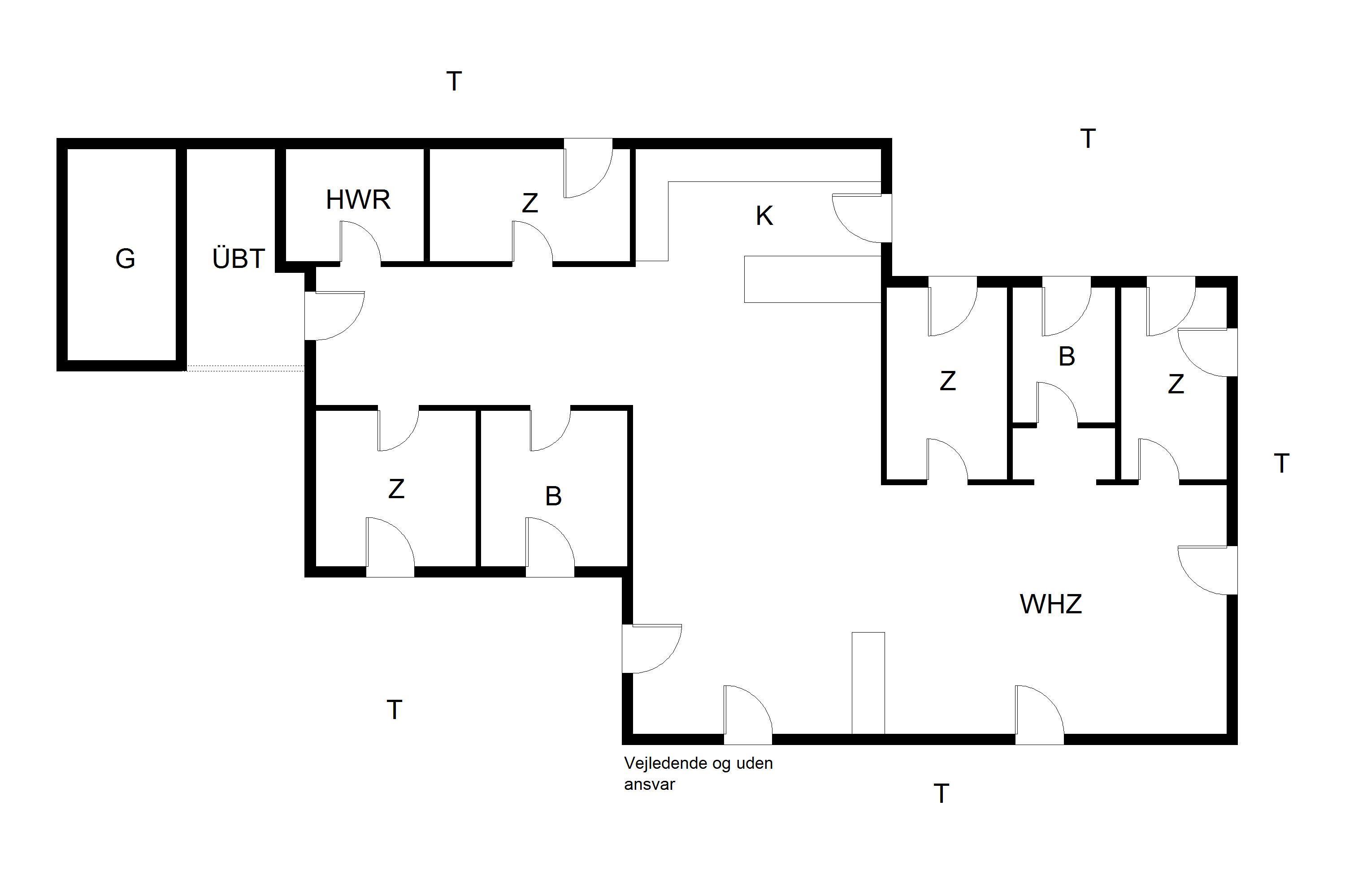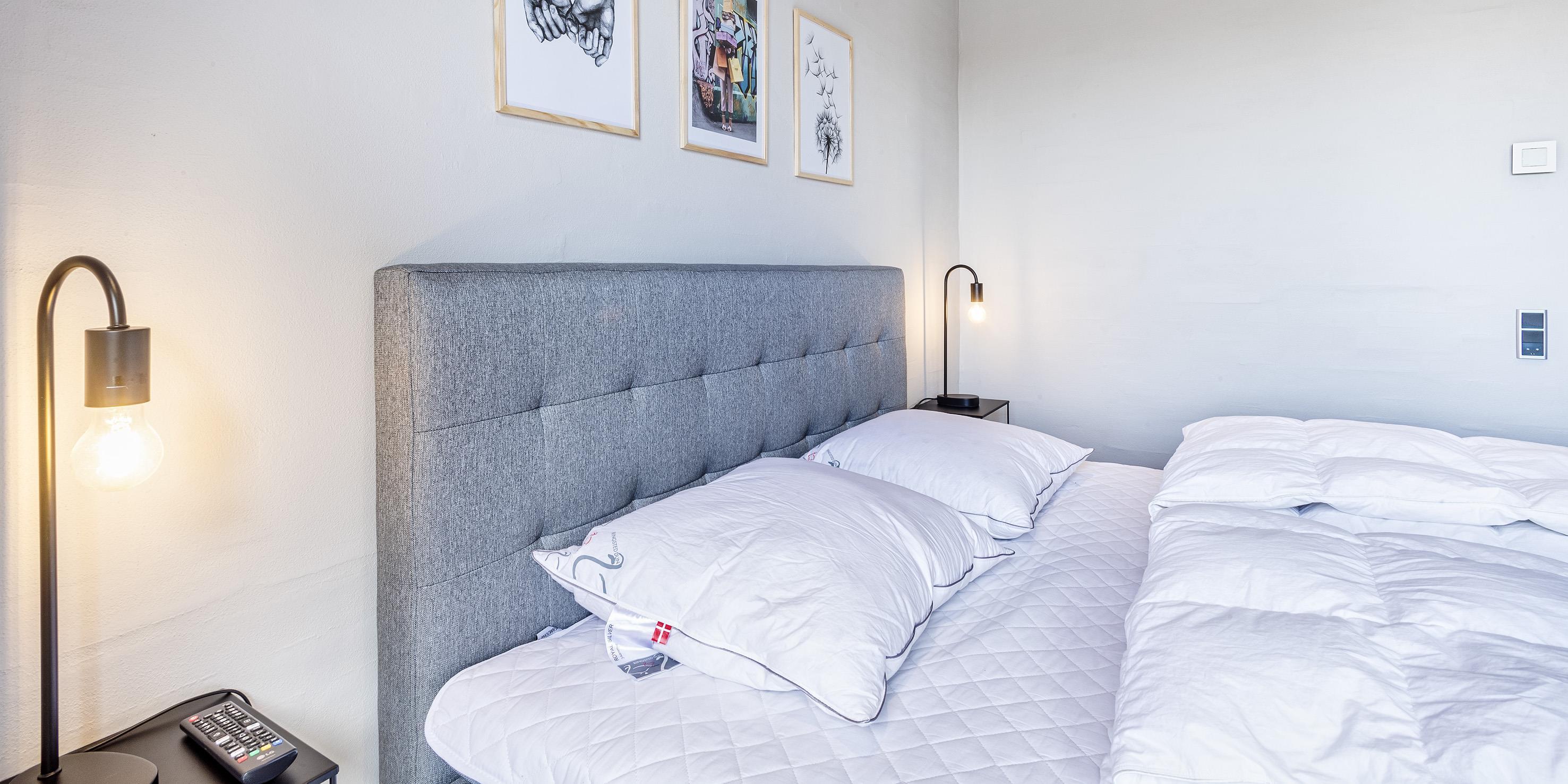 Herfra kommer man ind til entreen. Til venstre for hoveddøren forefindes der et stort bryggers med vaskemaskine og tørretumbler, god garderobeplads og plads til ekstra opbevaring. 2 store soveværelser på hver side af entreen, med dobbelt luksussenge, dobbelt garderobeskabe og udgang til terrasse. Et af soveværelserne er med Smart-TV. Wellness badeværelse med marmorfliser, stort vaskearrangement, garderobeskabe, væghængt toilet, stor bruseniche med glasvæg. Fra entréen kommer man over i det det åbne køkkenalrum, som går på tværs af huset. Fra køkkenet er der udgang til syd-østvendt terrasse hvor morgenmaden kan nydes over solopgangen med panoramablik over skovområde. Endvidere byder køkkenalrummet på et stort rundt spisebord, hvorfra udsigten kan nydes fra de store panoramavinduer og aftensmåltidet kan indtages med varmen fra den gaspejsen. Fra alrummet kommer man over i opholdsrummet, hvor varmen fra den gennemgående gaspejs kan nydes fra hyggekrogen ved pejsebænken (ekstra udgift til gas. Gasflasker kan ombyttes mod lille gebyr ved købmanden). Smart-Tv med danske og udenlandske kanaler. Trådløs internet. Værelsesfløj med endnu 2 store soveværelser med dobbelt luksussenge, dobbelt garderobeskabe, udgang til terrasse. Det ene soveværelse har panoramavinduer mod det syd-/østlige hjørne, hvor solopgangen kan følges fra sengen. Wellness badeværelse med marmorfliser, stort vaskearrangement, garderobeskabe, væghængt toilet, stor bruseniche og udgang til terrassen.