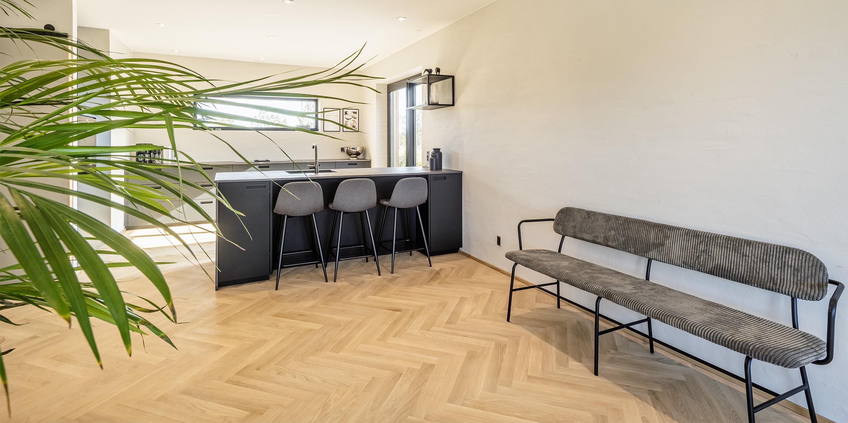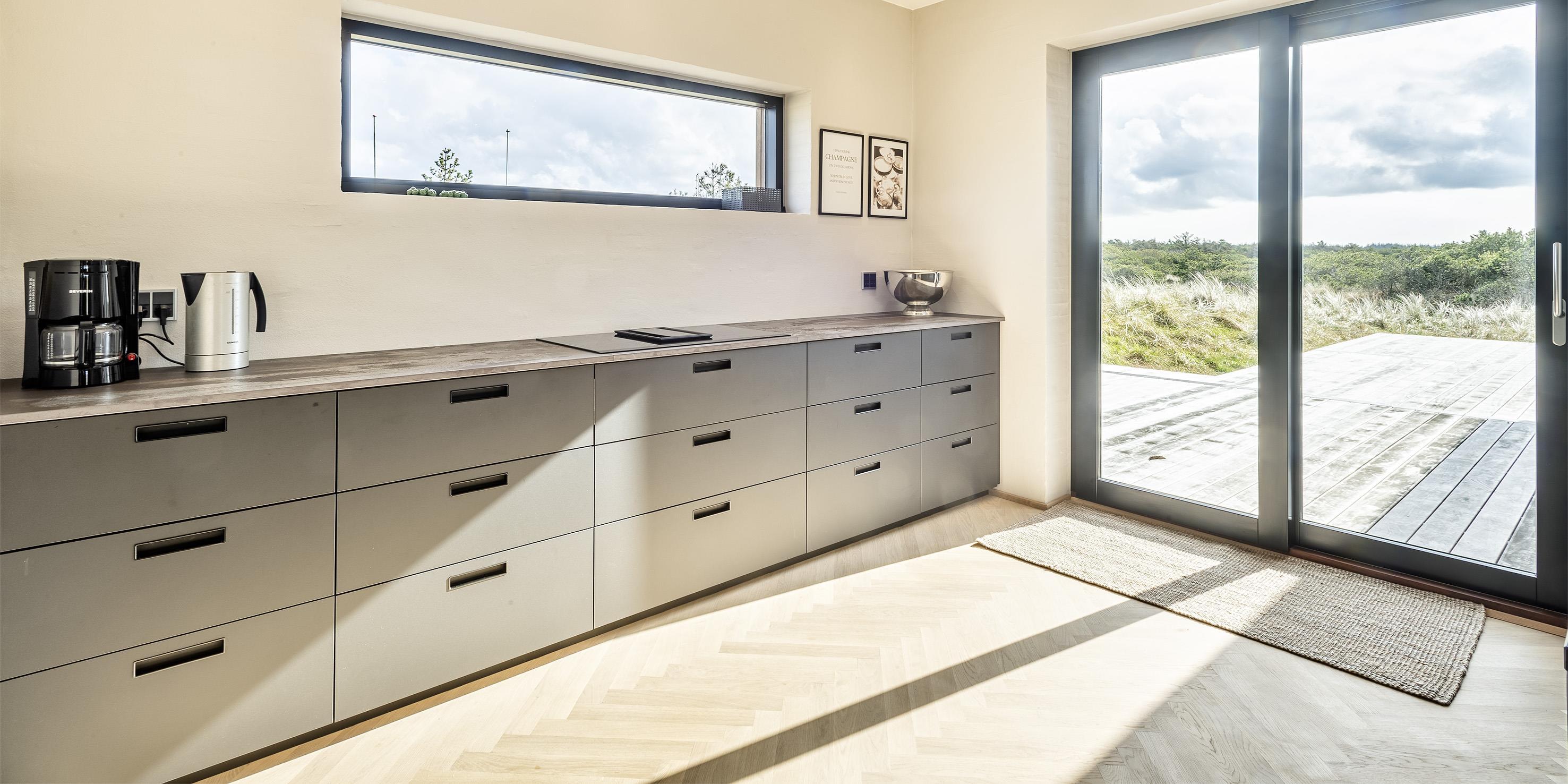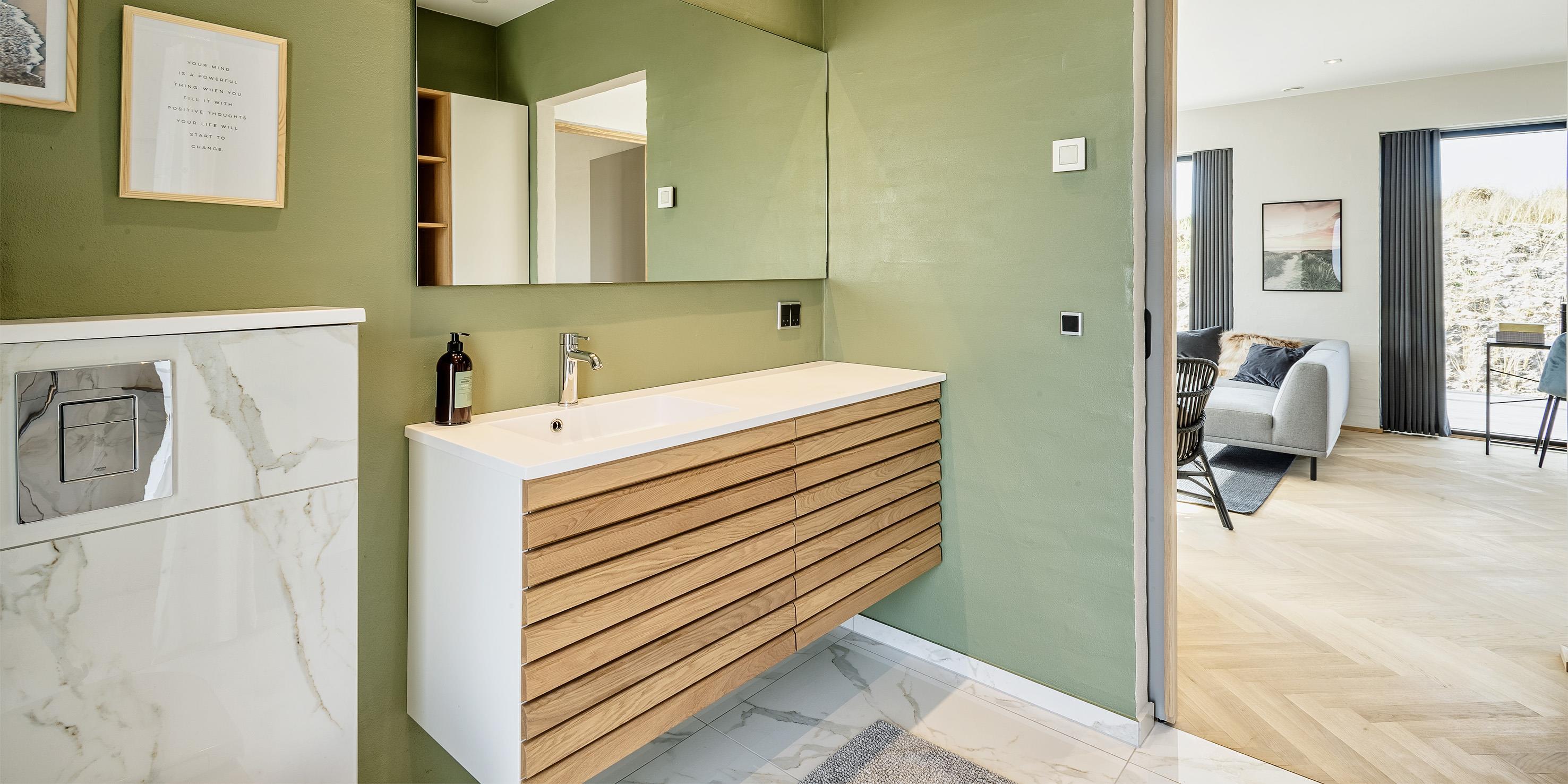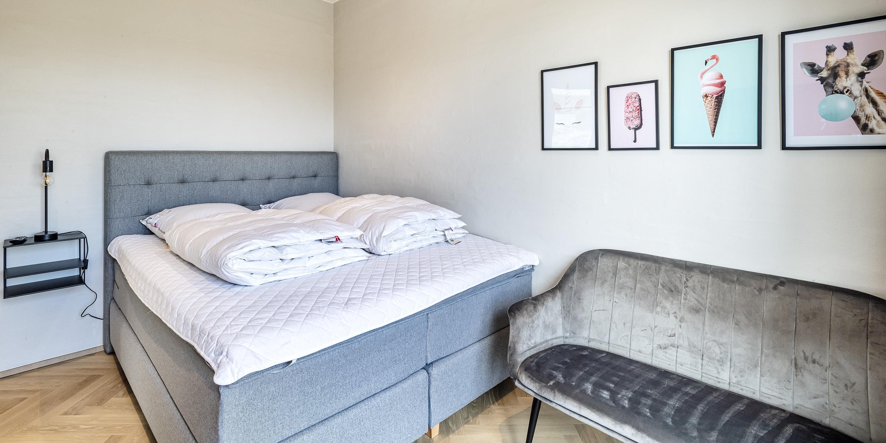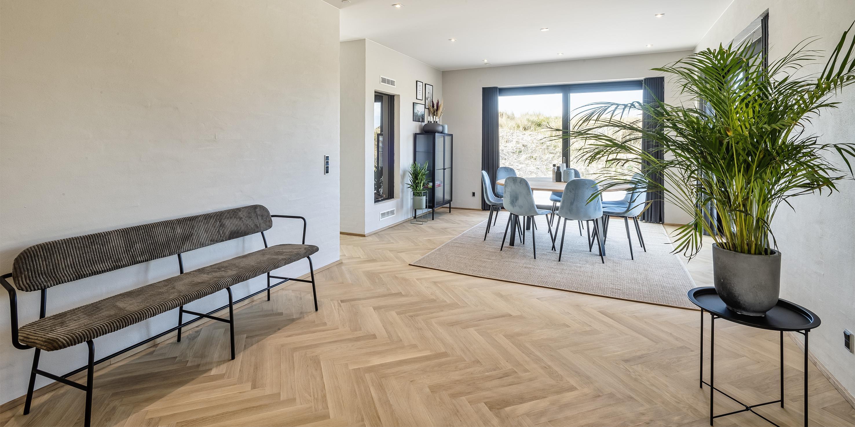 Herfra kommer man ind til entreen. Til venstre for hoveddøren forefindes der et stort bryggers med vaskemaskine og tørretumbler, god garderobeplads og plads til ekstra opbevaring. 2 store soveværelser på hver side af entreen, med dobbelt luksussenge, dobbelt garderobeskabe og udgang til terrasse. Et af soveværelserne er med Smart-TV. Wellness badeværelse med marmorfliser, stort vaskearrangement, garderobeskabe, væghængt toilet, stor bruseniche med glasvæg. Fra entréen kommer man over i det det åbne køkkenalrum, som går på tværs af huset. Fra køkkenet er der udgang til syd-østvendt terrasse hvor morgenmaden kan nydes over solopgangen med panoramablik over skovområde. Endvidere byder køkkenalrummet på et stort rundt spisebord, hvorfra udsigten kan nydes fra de store panoramavinduer og aftensmåltidet kan indtages med varmen fra den gaspejsen. Fra alrummet kommer man over i opholdsrummet, hvor varmen fra den gennemgående gaspejs kan nydes fra hyggekrogen ved pejsebænken (ekstra udgift til gas. Gasflasker kan ombyttes mod lille gebyr ved købmanden). Smart-Tv med danske og udenlandske kanaler. Trådløs internet. Værelsesfløj med endnu 2 store soveværelser med dobbelt luksussenge, dobbelt garderobeskabe, udgang til terrasse. Det ene soveværelse har panoramavinduer mod det syd-/østlige hjørne, hvor solopgangen kan følges fra sengen. Wellness badeværelse med marmorfliser, stort vaskearrangement, garderobeskabe, væghængt toilet, stor bruseniche og udgang til terrassen.