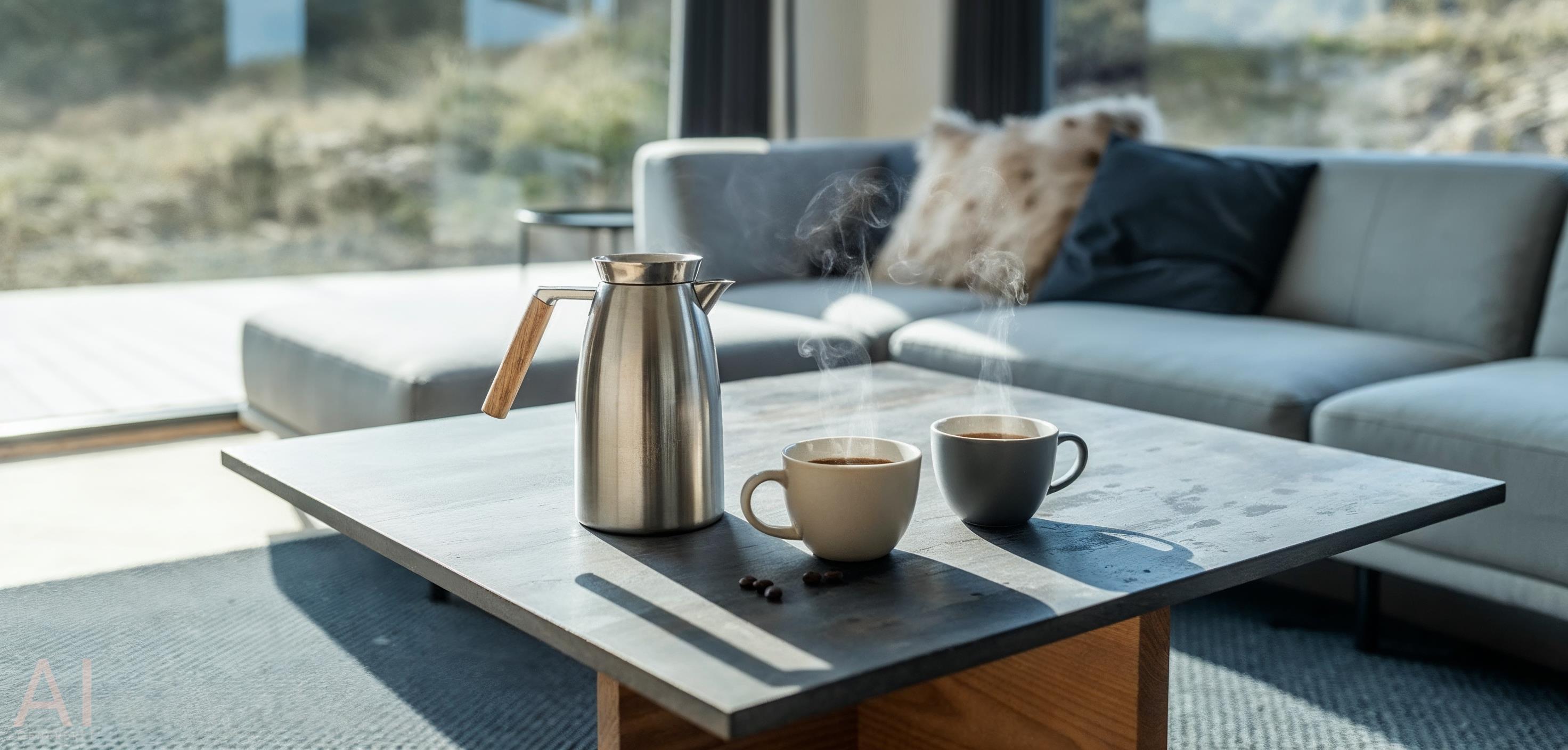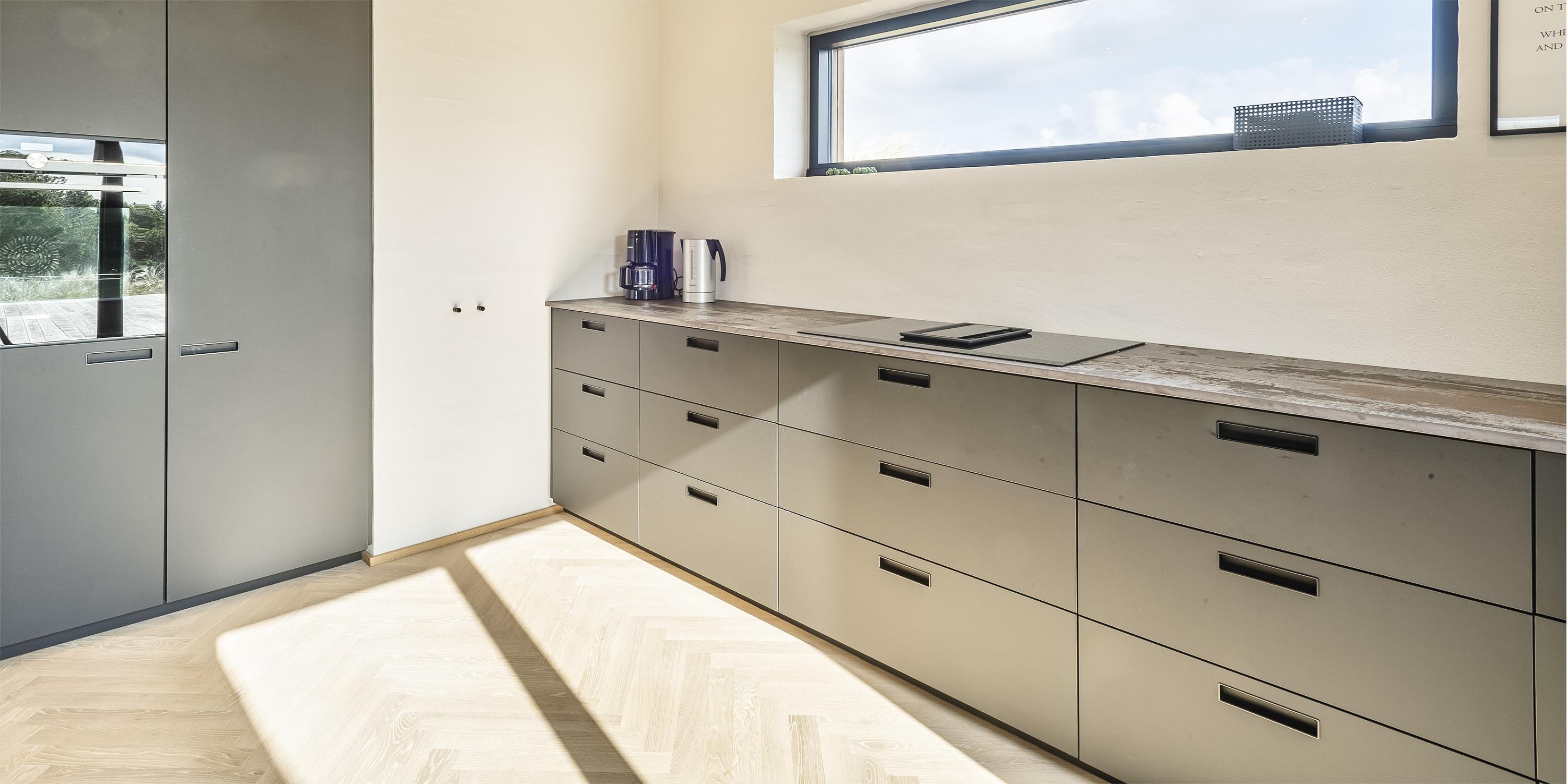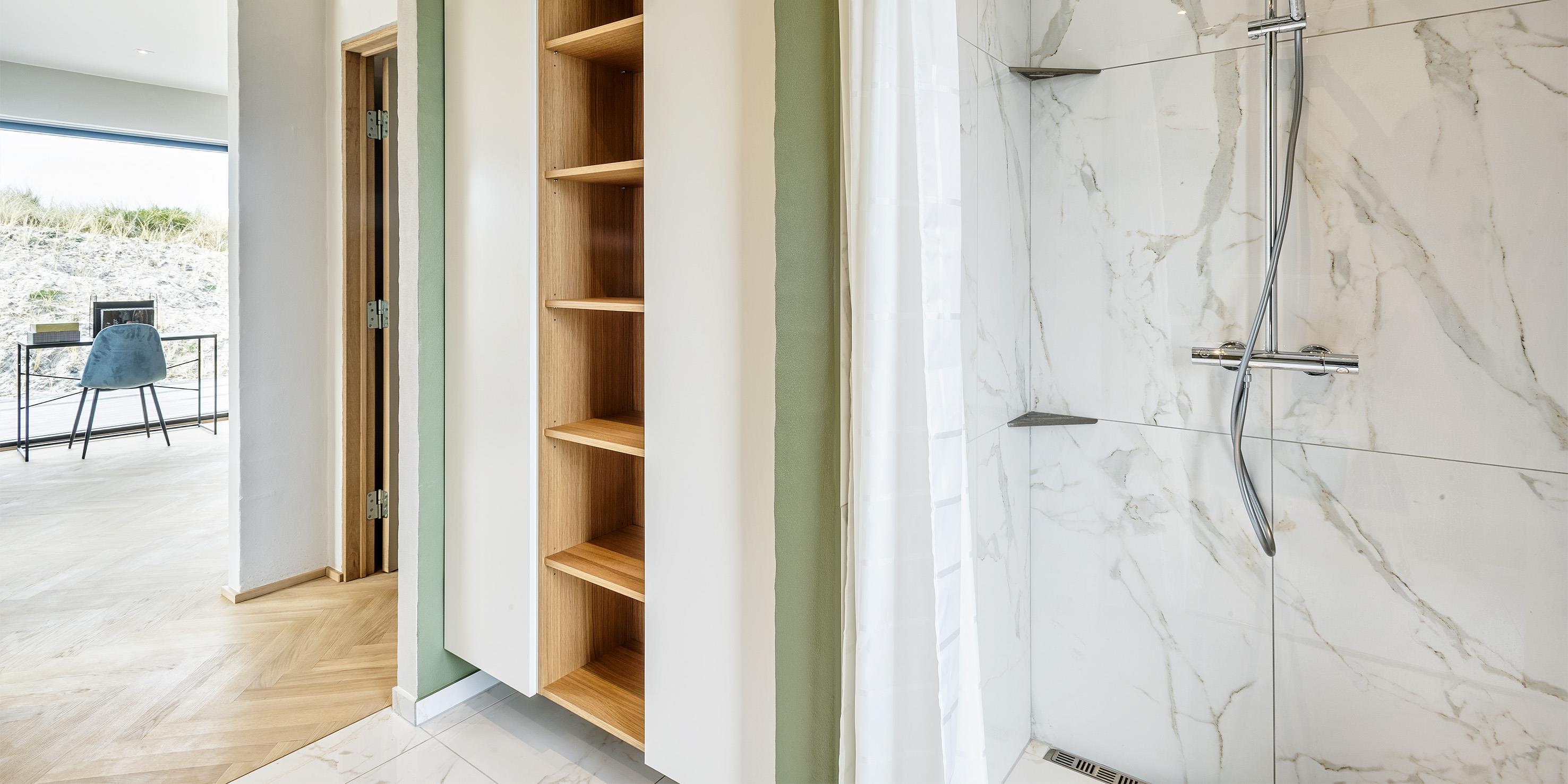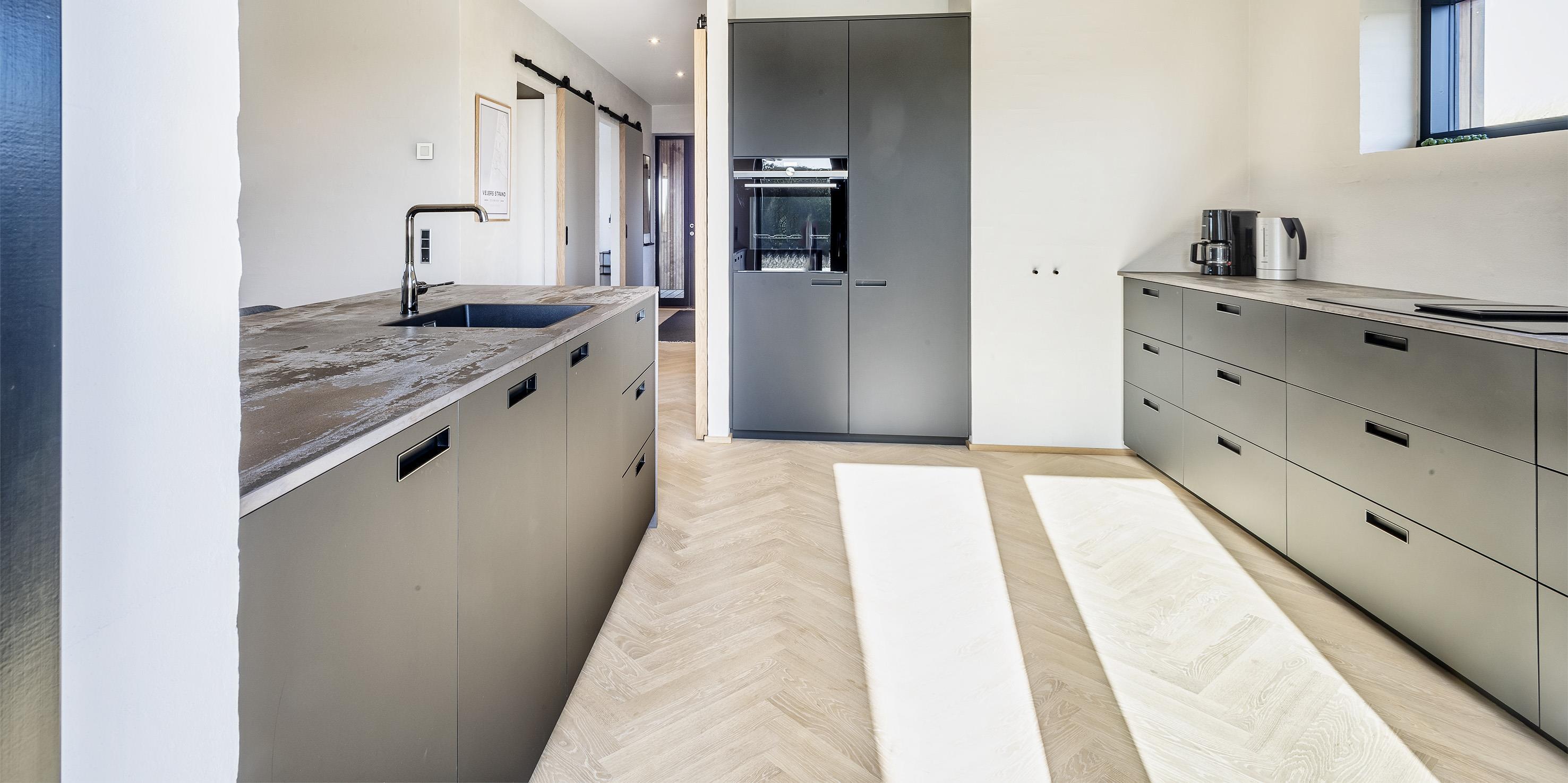 Herfra kommer man ind til entreen. Til venstre for hoveddøren forefindes der et stort bryggers med vaskemaskine og tørretumbler, god garderobeplads og plads til ekstra opbevaring. 2 store soveværelser på hver side af entreen, med dobbelt luksussenge, dobbelt garderobeskabe og udgang til terrasse. Et af soveværelserne er med Smart-TV. Wellness badeværelse med marmorfliser, stort vaskearrangement, garderobeskabe, væghængt toilet, stor bruseniche med glasvæg. Fra entréen kommer man over i det det åbne køkkenalrum, som går på tværs af huset. Fra køkkenet er der udgang til syd-østvendt terrasse hvor morgenmaden kan nydes over solopgangen med panoramablik over skovområde. Endvidere byder køkkenalrummet på et stort rundt spisebord, hvorfra udsigten kan nydes fra de store panoramavinduer og aftensmåltidet kan indtages med varmen fra den gaspejsen. Fra alrummet kommer man over i opholdsrummet, hvor varmen fra den gennemgående gaspejs kan nydes fra hyggekrogen ved pejsebænken (ekstra udgift til gas. Gasflasker kan ombyttes mod lille gebyr ved købmanden). Smart-Tv med danske og udenlandske kanaler. Trådløs internet. Værelsesfløj med endnu 2 store soveværelser med dobbelt luksussenge, dobbelt garderobeskabe, udgang til terrasse. Det ene soveværelse har panoramavinduer mod det syd-/østlige hjørne, hvor solopgangen kan følges fra sengen. Wellness badeværelse med marmorfliser, stort vaskearrangement, garderobeskabe, væghængt toilet, stor bruseniche og udgang til terrassen.
