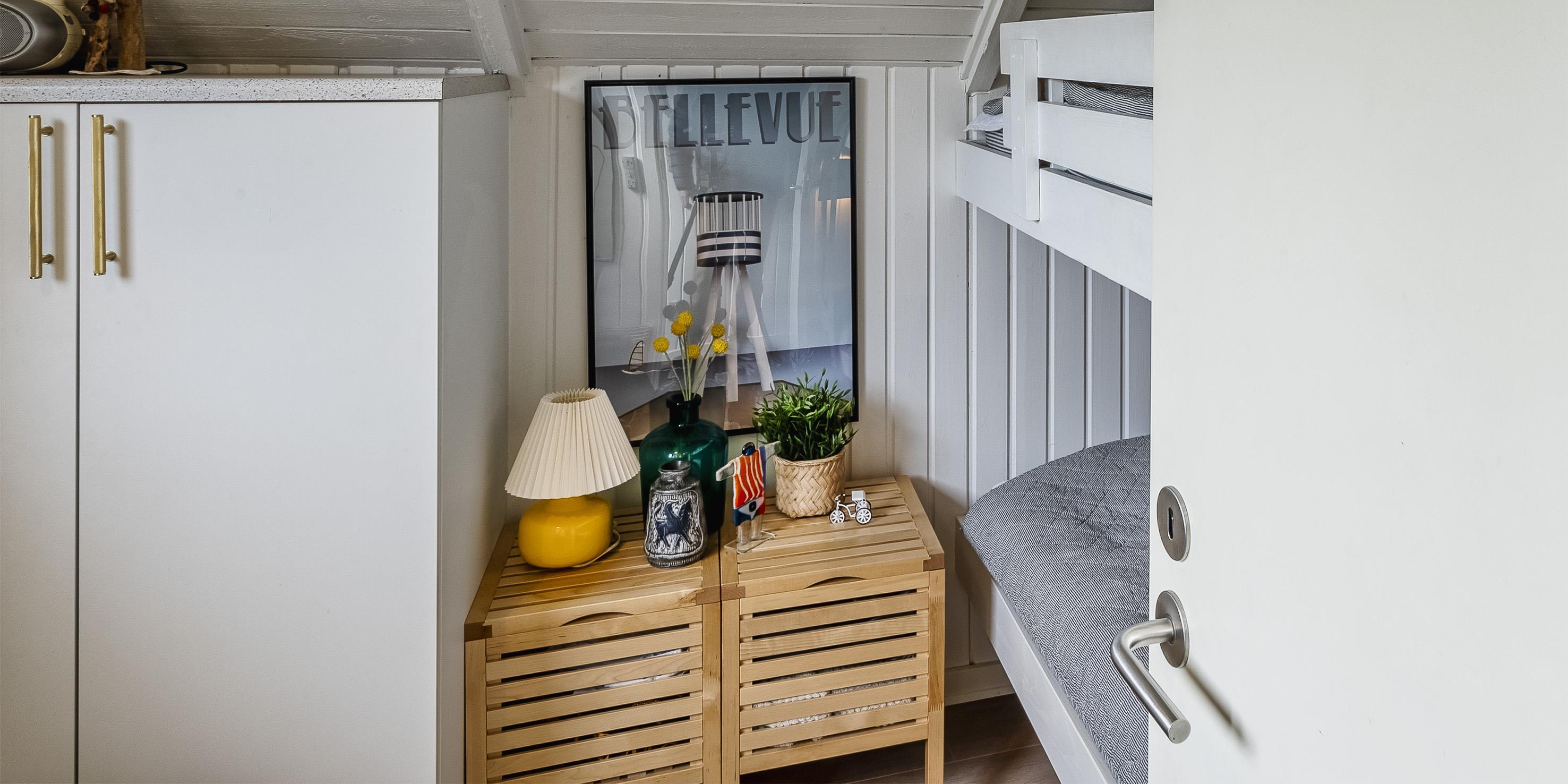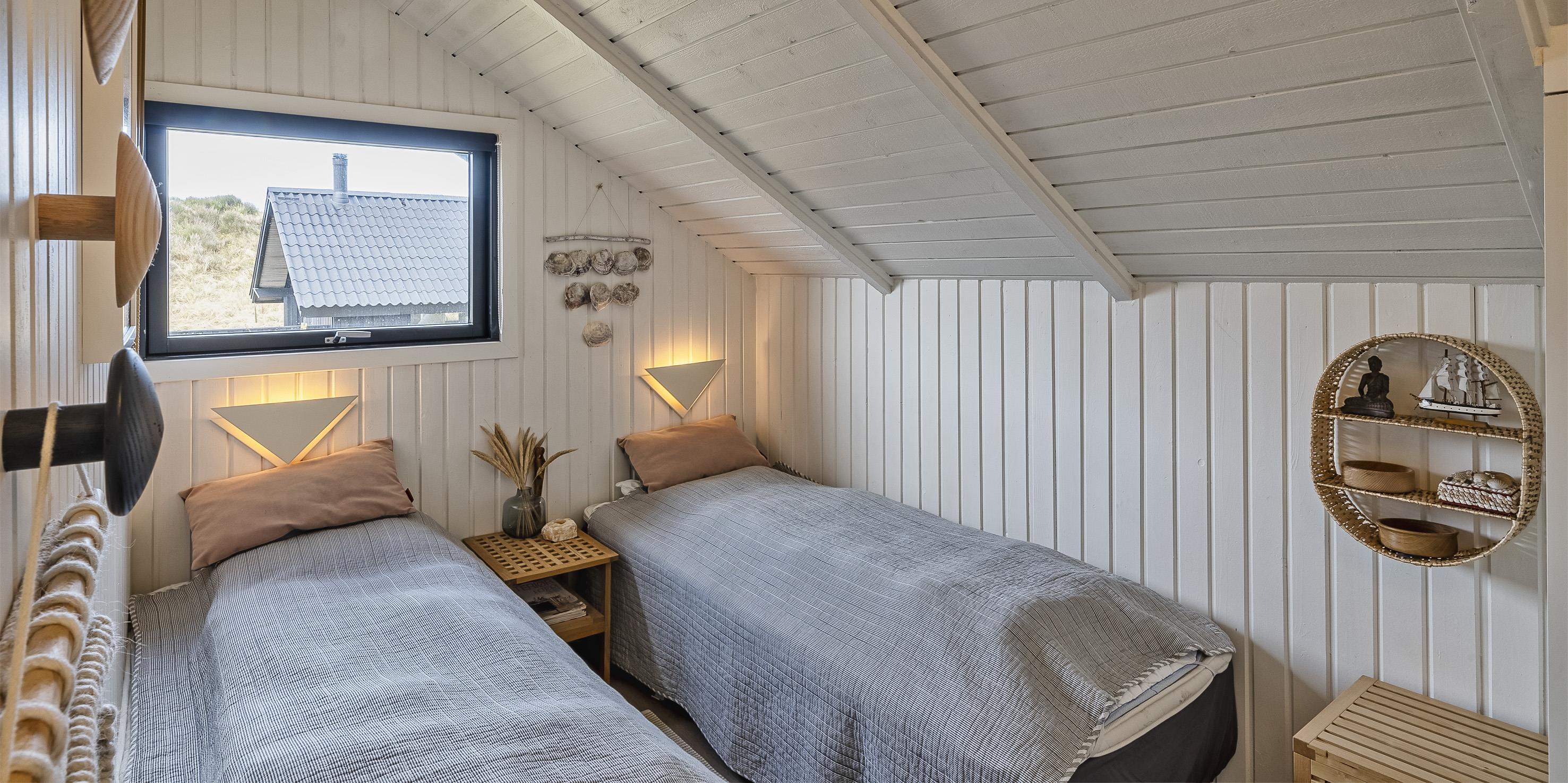 3 soveværelser. 2 med 2 enkeltsenge (á 90x200 cm). 1 med køjeseng.