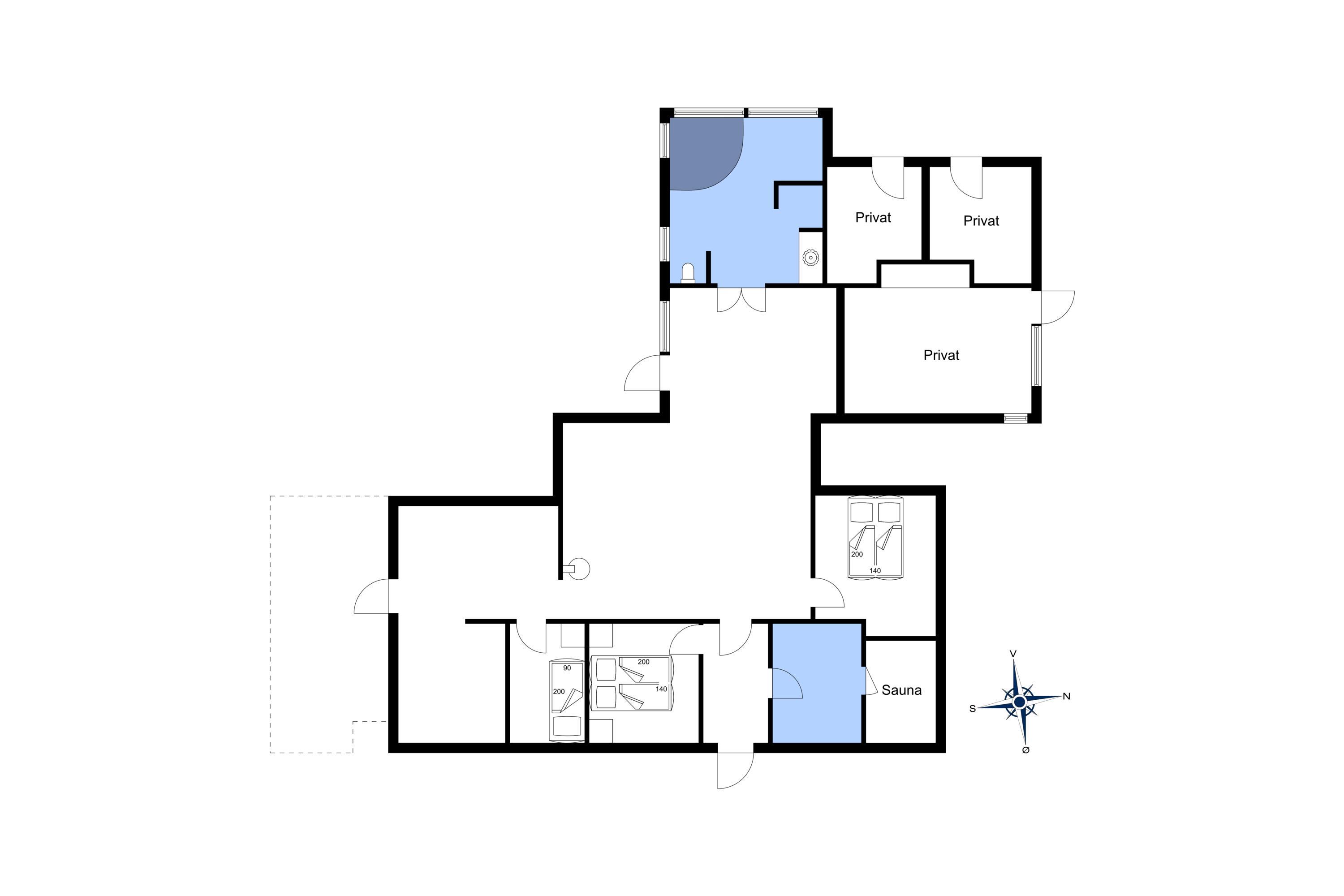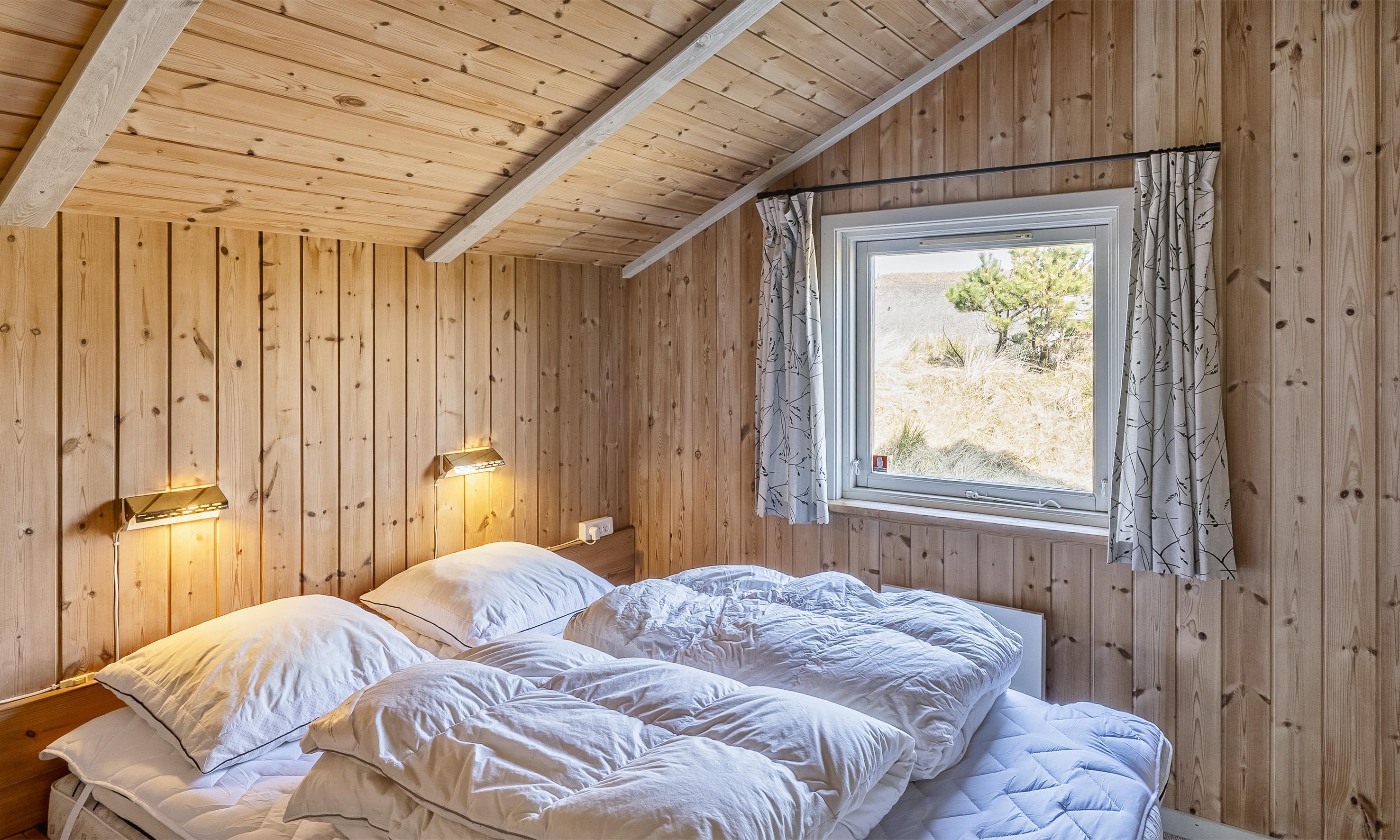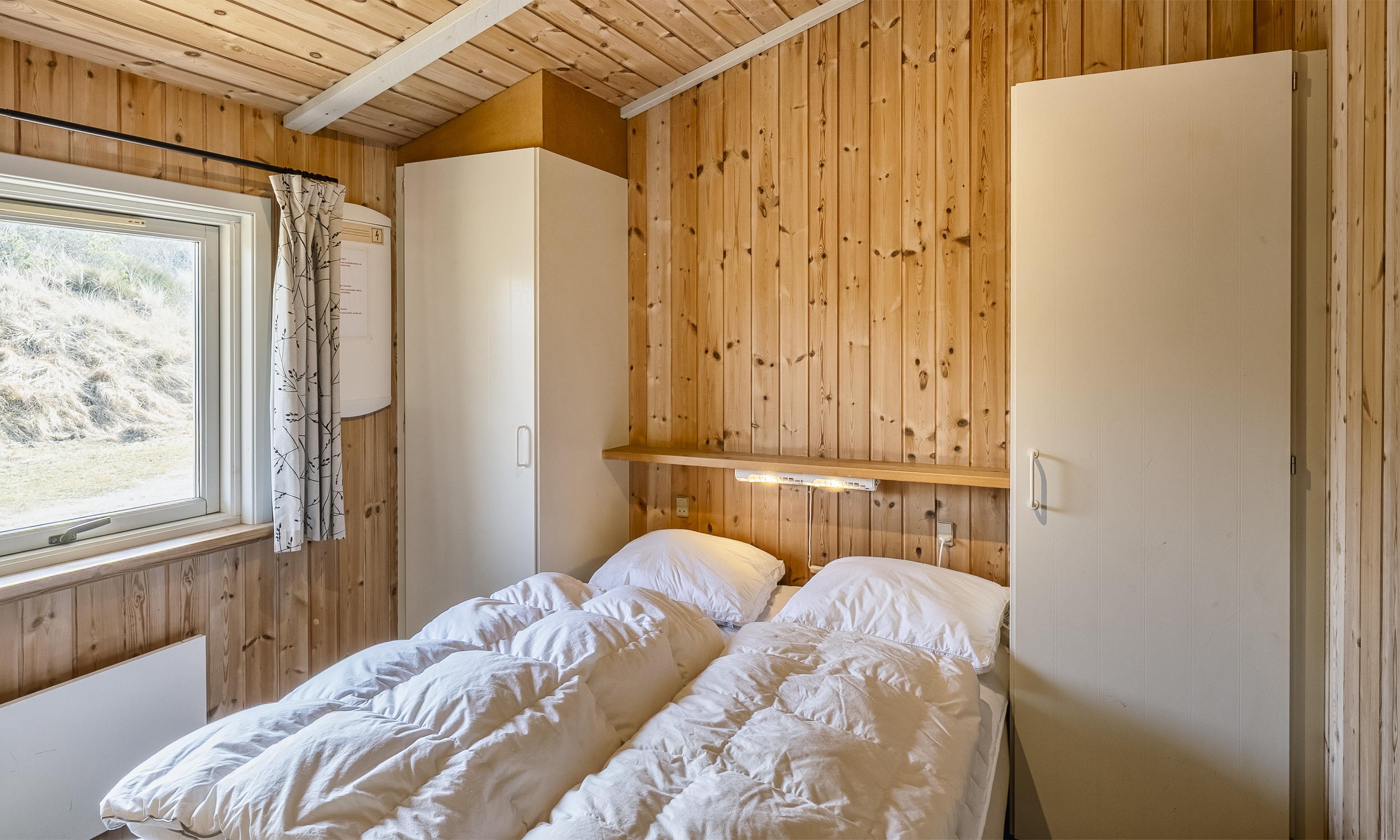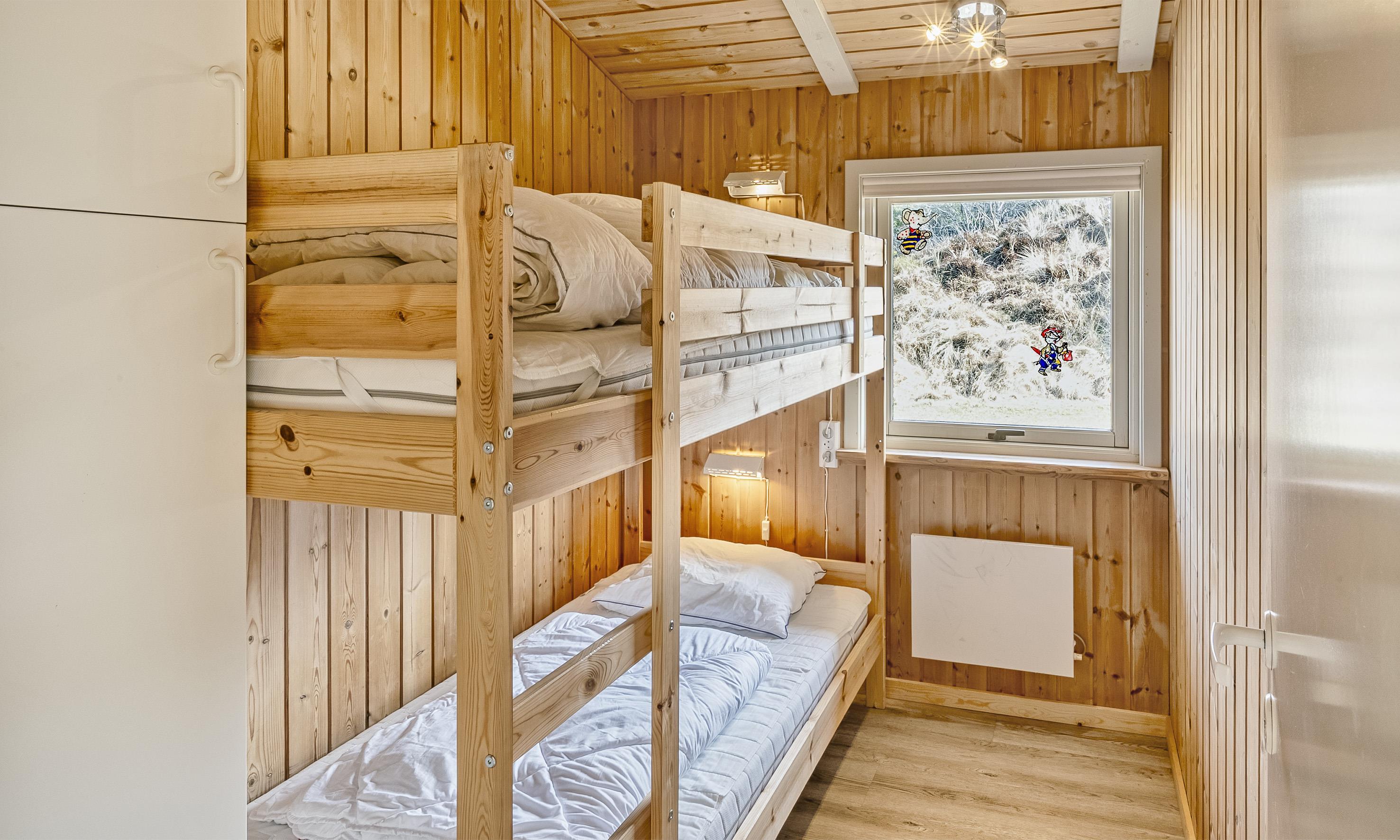 3 soveværelser. 2 med dobbeltseng 140x200 cm. 1 med køjeseng.