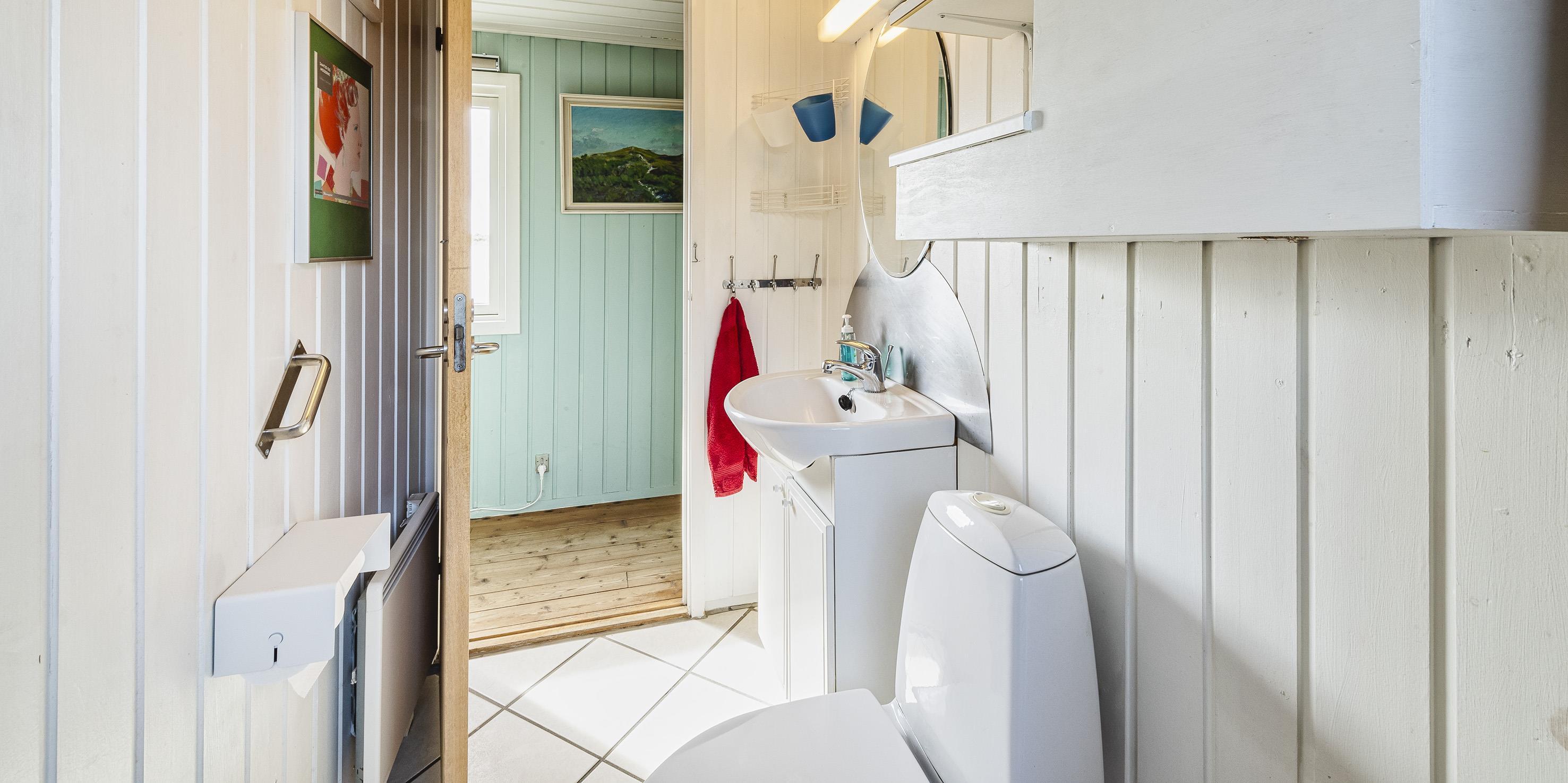 Bad med toilet, bruser og vask