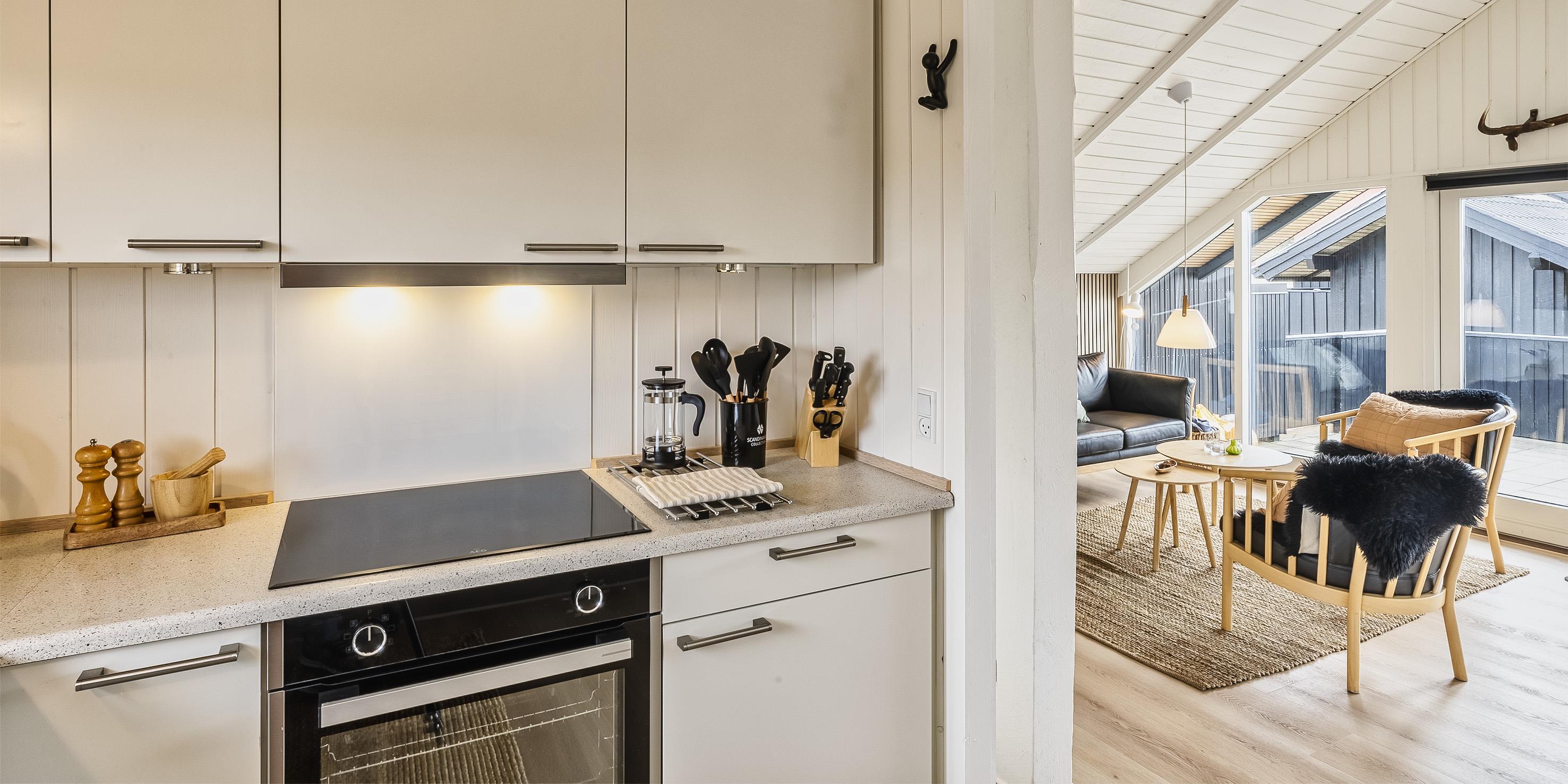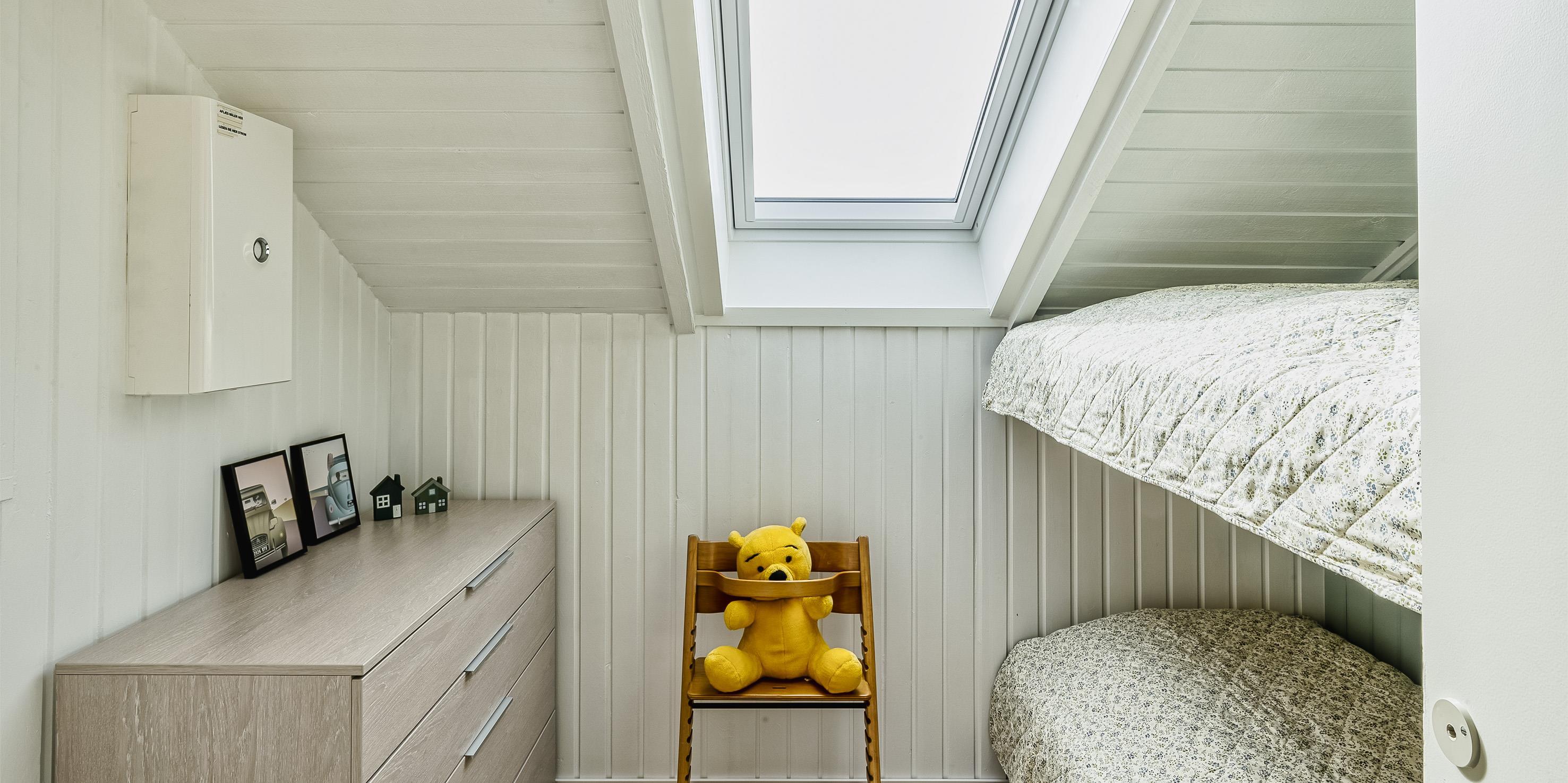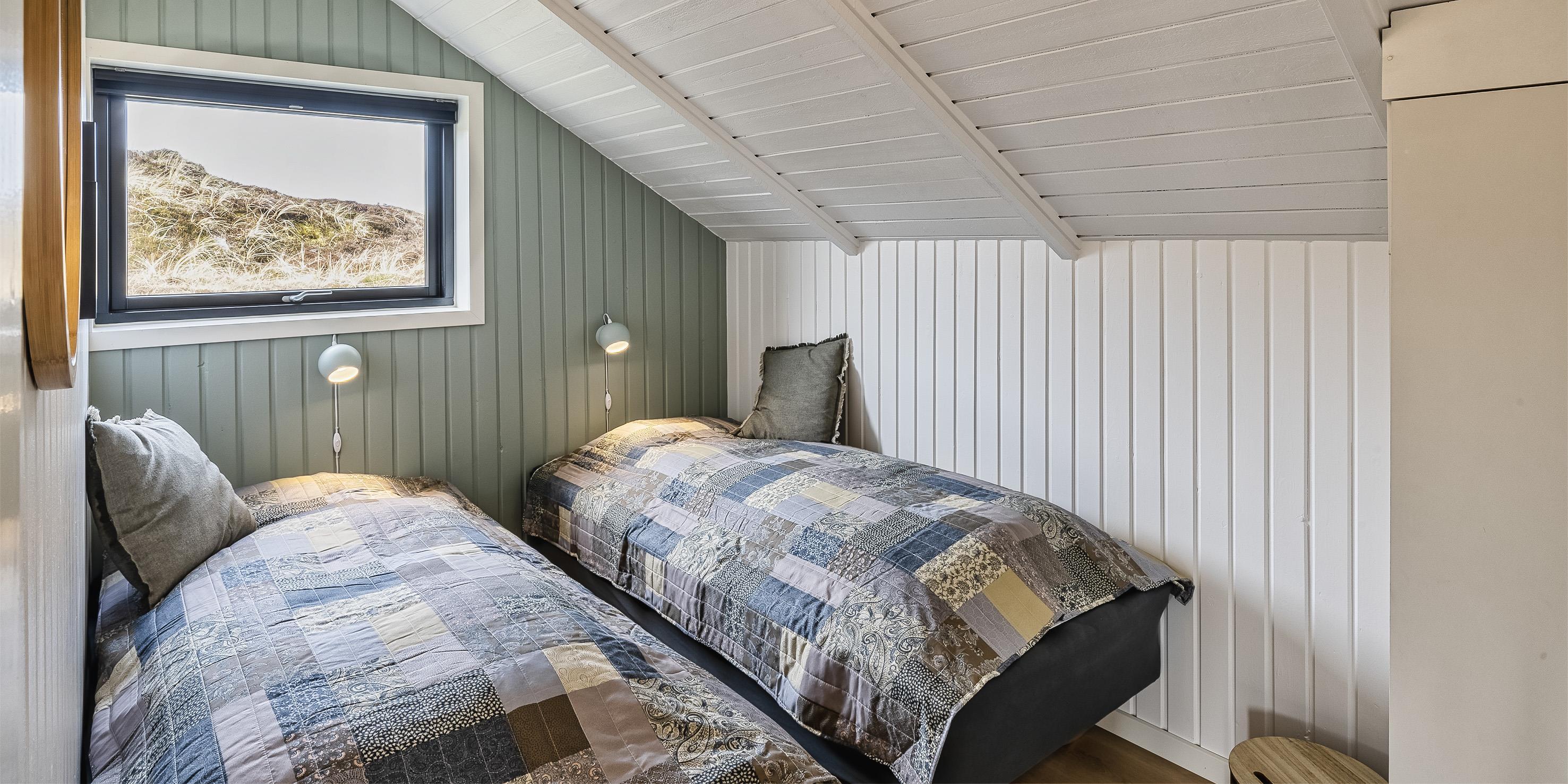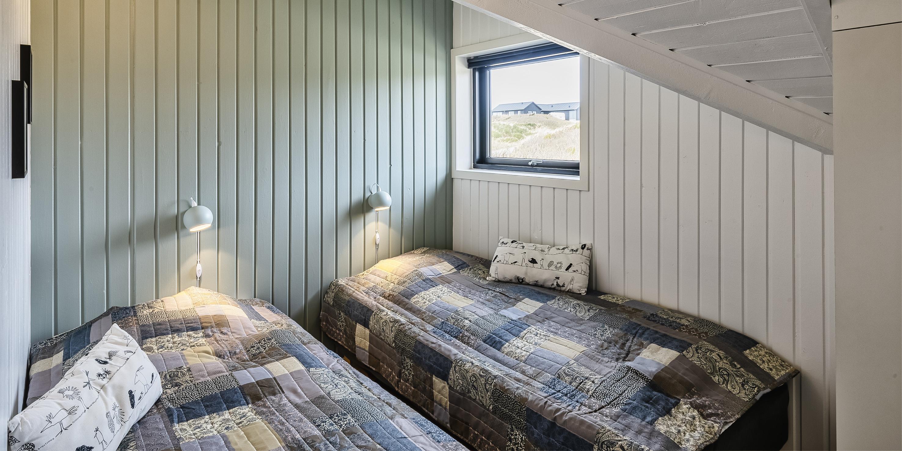 3 soveværelser. 1 med dobbeltseng 180x200 cm. 1 med 2 enkeltsenge (á 90x200 cm). 1 med køjeseng