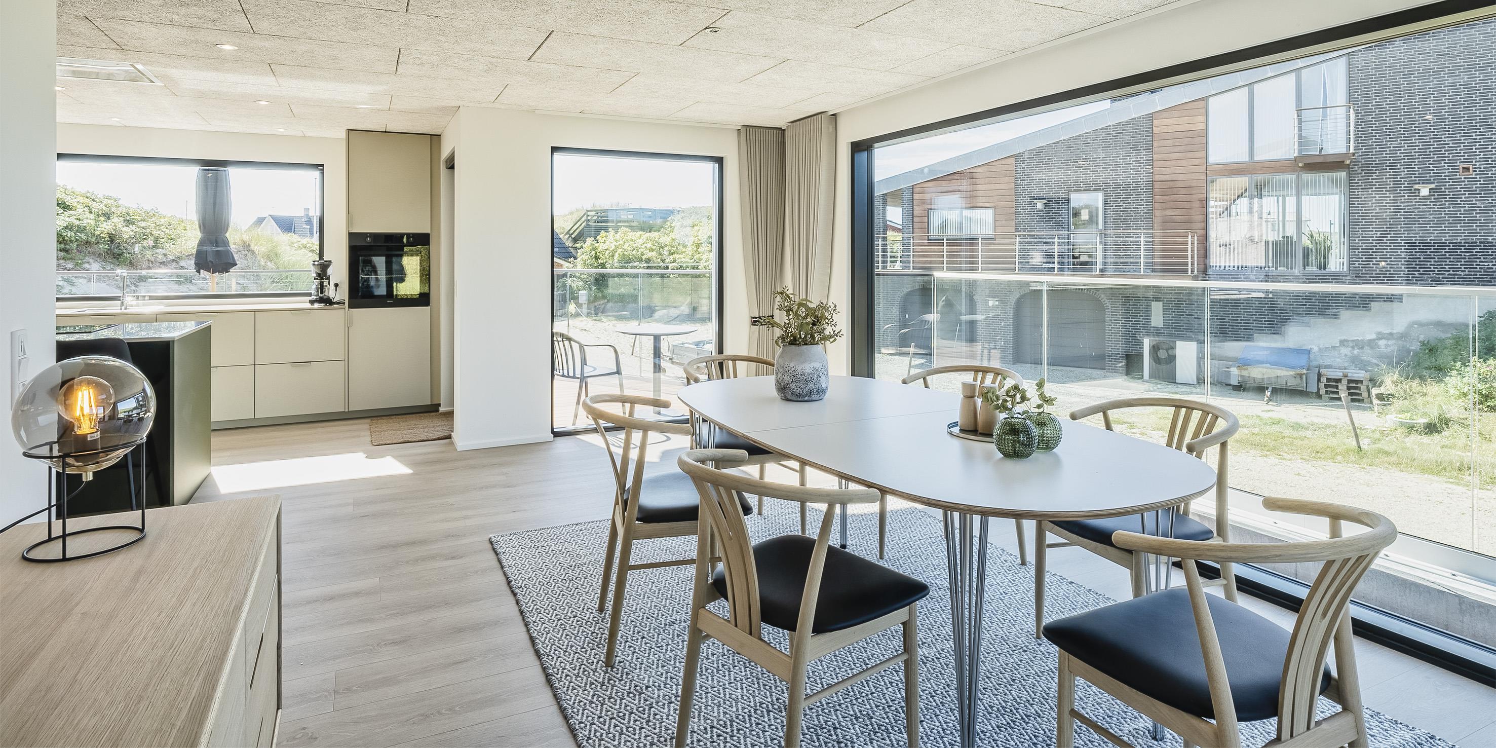 Sommerhuset byder på en skøn atmosfære i en moderne stil og med store panoramavinduer vendt mod havet. Der er hav kig fra første sal.