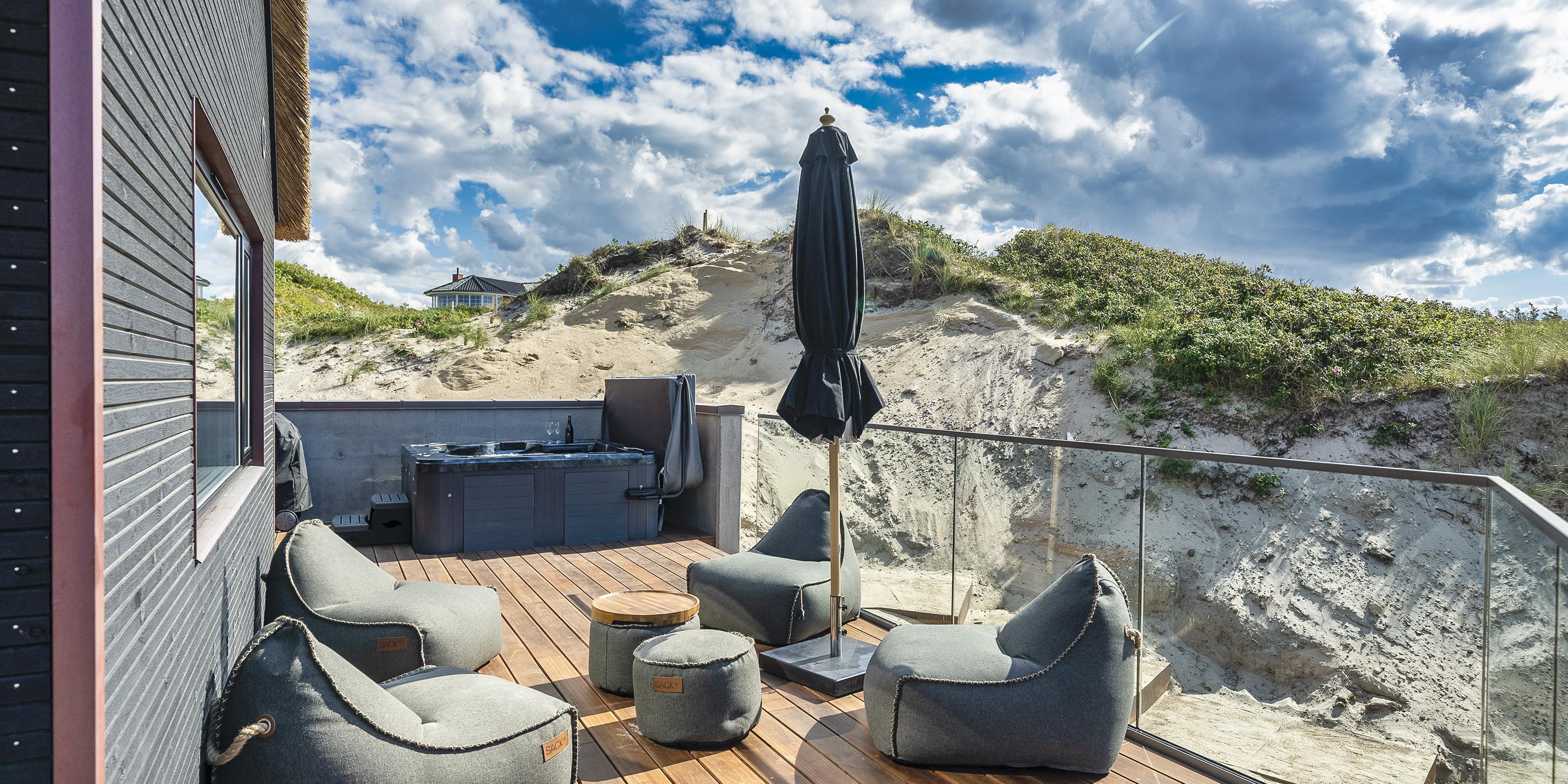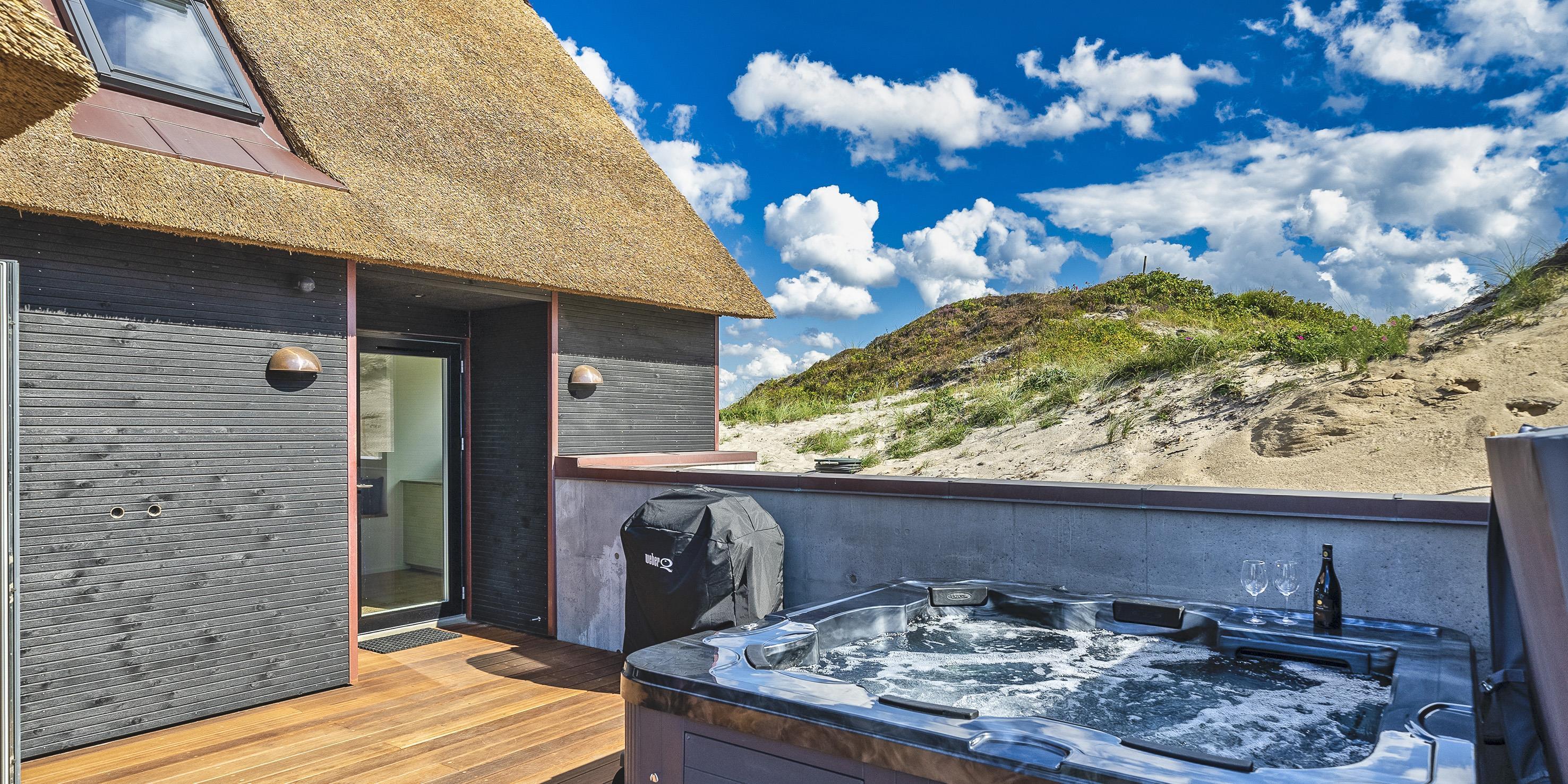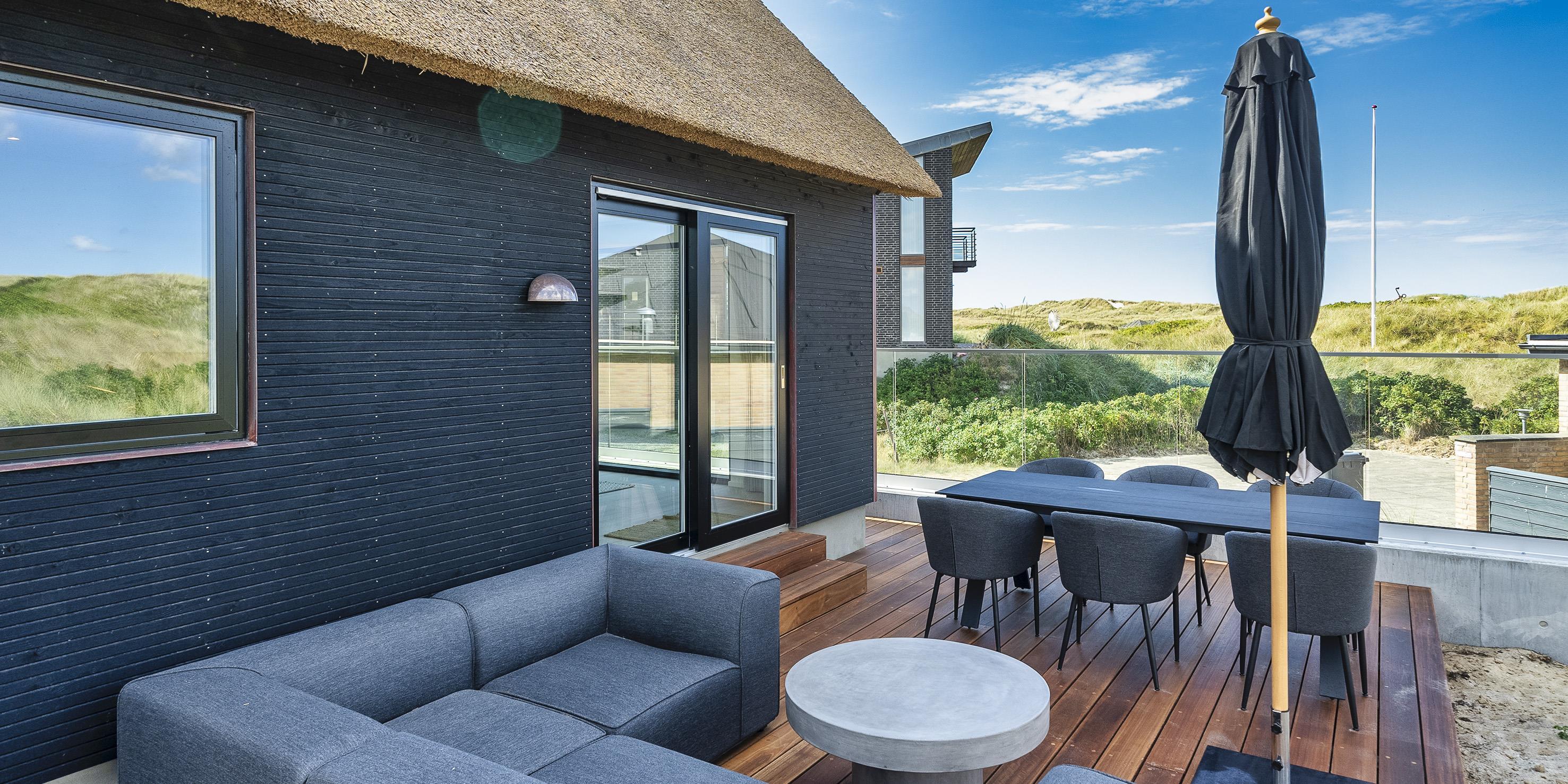 De udvendige faciliteter byder på flotte solnedgange, der kan nydes fra den store omkring liggende træterrasse. Sommerhuset ligger på en klitgrund ca. 100 meter fra stranden samt kort afstand til indkøb og restaurant.