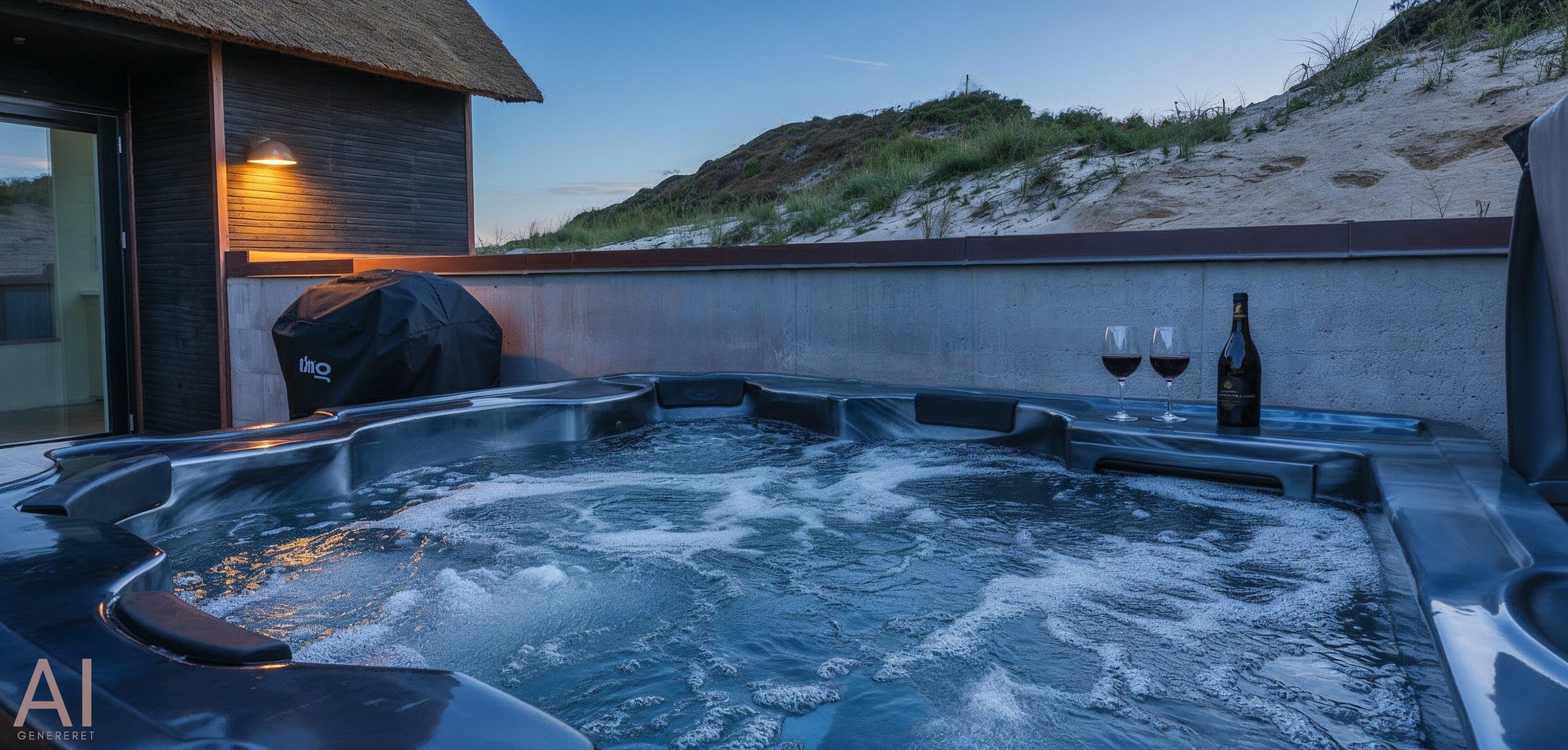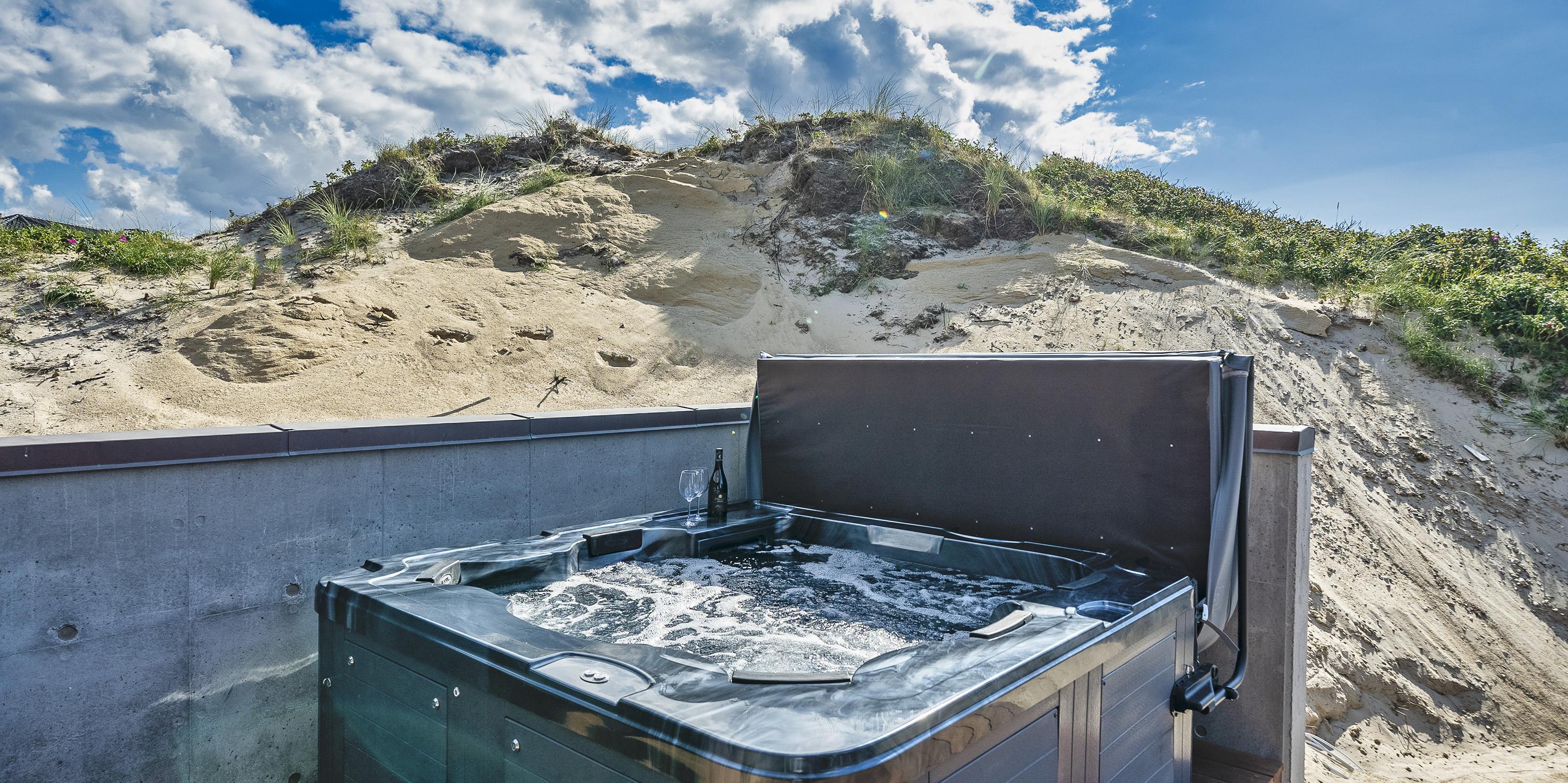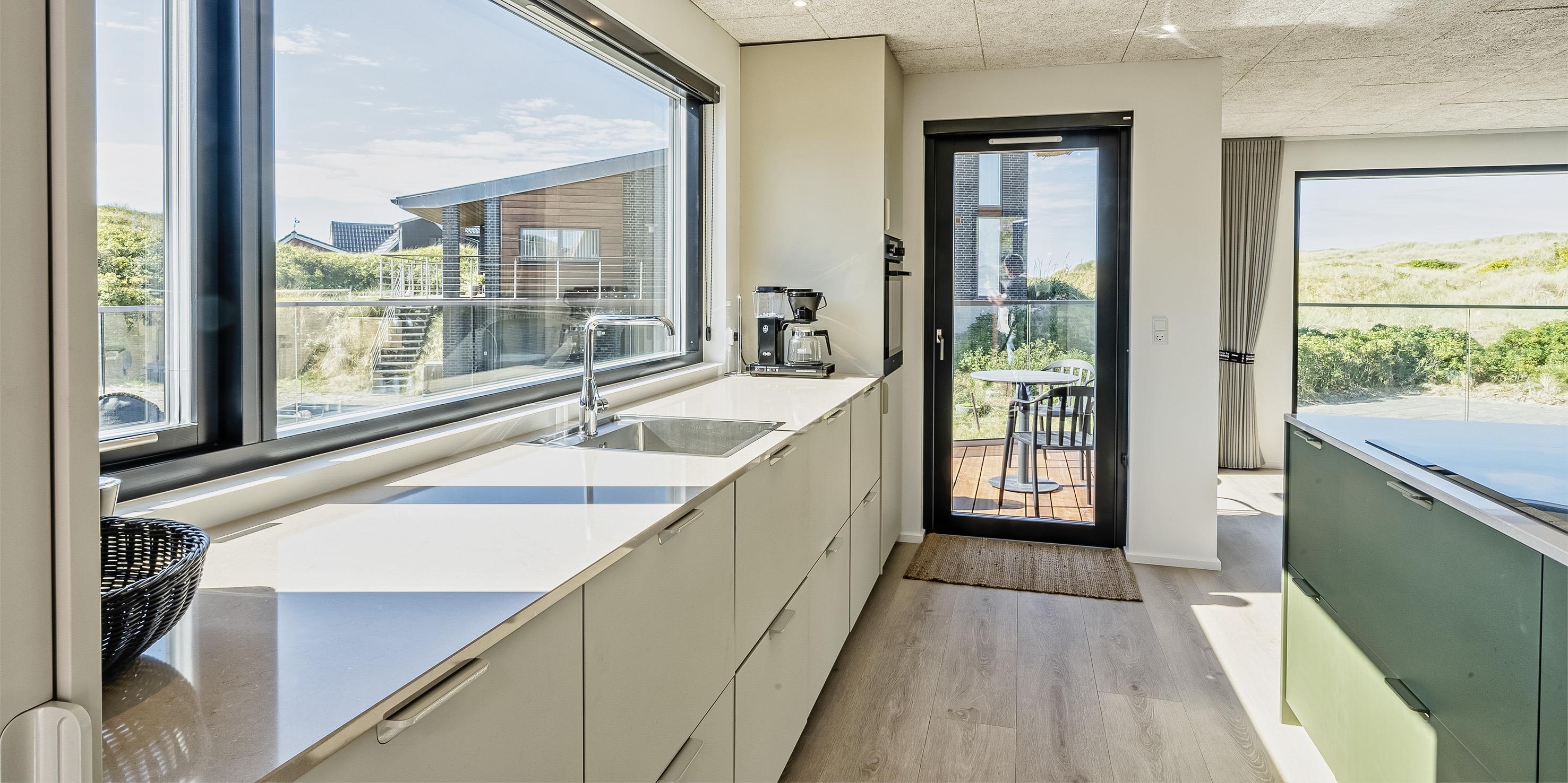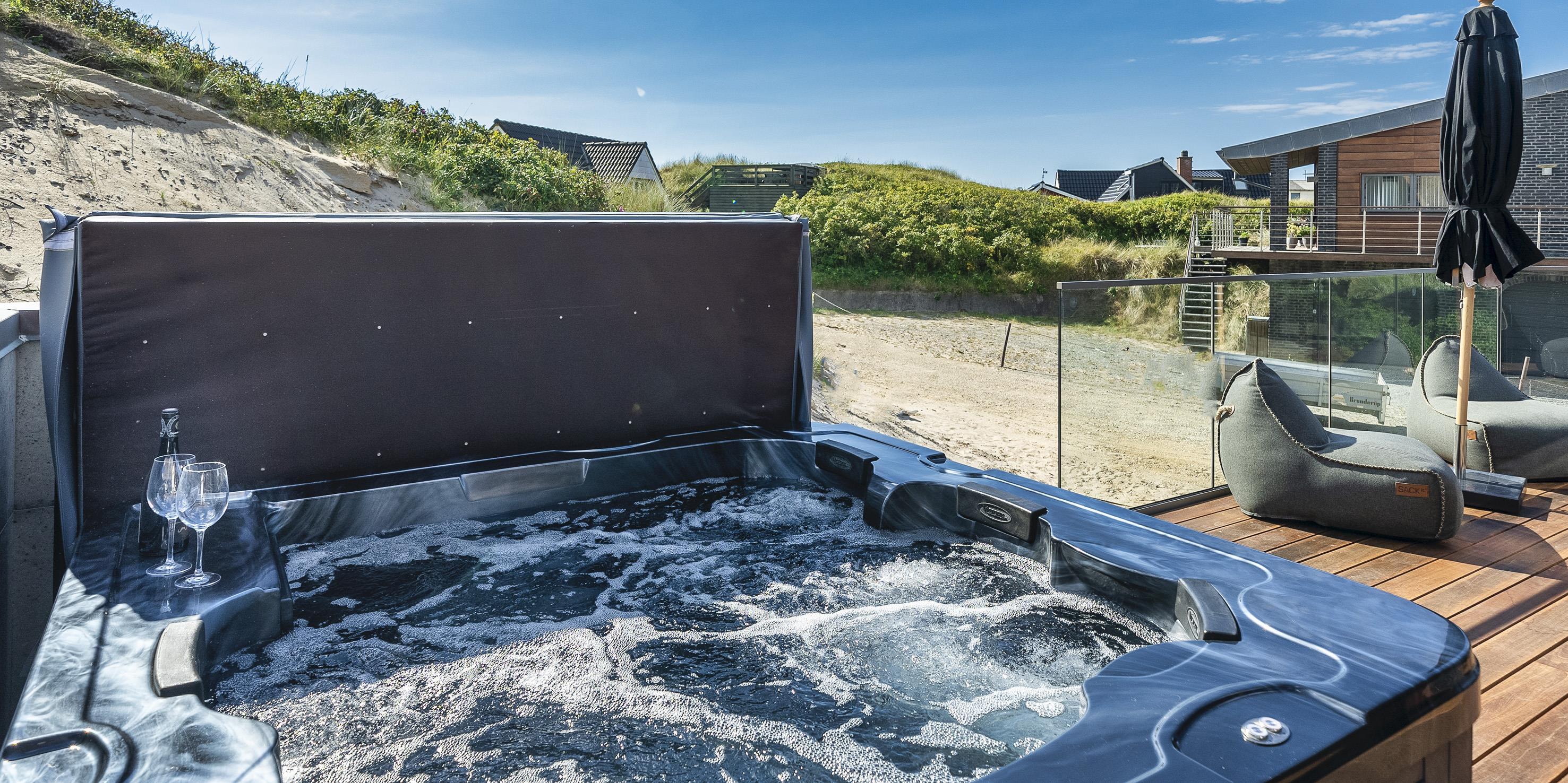 De udvendige faciliteter byder på flotte solnedgange, der kan nydes fra den store omkring liggende træterrasse. Sommerhuset ligger på en klitgrund ca. 100 meter fra stranden samt kort afstand til indkøb og restaurant.