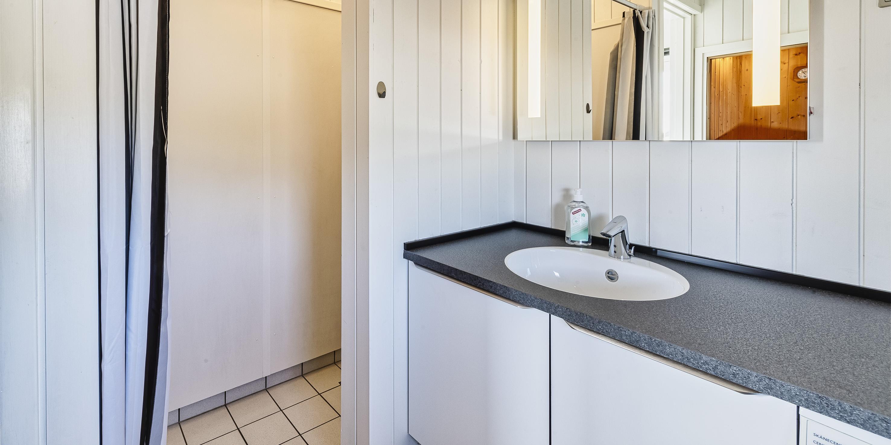 Bad med toilet, bruser og vask