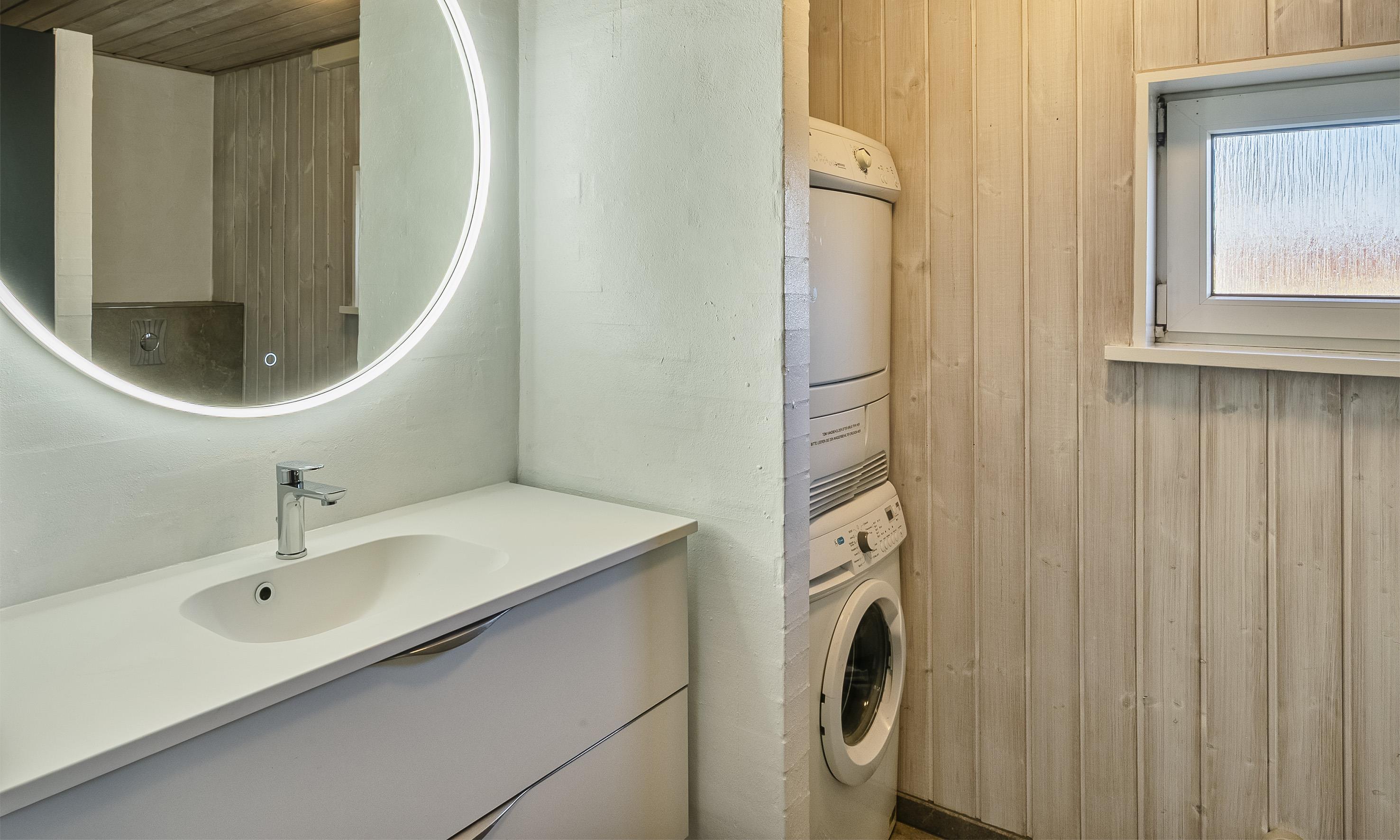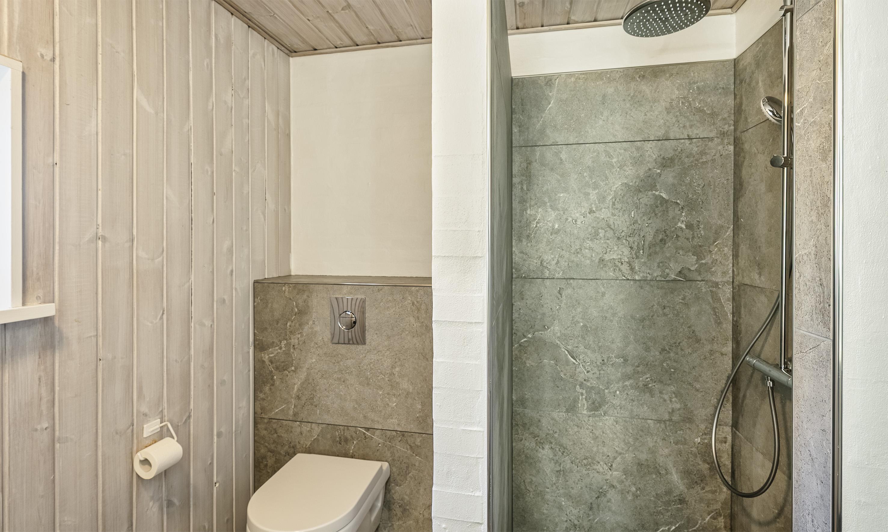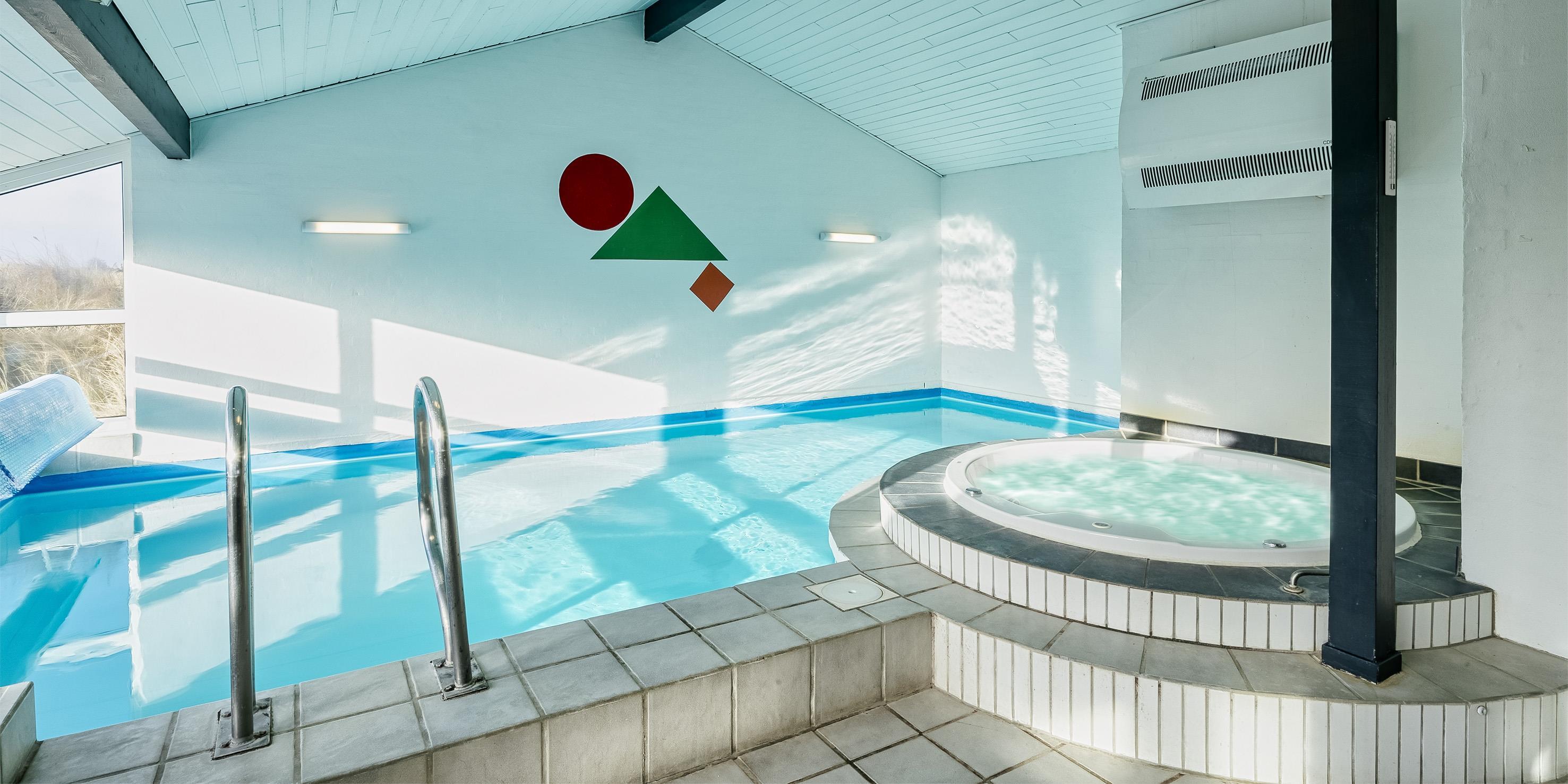 Sommerhuset: Entre med plads til garderoben. Huset råder over 2 dejlige badeværelser med gulvvarme. Det ene badeværelse har desuden tørretumbler og vaskemaskine mens det andet badeværelse er med sauna. Køkken i åben forbindelse med spiseplads og stue. Rummet er lyst og dejligt med et godt lysindfald samt indgang til pool området. Køkkenet fremstår med god komfort såsom opvaskemaskine, mikroovn, keramiske kogeplader, emhætte og 2 køleskabe samt fryseskab på 94 liter. Fra køkkenet er der udgang til terrasse. Dejlig opholdsstue med brændeovn, fjernsyn, radio, CD afspiller, Stofa-sommerhuspakke (4 danske programmer) og trådløs internetadgang. Pool rum med ca. 7,7 x 3 x 1,3 meter (længde x bredde x dybde) stor pool, gulvvarme, standvandsspa (til ca. 5 personer) og udgang til terrasse. Huset har i alt 6 soverum. 5 soveværelser med hver 1 dobbeltseng og 1 soveværelse med 2 enkeltsenge (6 soveværelser: DS + DS + DS + DS + DS + 2ES). Huset er børnevenligt i form af 2 gynger og en sandkasse. Terrasserne er flisebelagte. 2 kulgrill forefindes i sommerhalvåret.