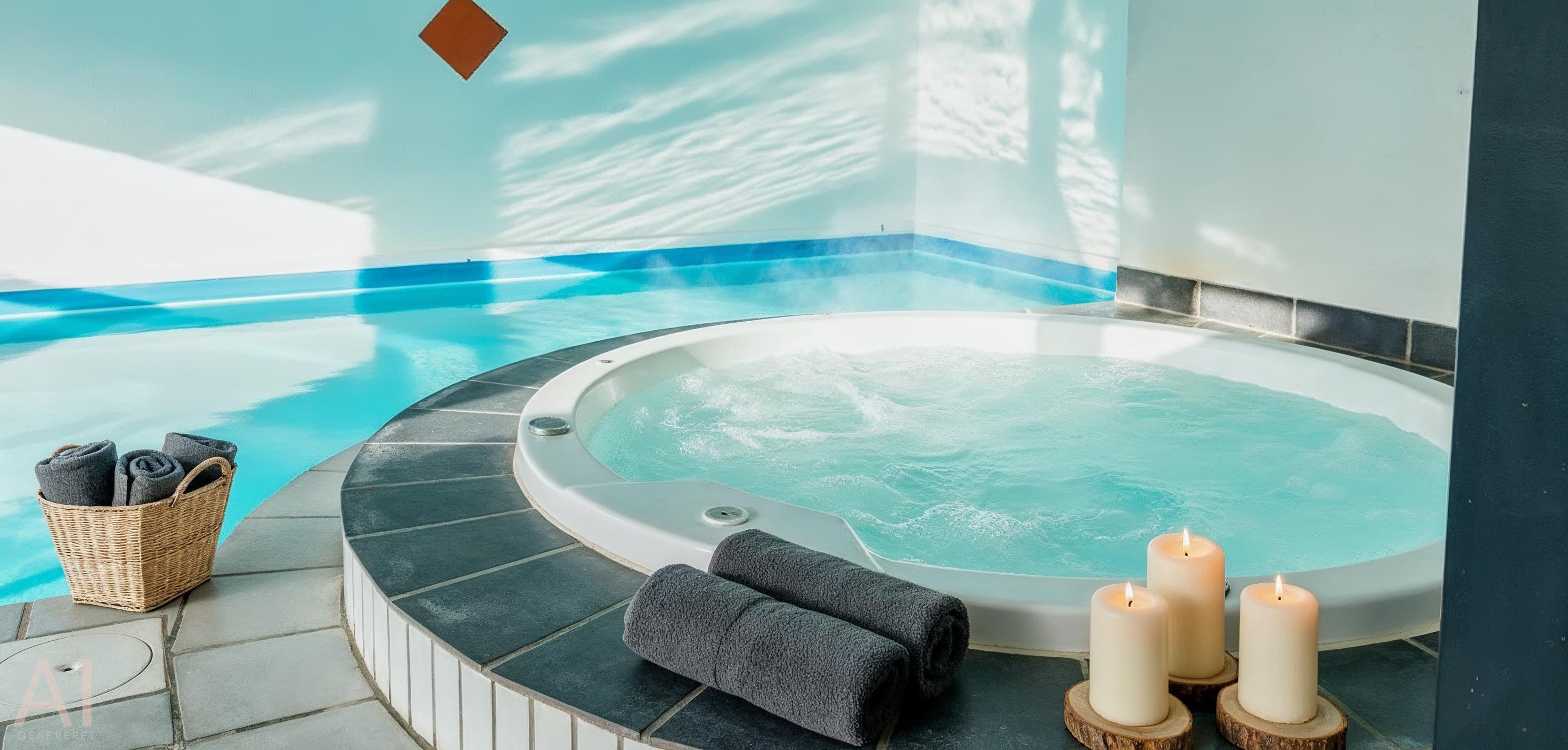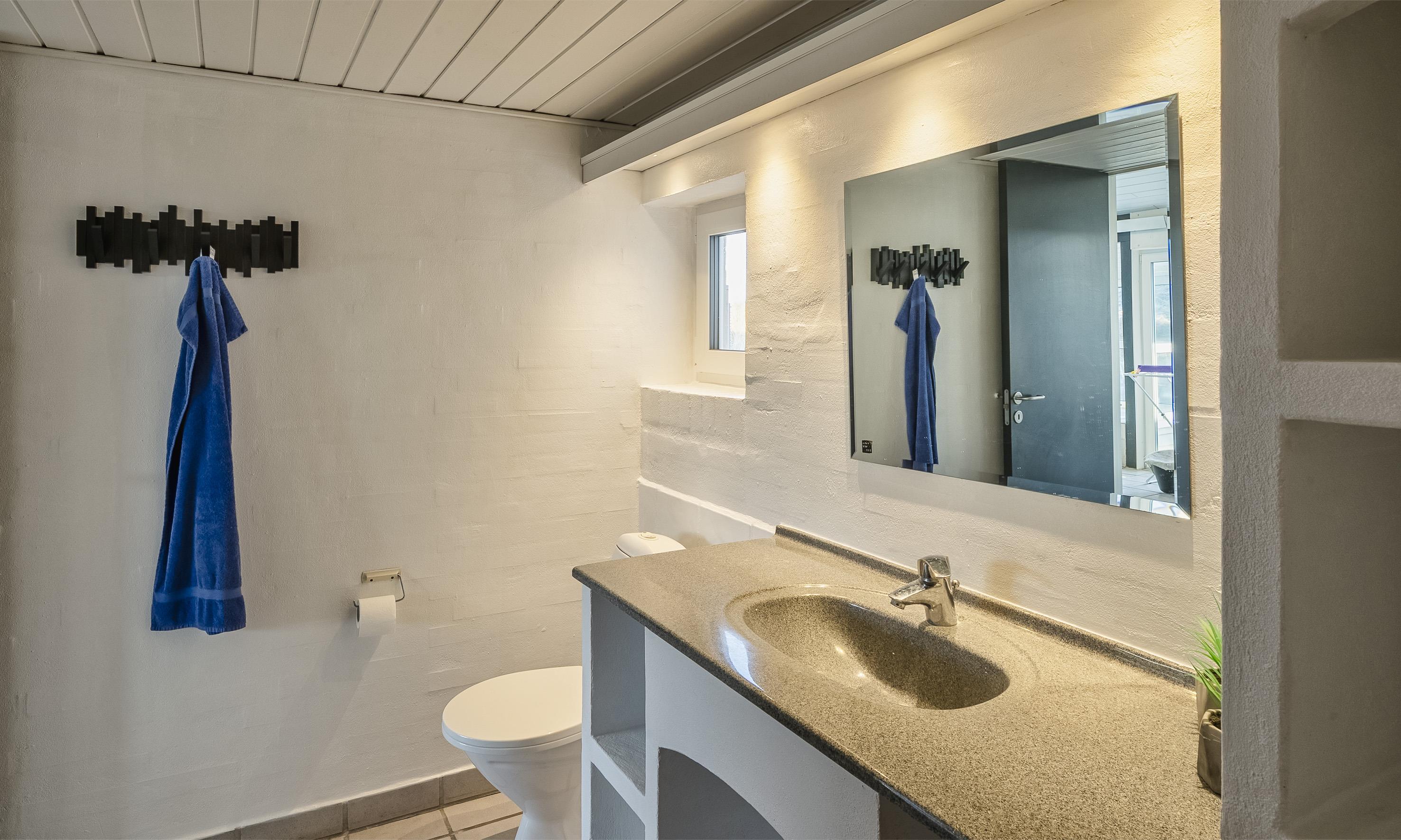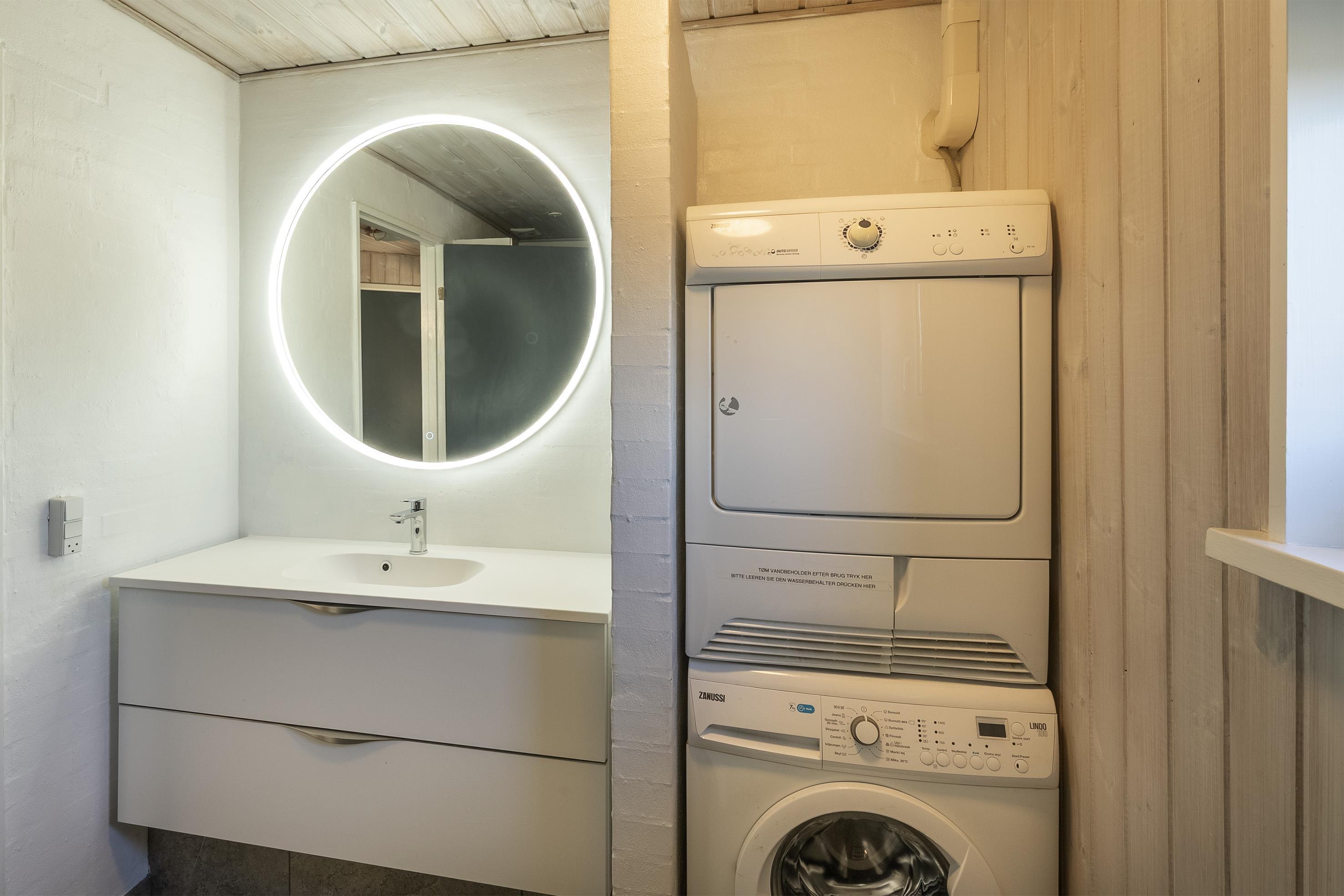 Sommerhuset: Entre med plads til garderoben. Huset råder over 2 dejlige badeværelser med gulvvarme. Det ene badeværelse har desuden tørretumbler og vaskemaskine mens det andet badeværelse er med sauna. Køkken i åben forbindelse med spiseplads og stue. Rummet er lyst og dejligt med et godt lysindfald samt indgang til pool området. Køkkenet fremstår med god komfort såsom opvaskemaskine, mikroovn, keramiske kogeplader, emhætte og 2 køleskabe samt fryseskab på 94 liter. Fra køkkenet er der udgang til terrasse. Dejlig opholdsstue med brændeovn, fjernsyn, radio, CD afspiller, Stofa-sommerhuspakke (4 danske programmer) og trådløs internetadgang. Pool rum med ca. 7,7 x 3 x 1,3 meter (længde x bredde x dybde) stor pool, gulvvarme, standvandsspa (til ca. 5 personer) og udgang til terrasse. Huset har i alt 6 soverum. 5 soveværelser med hver 1 dobbeltseng og 1 soveværelse med 2 enkeltsenge (6 soveværelser: DS + DS + DS + DS + DS + 2ES). Huset er børnevenligt i form af 2 gynger og en sandkasse. Terrasserne er flisebelagte. 2 kulgrill forefindes i sommerhalvåret.