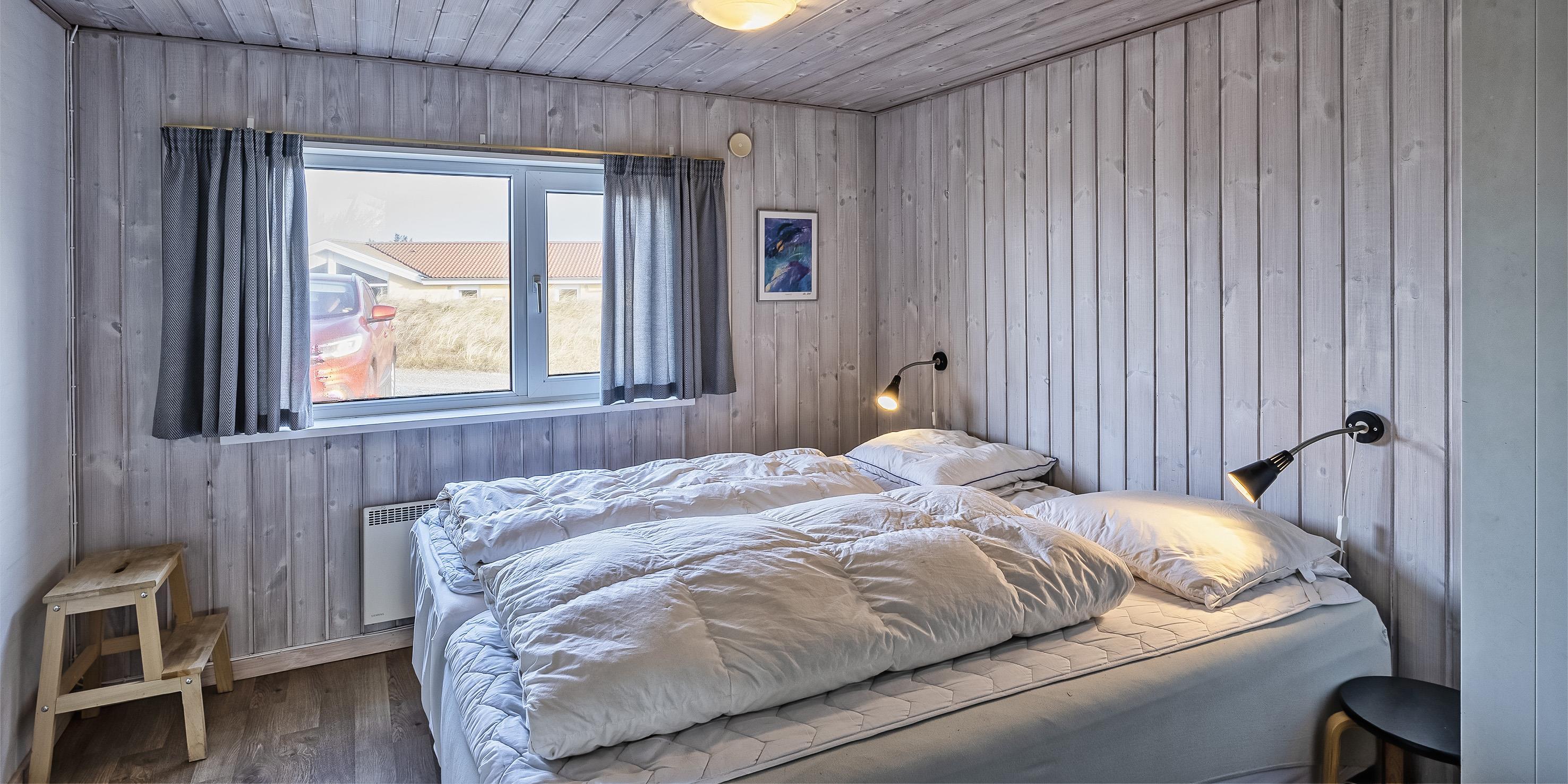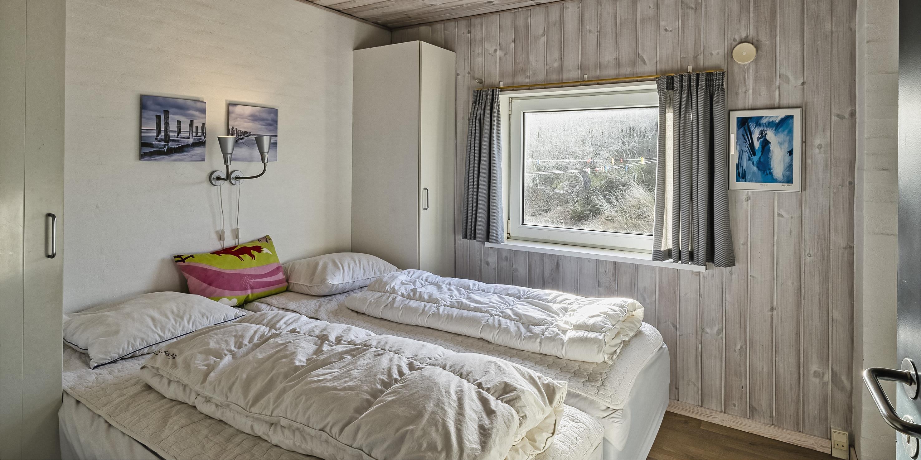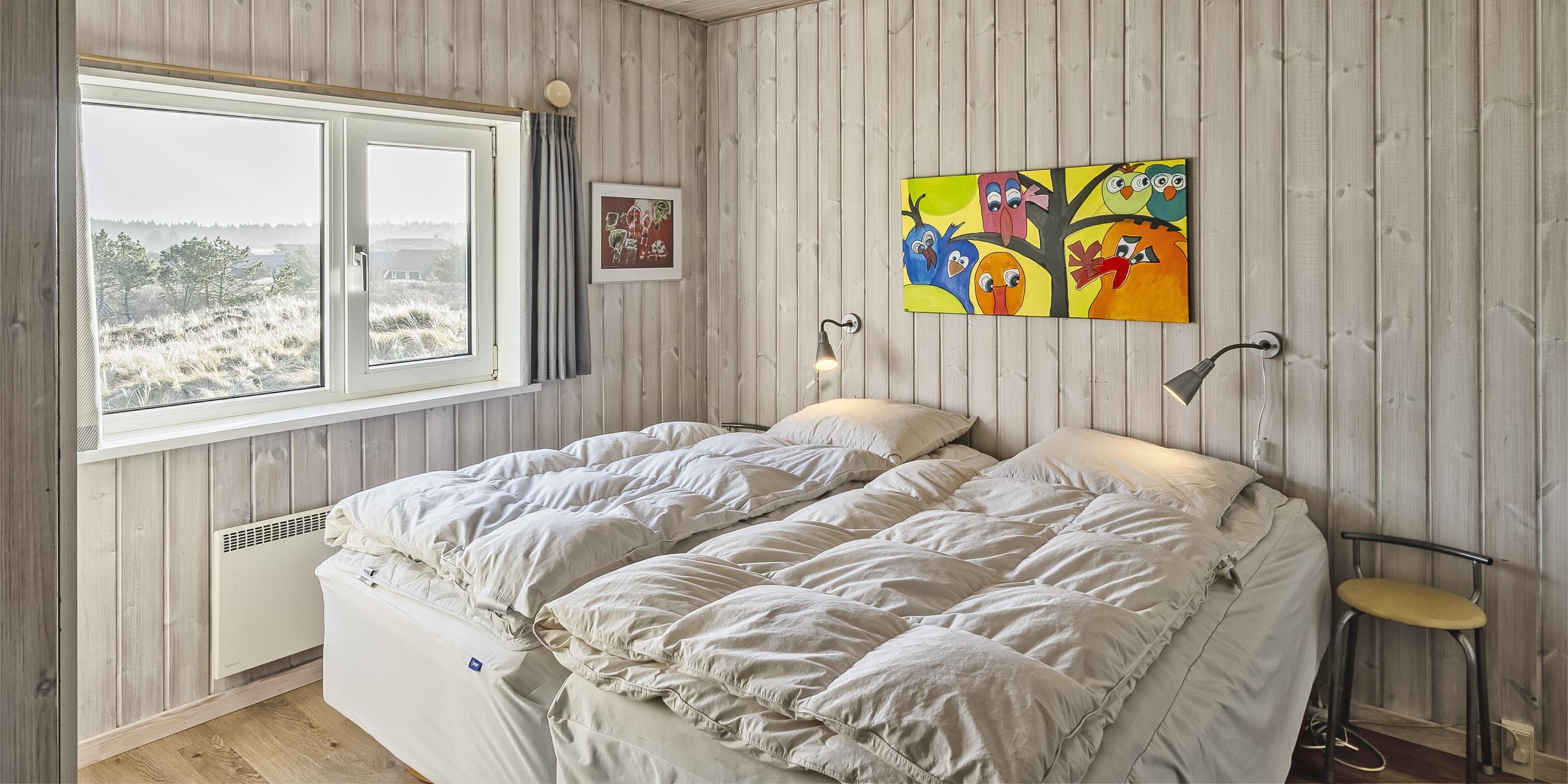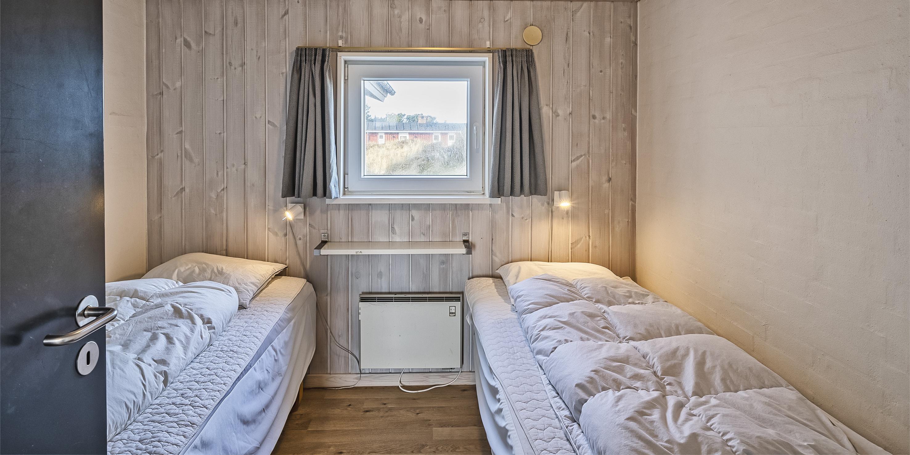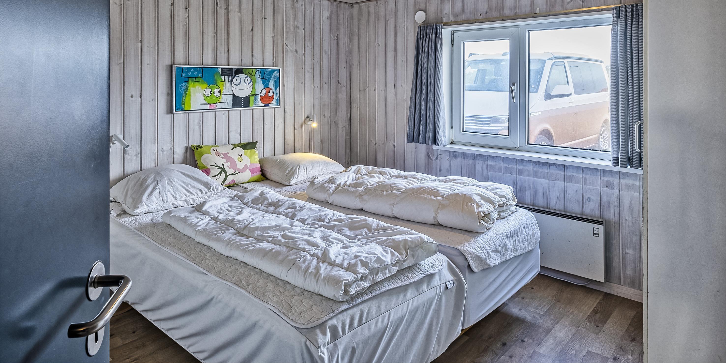 6 soveværelser. 5 med dobbeltseng 180x200 cm. 1 med 2 enkeltsenge (á 90x200 cm)