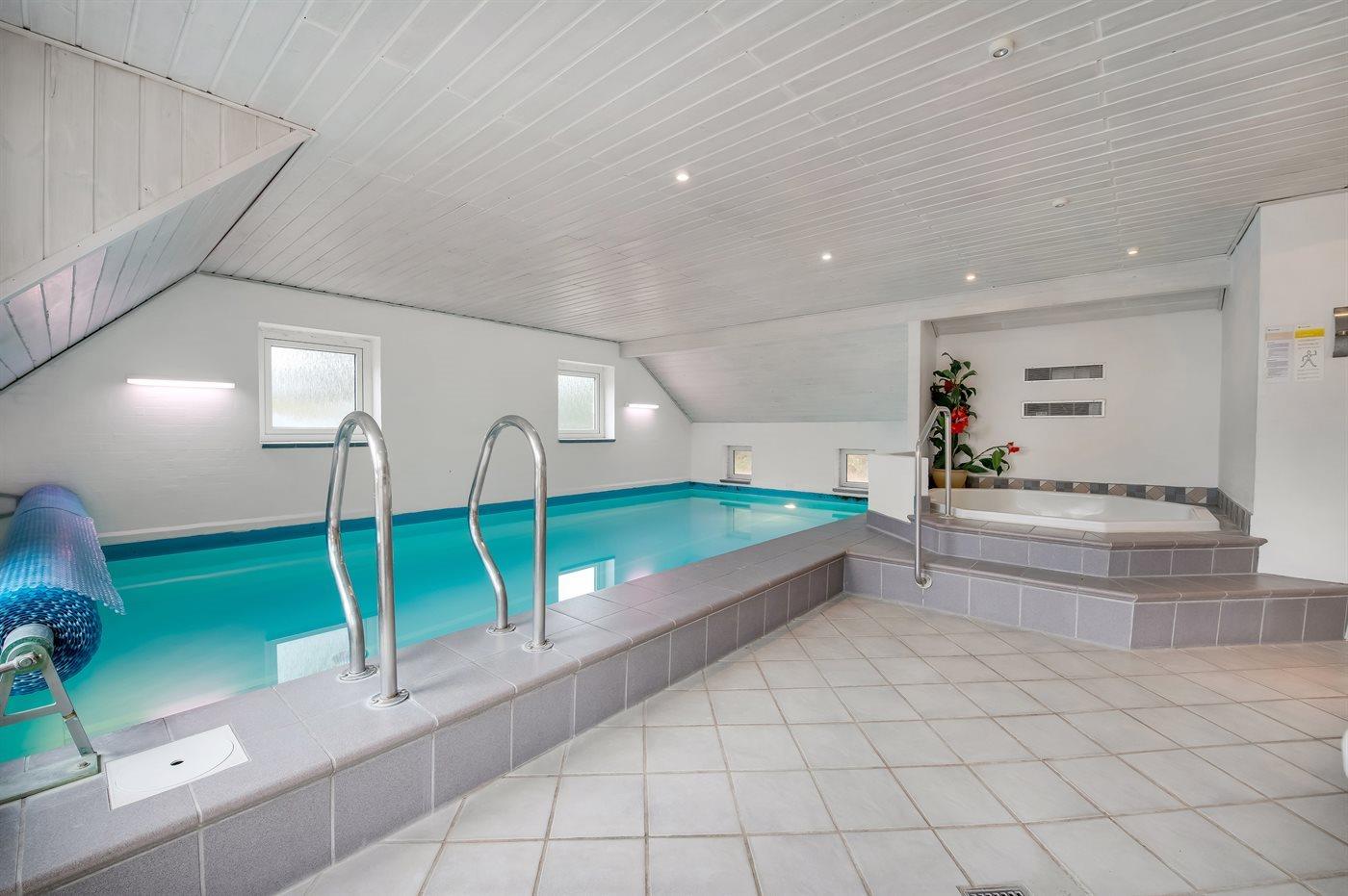 I den indendørs swimmingpool er der mulighed for leg og hyggeligt samvær. Swimmingpoolen måler op til 7 m i bredden, 3,6 m i længden og den er op til 1,3 m dyb. Vandet er mellem 24 og 28° C varmt. Der er gulvvarme i swimmingpoolområdet.