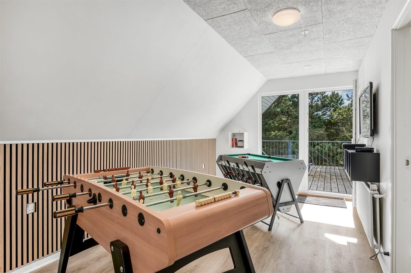 I aktivitetsrummet er der følgende udstyr: Bordfodbold og aktivitetsbord med poolbord og airhockey.
