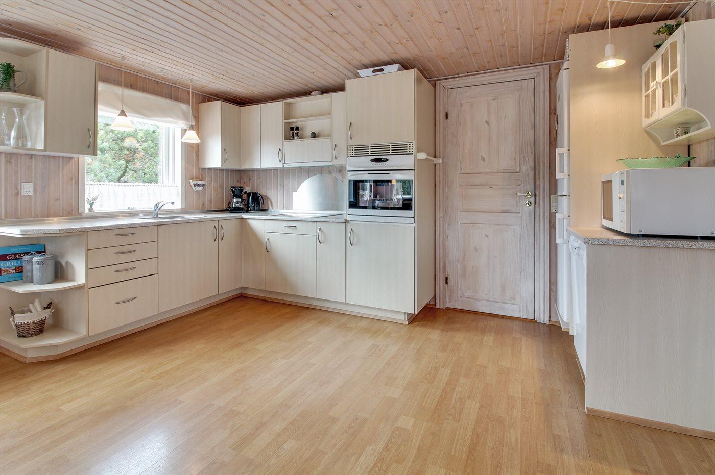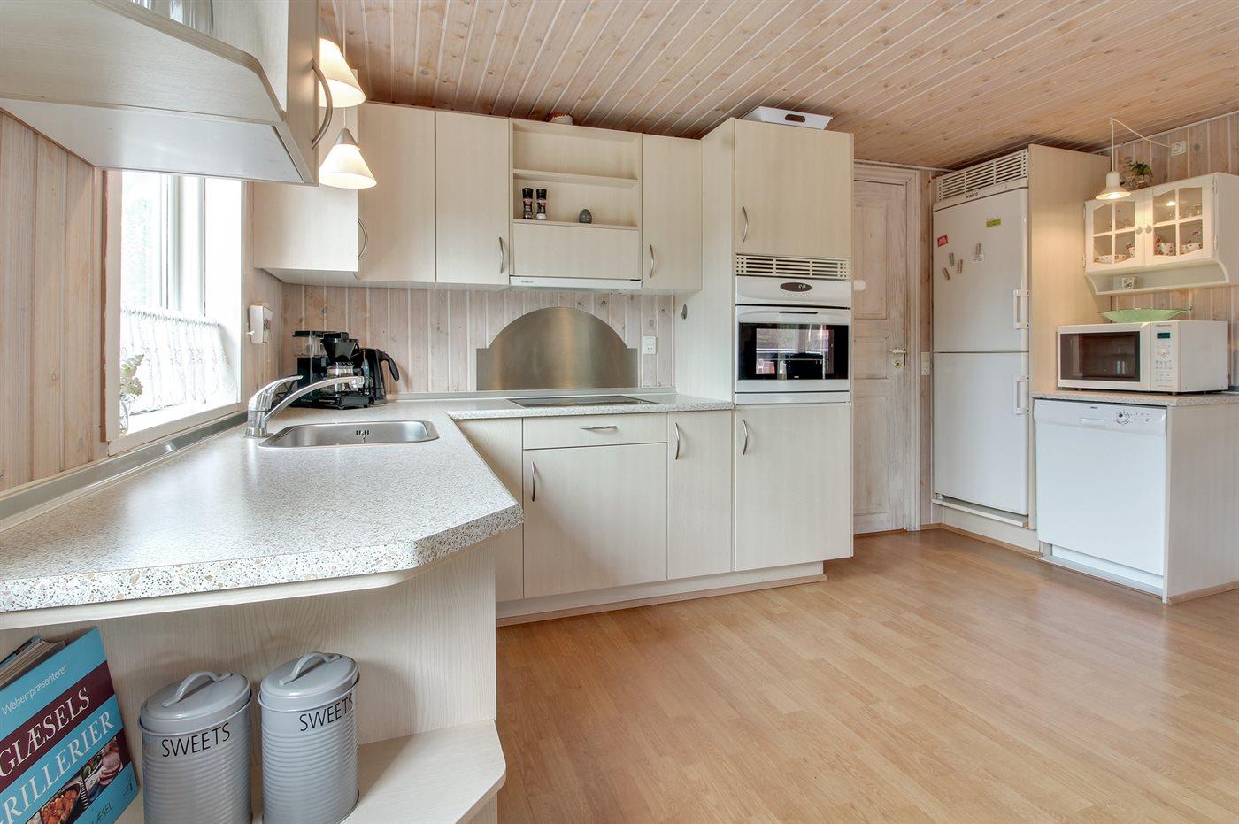 Køkkenet er udstyret med 1 køleskab. Der er 4 keramiske kogeplader, varmluftovn, mikrobølgeovn samt opvaskemaskine.