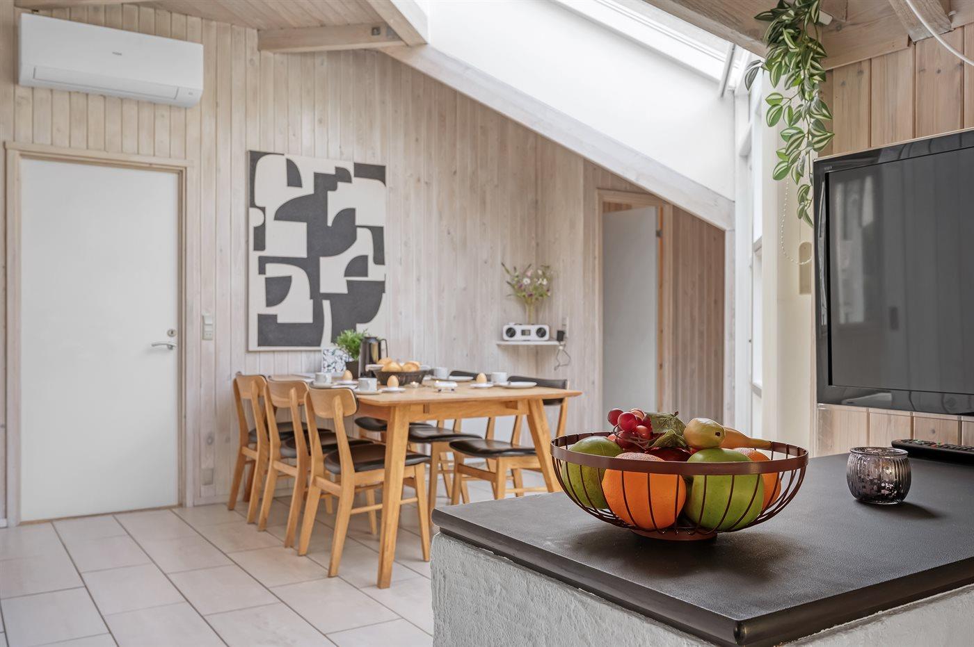 Køkkenet er udstyret med 1 køleskab. Der er 4 keramiske kogeplader, varmluftovn, mikrobølgeovn samt opvaskemaskine.