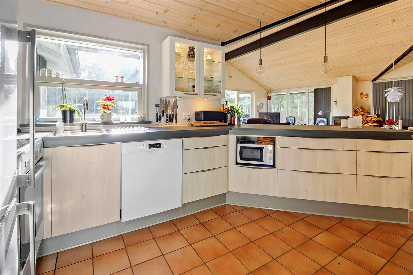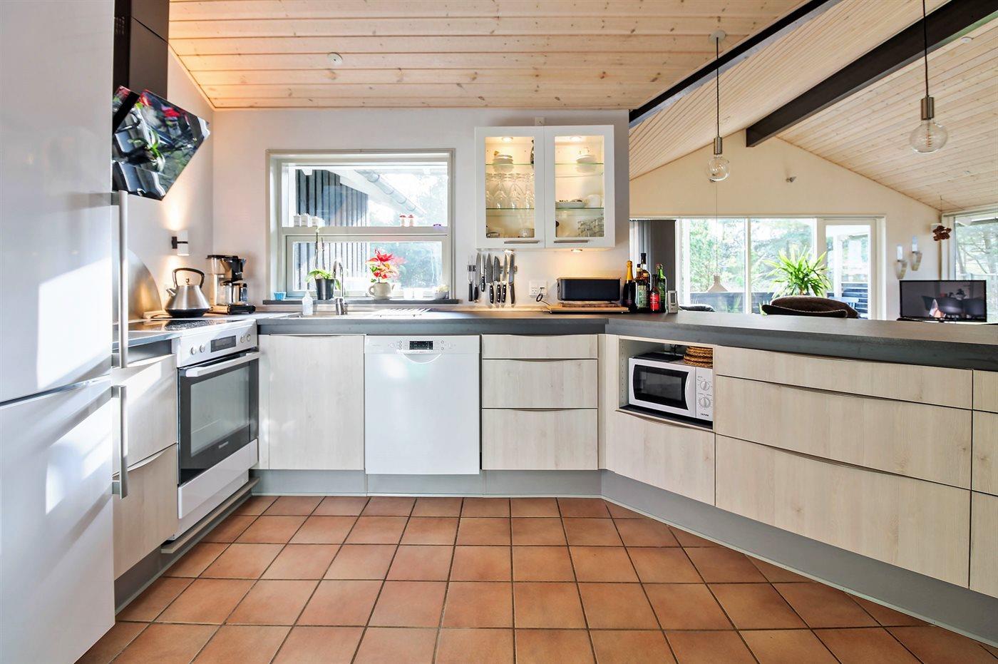 Køkkenet er udstyret med 1 køleskab. Der er 4 keramiske kogeplader, bageovn, mikrobølgeovn samt opvaskemaskine.