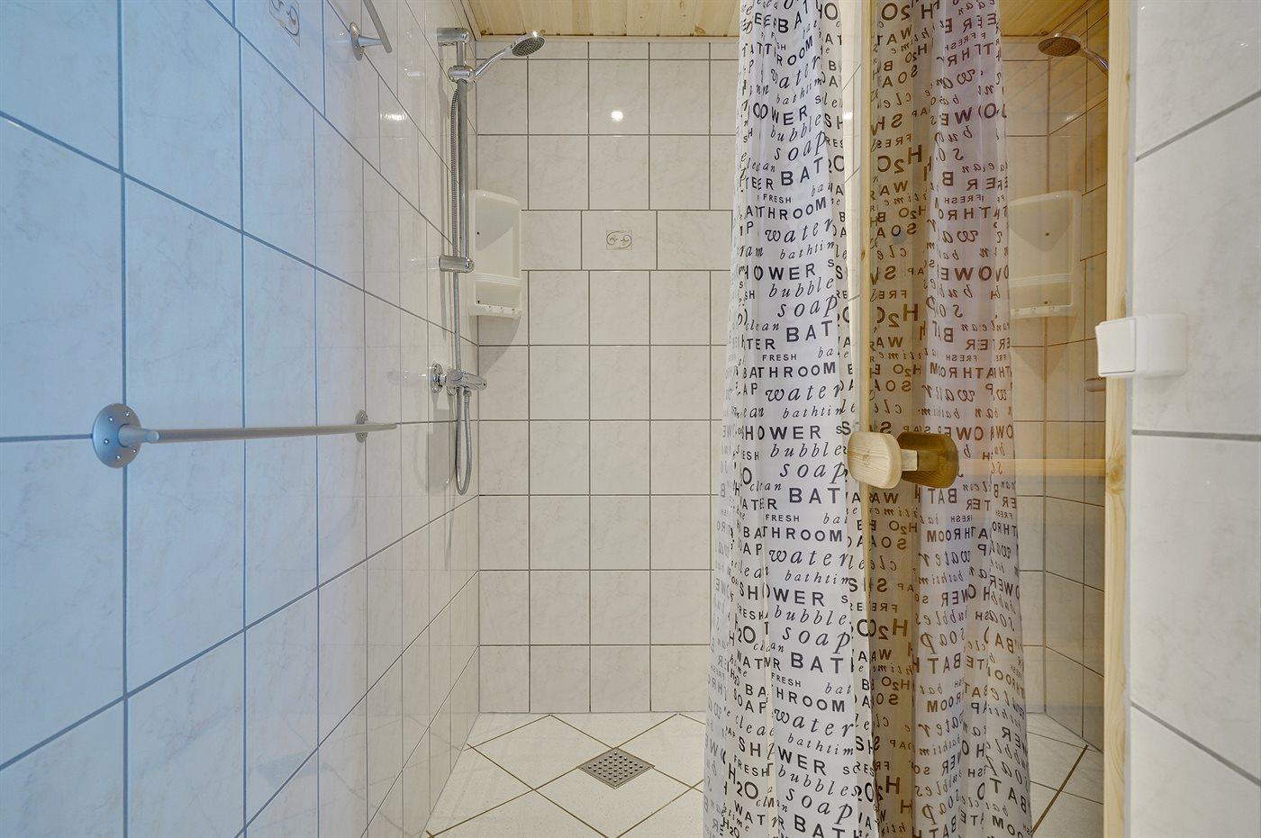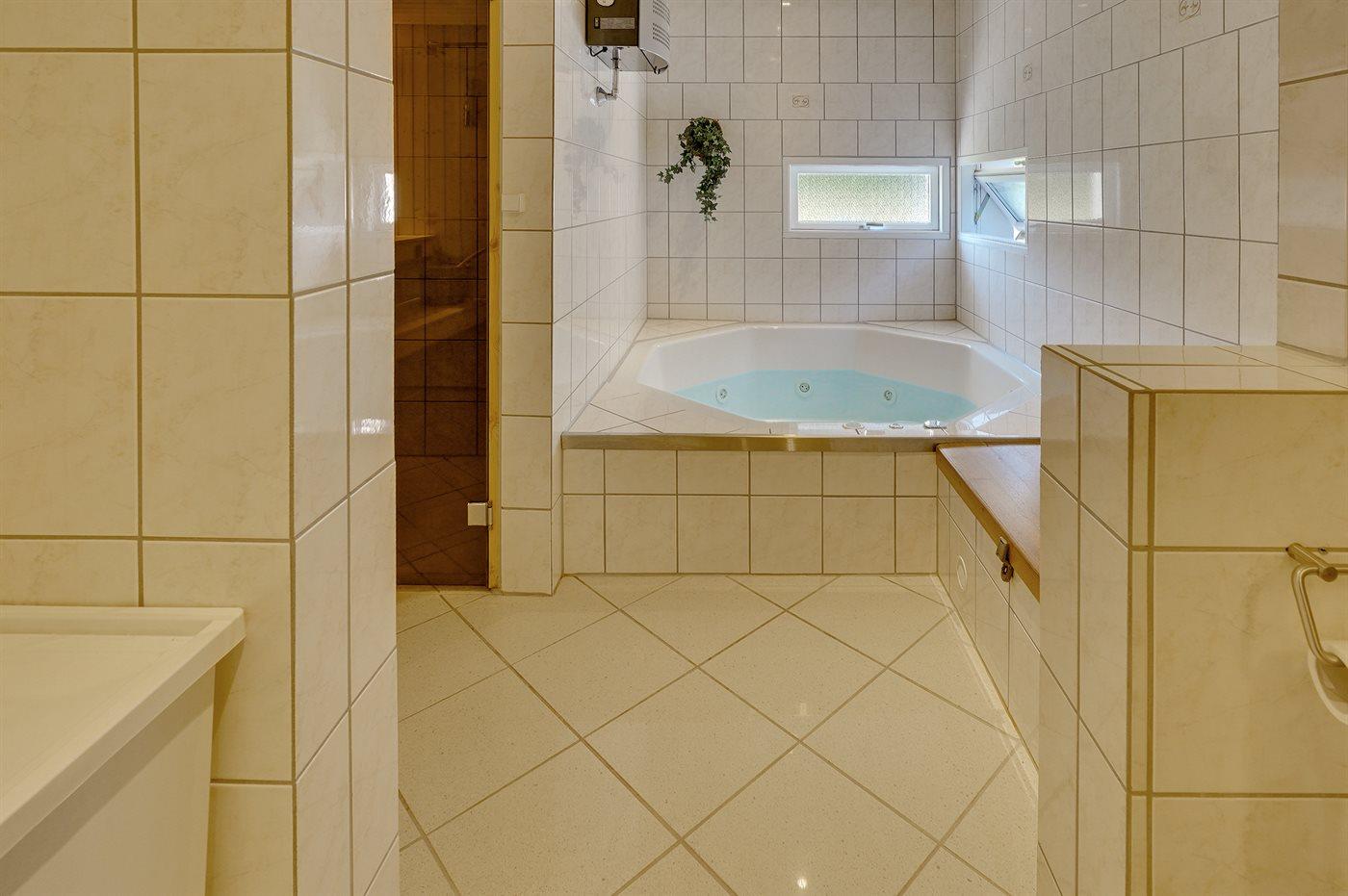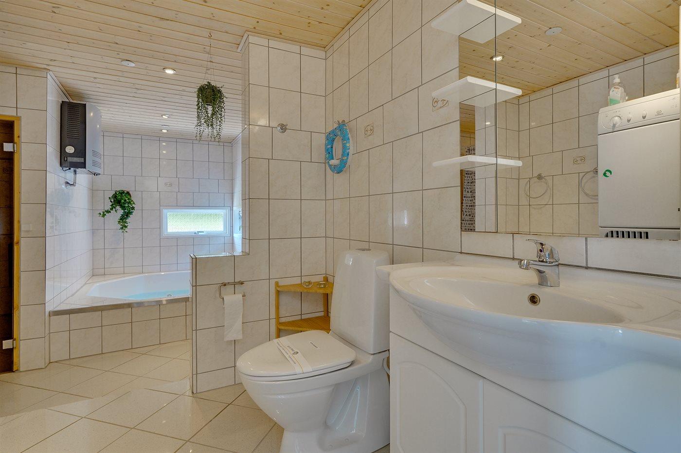 Der er 2 badeværelser med bruseniche og 2 toiletter. Der er gulvvarme på 2 badeværelser. I saunaen er der mulighed for afslapning.