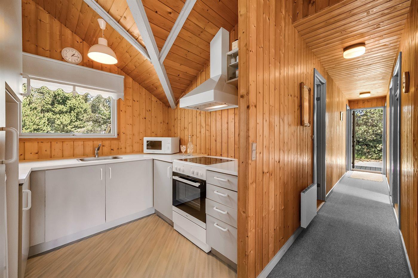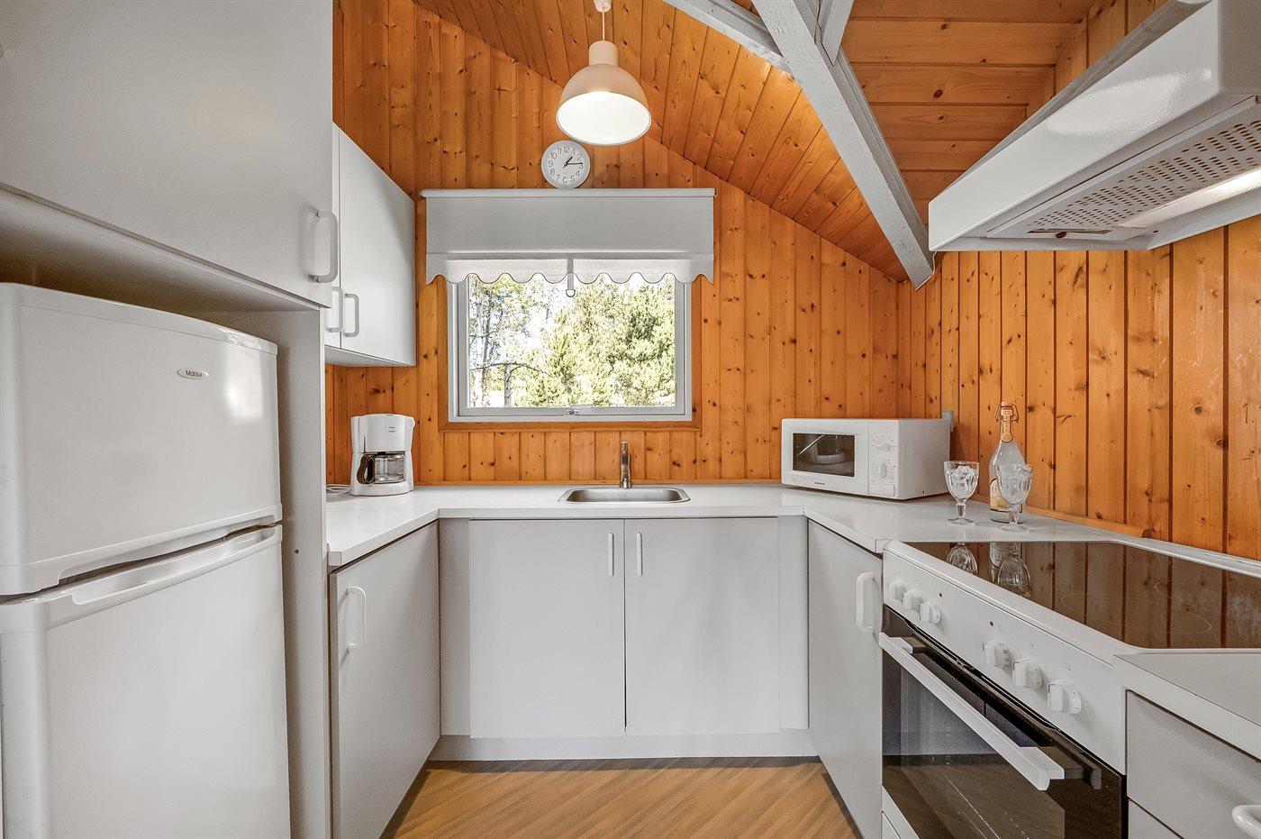 Køkkenet er udstyret med 1 køleskab. Der er 4 keramiske kogeplader, bageovn, mikrobølgeovn.