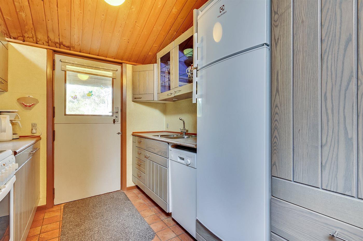 Køkkenet er udstyret med 1 køleskab. Der er 4 keramiske kogeplader, varmluftovn, mikrobølgeovn samt opvaskemaskine.