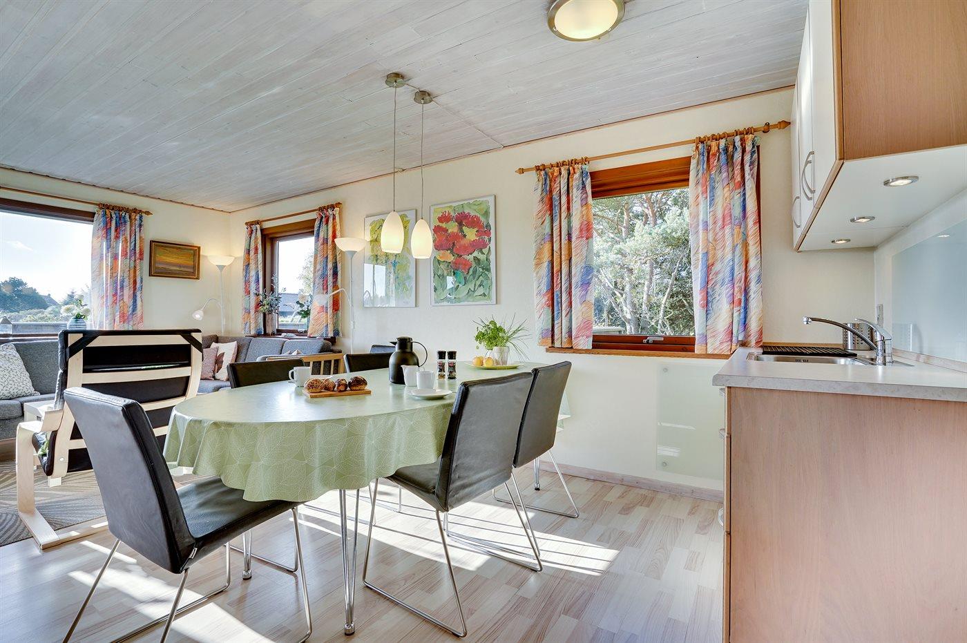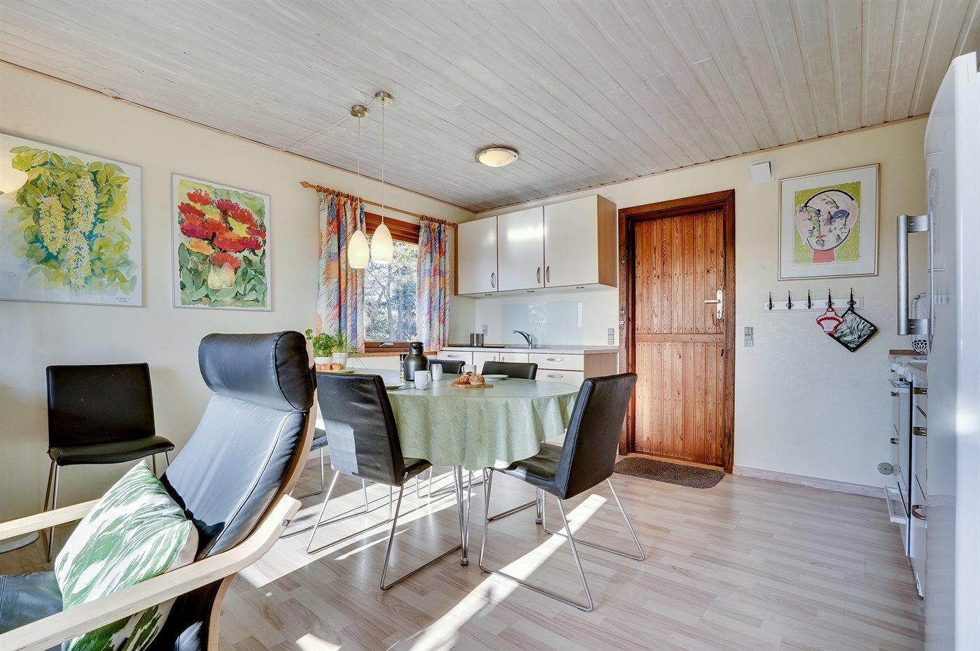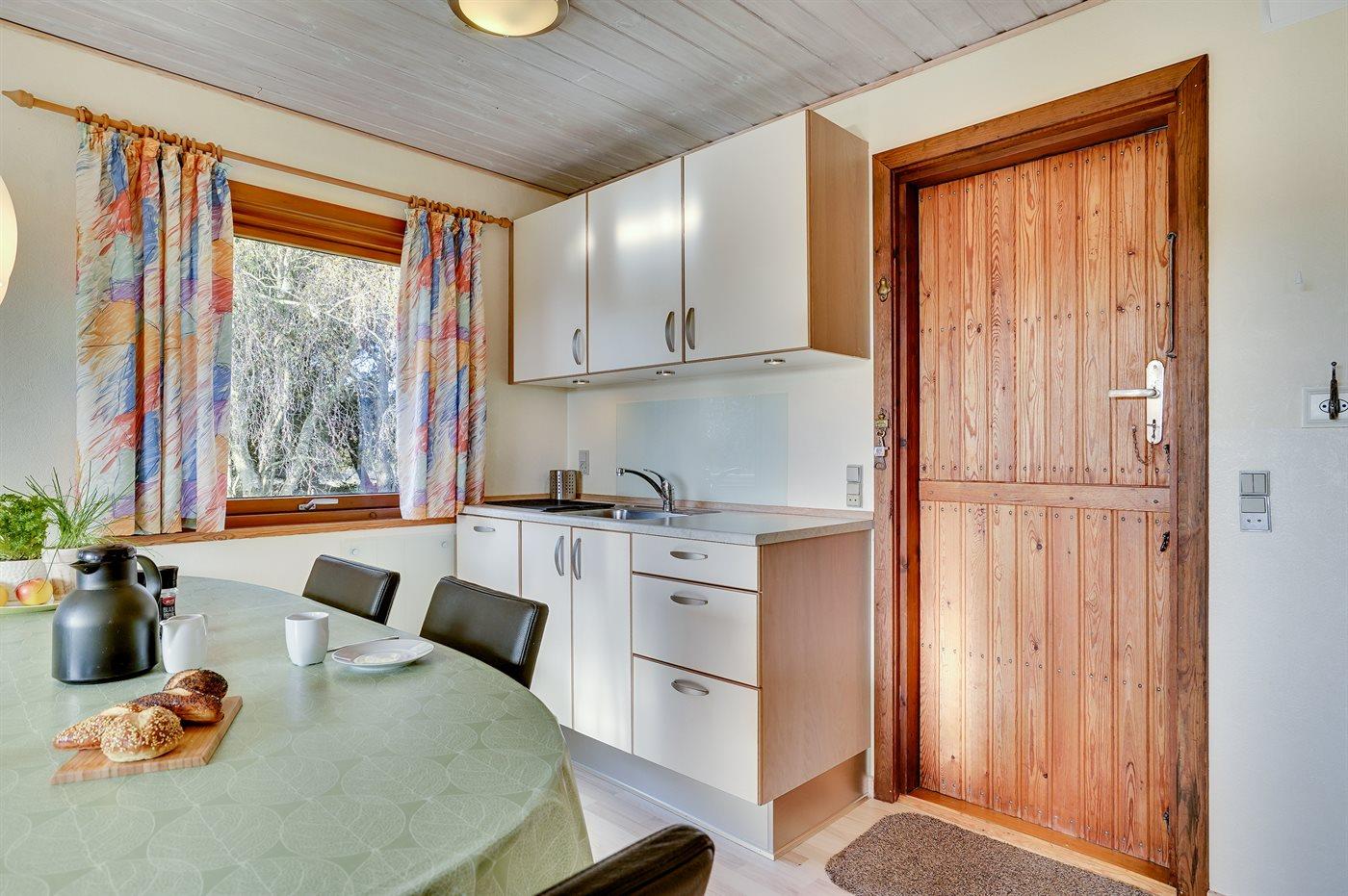 Køkkenet er udstyret med 1 køleskab. Der er 4 elkogeplader, varmluftovn, mikrobølgeovn samt opvaskemaskine.