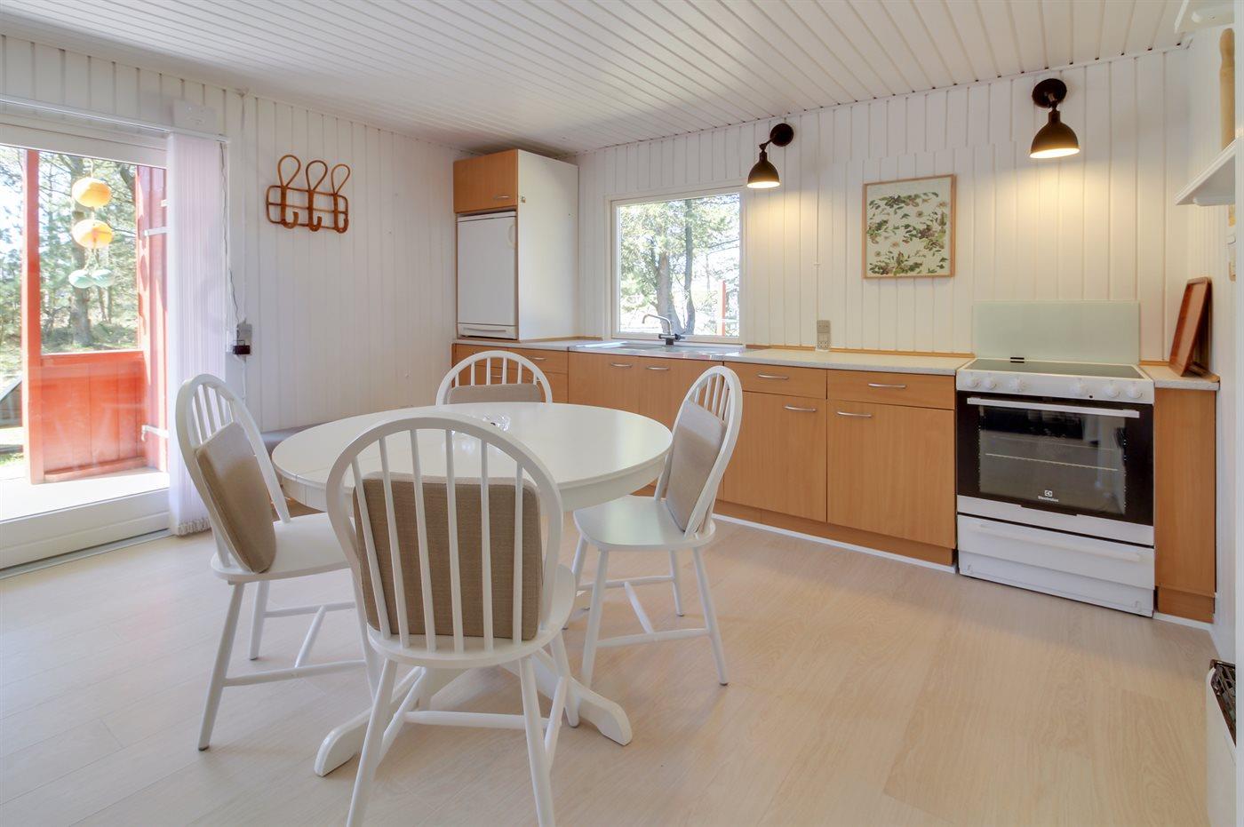 Køkkenet er udstyret med 1 køleskab. Der er 4 elkogeplader, bageovn.