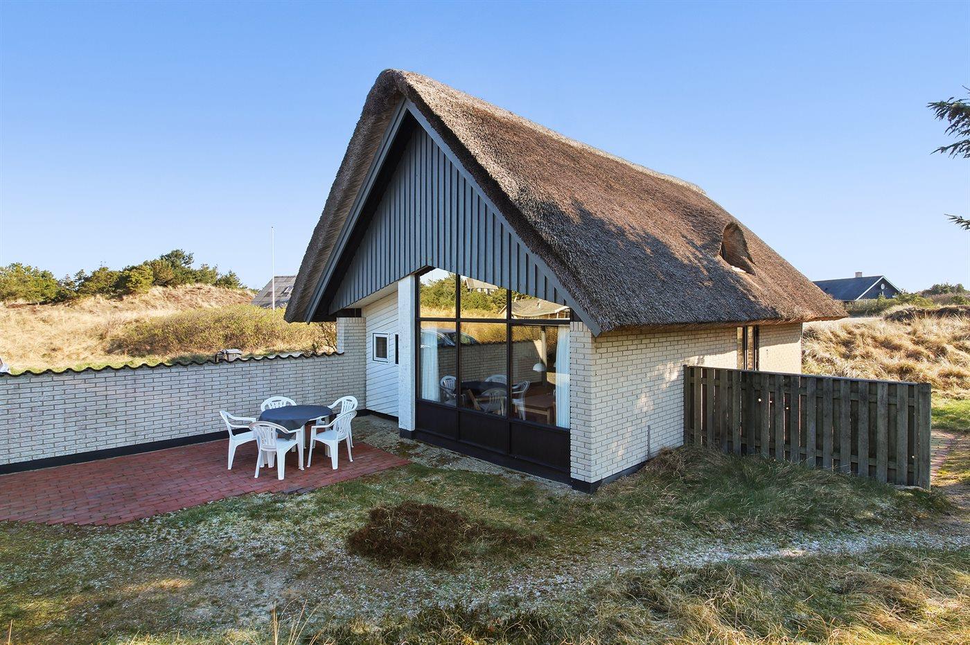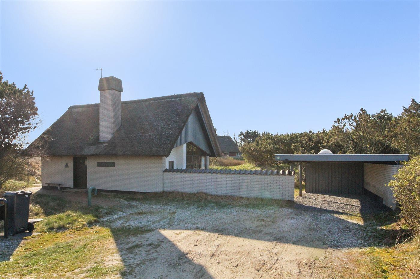 Lyst sommerhus med stråtag nær Vejers Strand, 400 m fra havet, på en stor naturgrund med terrasse og carport.