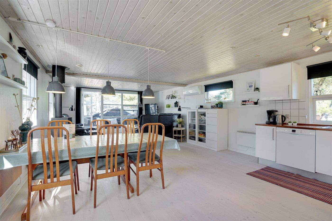 Køkkenet er udstyret med 1 køleskab. Der er 4 keramiske kogeplader, bageovn, mikrobølgeovn samt opvaskemaskine.