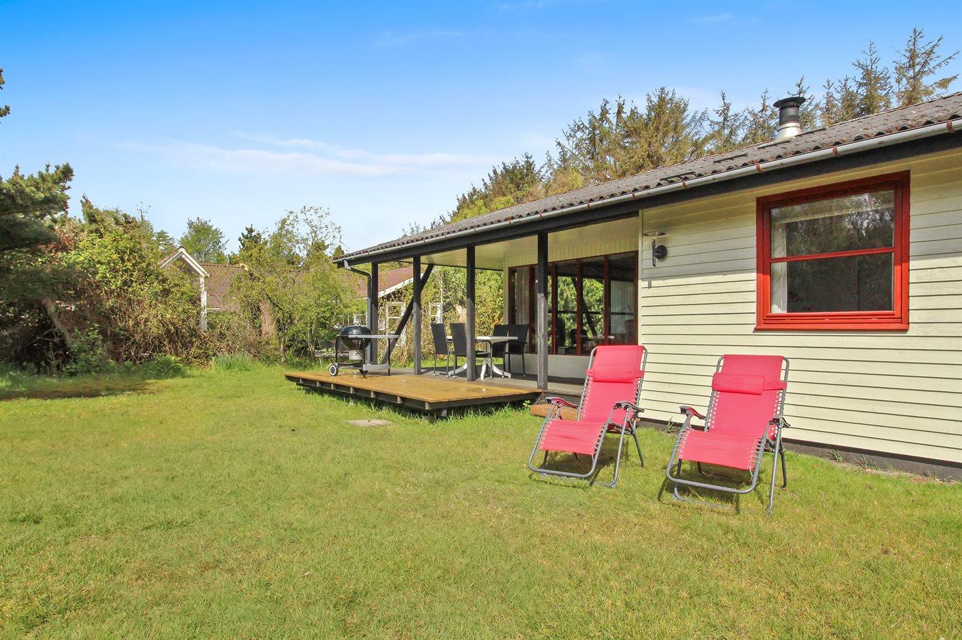 Velholdt familiesommerhus nær Vejers Strand på stor naturgrund med brændeovn og to terrasser.