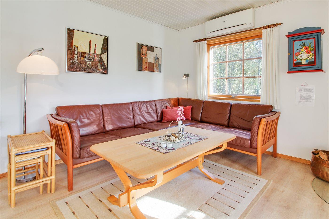 Hyggeligt feriehus på dejlig stor grund, omkranset af træer. I stuen forefindes spiseplads til 6 personer, sofa og lænestol. Til huset hører redskabsrum/cykelskur, som kan låses samt 1 dame- og 1 herrecykel (service er gæsternes eget ansvar – der garanteres ikke for cyklernes tilstand).