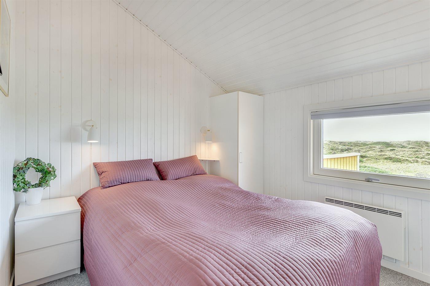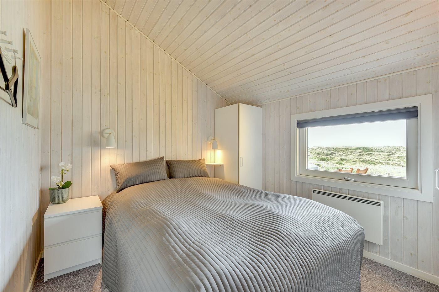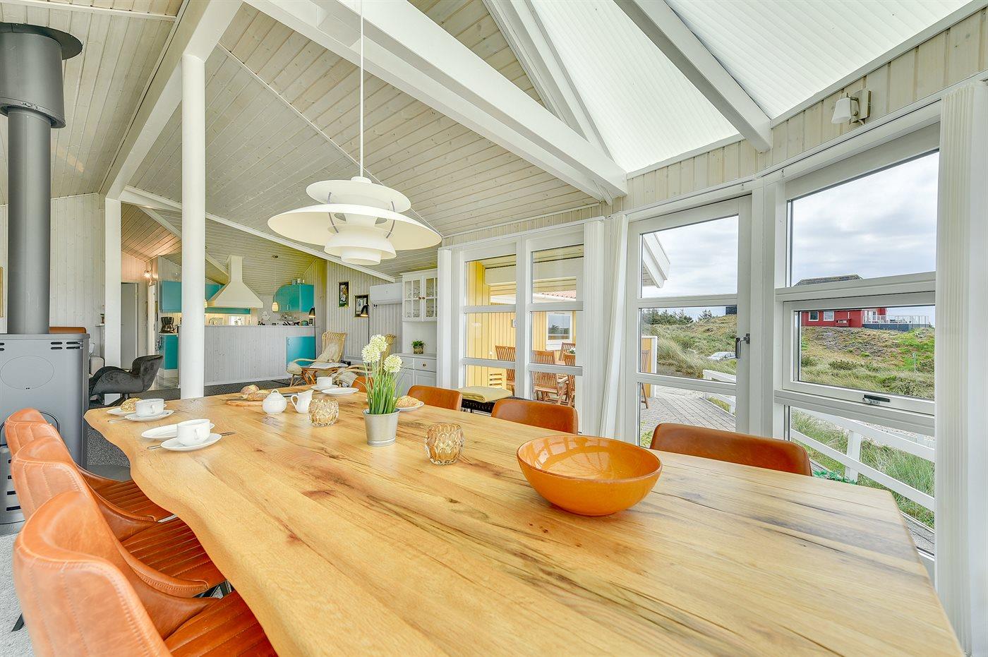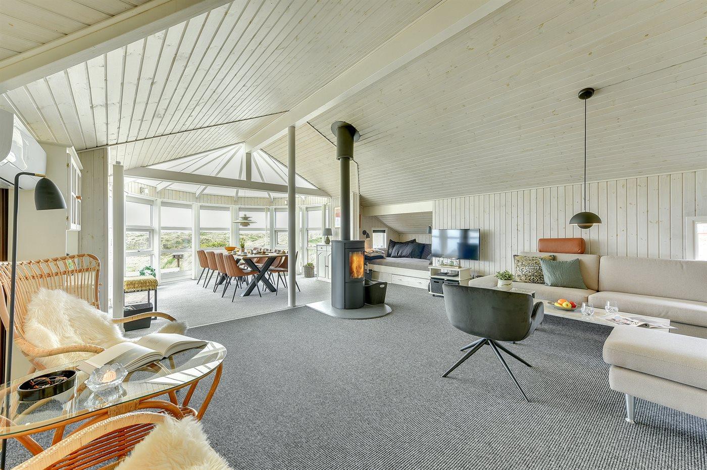 Huset er bygget i 1993 og renoveret i 2005 og er indrettet med: en stor lys opholdsstue, tv-stole, en energibesparende varmepumpe, en centralt placeret brændeovn, tæpper pålagt, alkove samt en dejlig udestue indrettet som spiseplads, hvorfra De har en fantastisk udsigt ud over hele klitområdet. Der er tv med dvd og gratis internet samt musikstreaming via bluetooth højttaler. Der er 2 badeværelser, begge med bruseniche, håndvask og toilet, i det ene er der også gulvvarme og adgang til sauna, vaskemaskine & tørretumbler samt pusleplads. Der er i alt 4 soveværelser. Sovepladserne fordeler sig på: 4 sovepladser i dobbeltsenge. 4 sovepladser i enkeltsenge. Køkkenet er udstyret med køleskab, komfur med keramiske kogeplader, mikrobølgeovn samt opvaskemaskine.