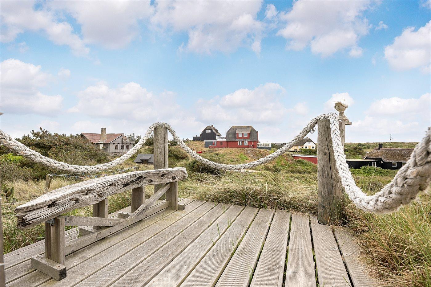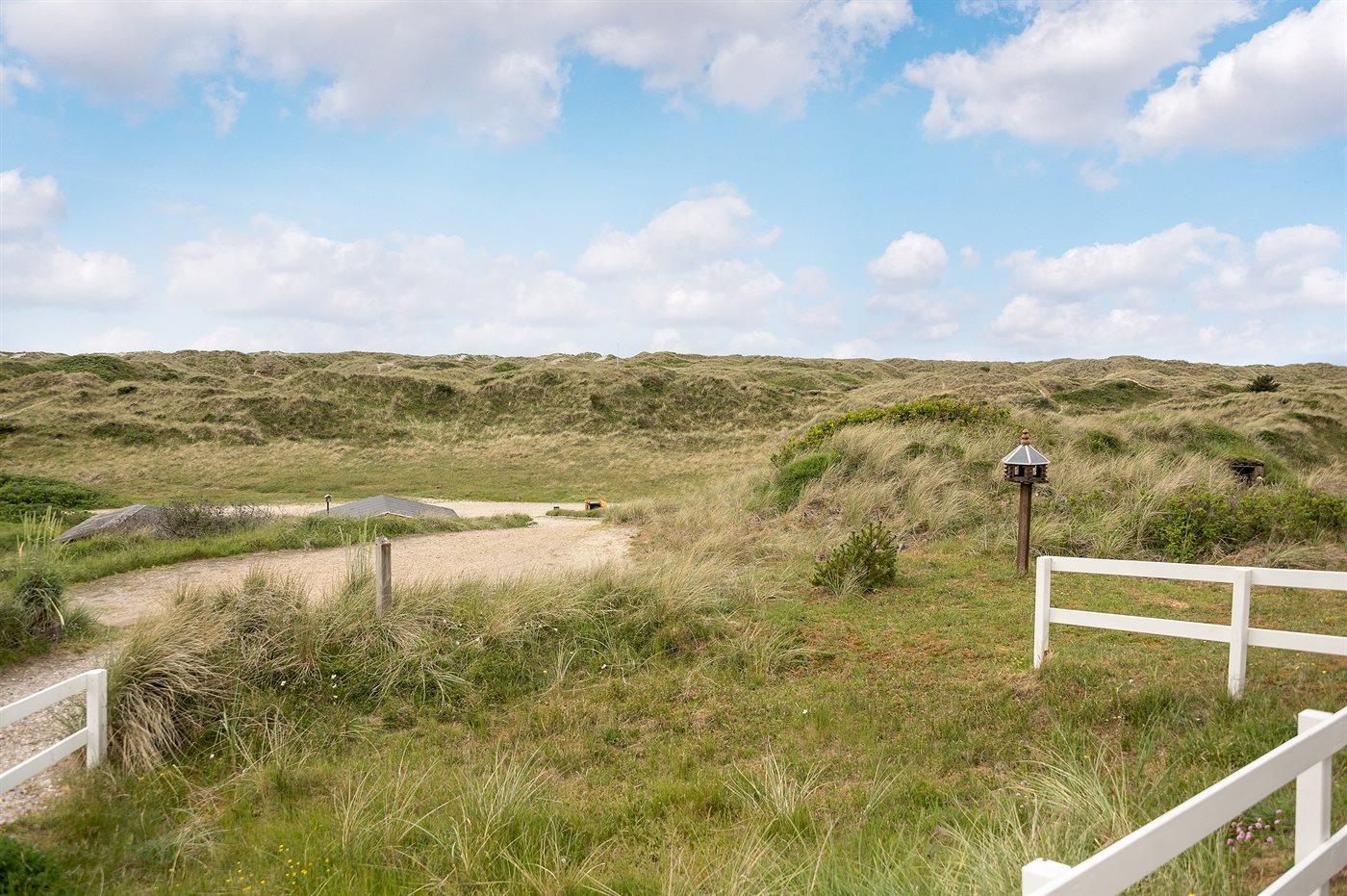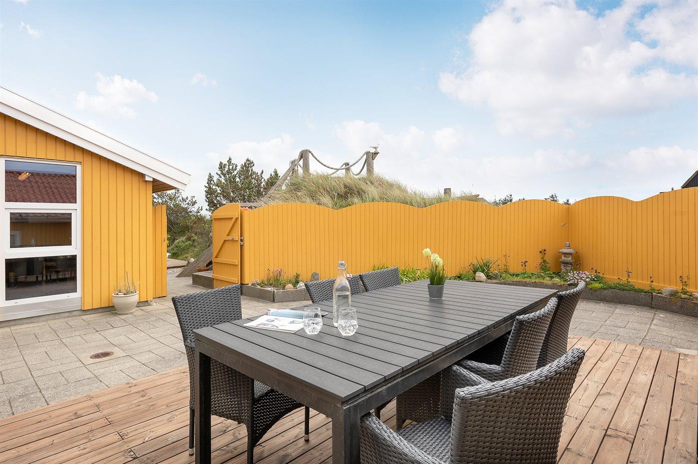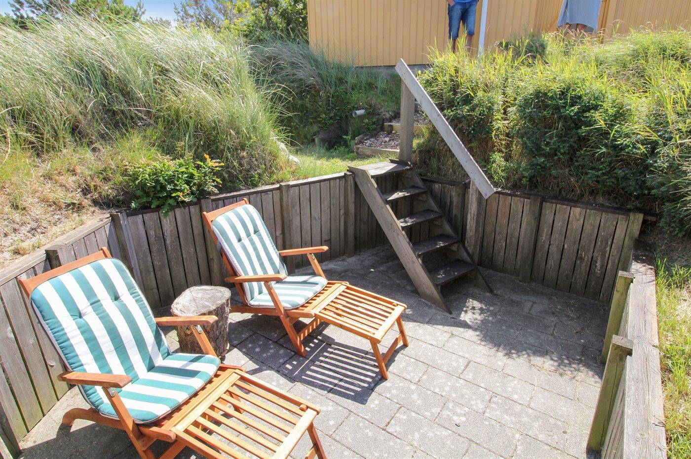 Til ferieboligen er der en 128 m2 stor og helt lukket terrasse/gårdhave med havemøbler samt en gasgrill. Desuden en dejlig 30 m2 solterrasse bag huset også med havemøbler og liggestole. Foran huset findes en skøn aftenterrasse med bord og stole, hvorfra man kan nyde aftensolen gå ned over klitterne. Endnu en hygge- og lækrog bygget ned i klitterne findes på husets venstre side. Her kan man nyde freden og naturen. Fra en top på grunden er der et udsigtpunkt, hvorfra der er en fantastisk udsigt ud over klitterne samt kig til havet.