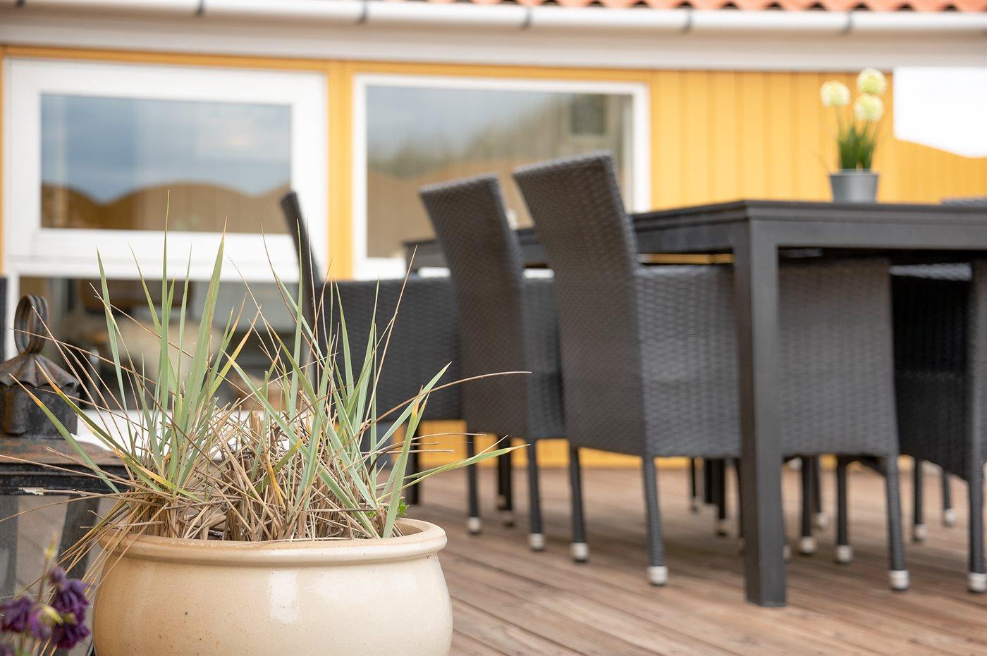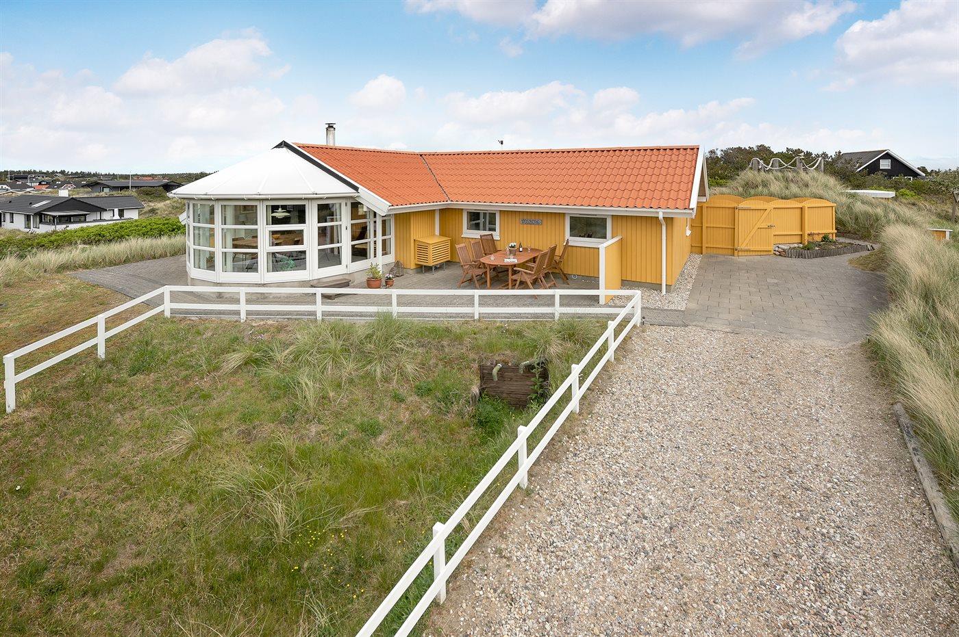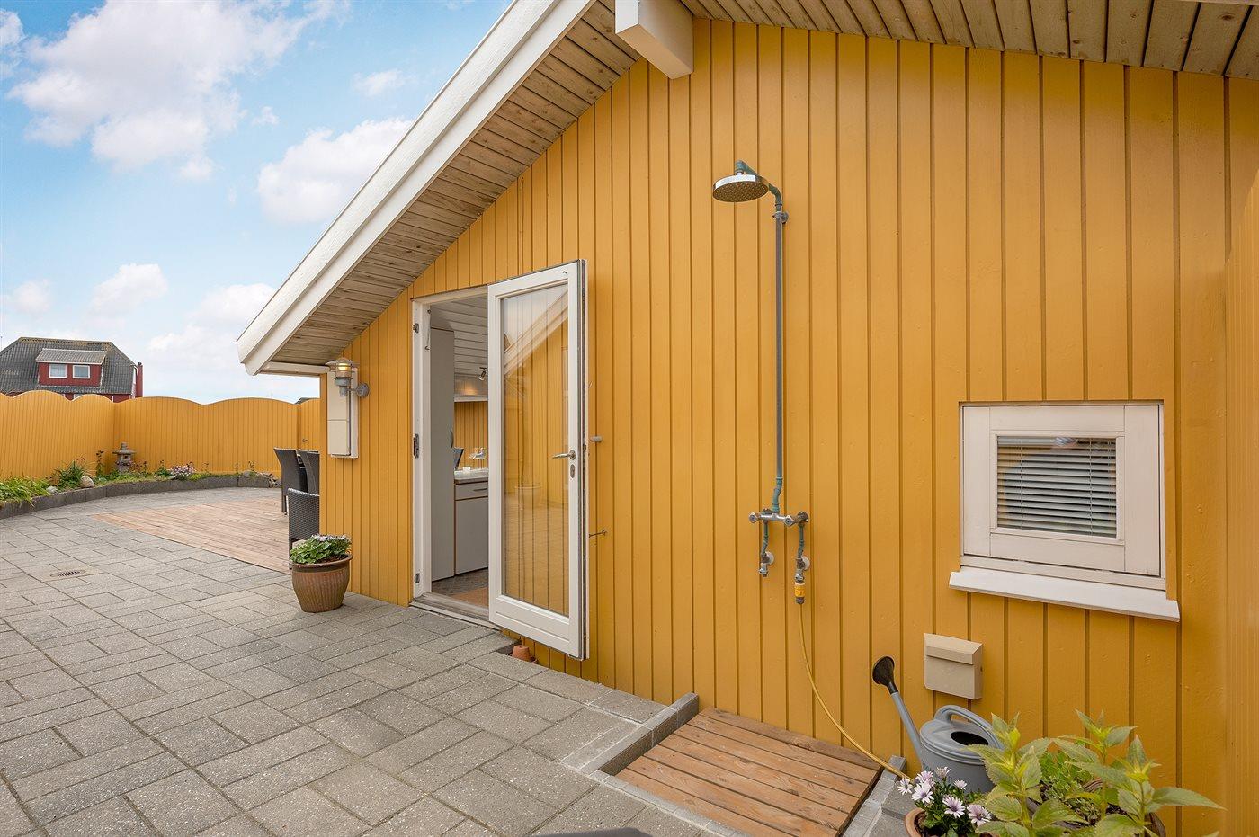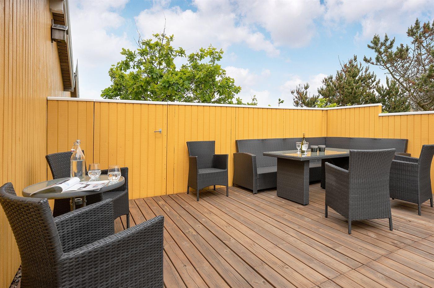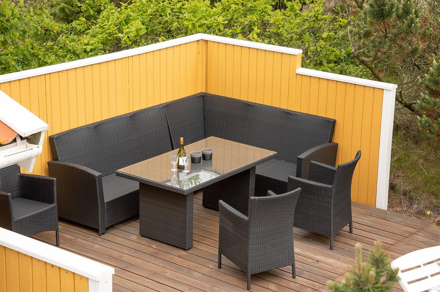 Til ferieboligen er der en 128 m2 stor og helt lukket terrasse/gårdhave med havemøbler samt en gasgrill. Desuden en dejlig 30 m2 solterrasse bag huset også med havemøbler og liggestole. Foran huset findes en skøn aftenterrasse med bord og stole, hvorfra man kan nyde aftensolen gå ned over klitterne. Endnu en hygge- og lækrog bygget ned i klitterne findes på husets venstre side. Her kan man nyde freden og naturen. Fra en top på grunden er der et udsigtpunkt, hvorfra der er en fantastisk udsigt ud over klitterne samt kig til havet.