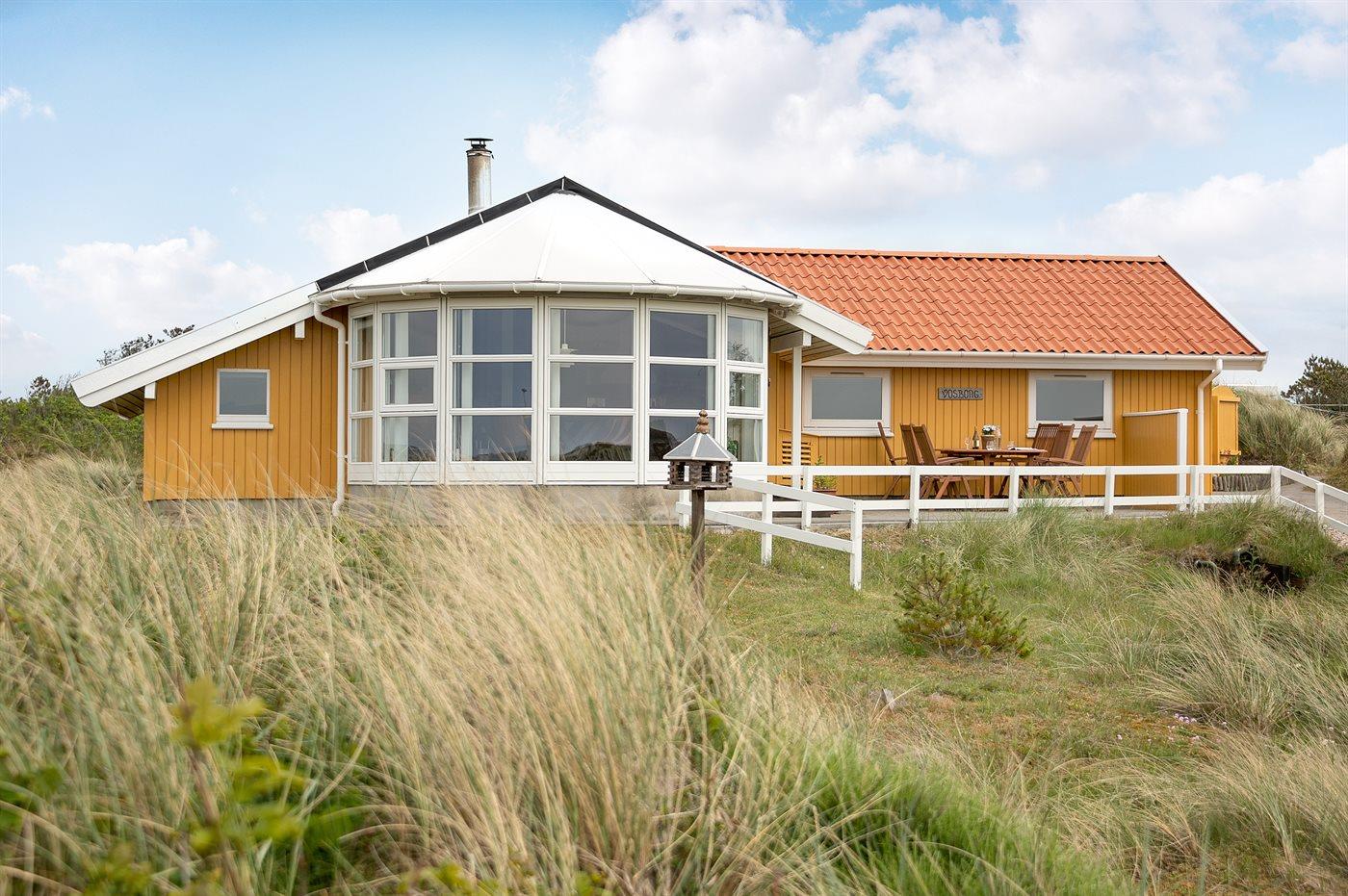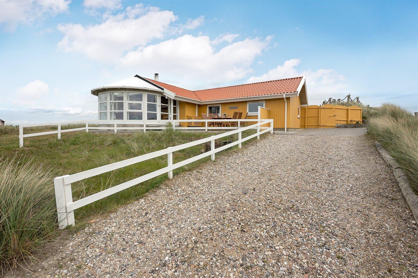 Kun 200 meter fra stranden kan vi tilbyde Dem dette dejlige og højt beliggende feriehus, der ligger ugenert midt i klitterne på en 2500 m2 naturgrund. Vejers ferieby med forretninger og indkøbsmuligheder, cafeer m.m. beliggende i en afstand af 300 m. Der kan køres direkte i bil til huset, og der er desuden stor vendeplads med ekstra parkeringsmuligheder.