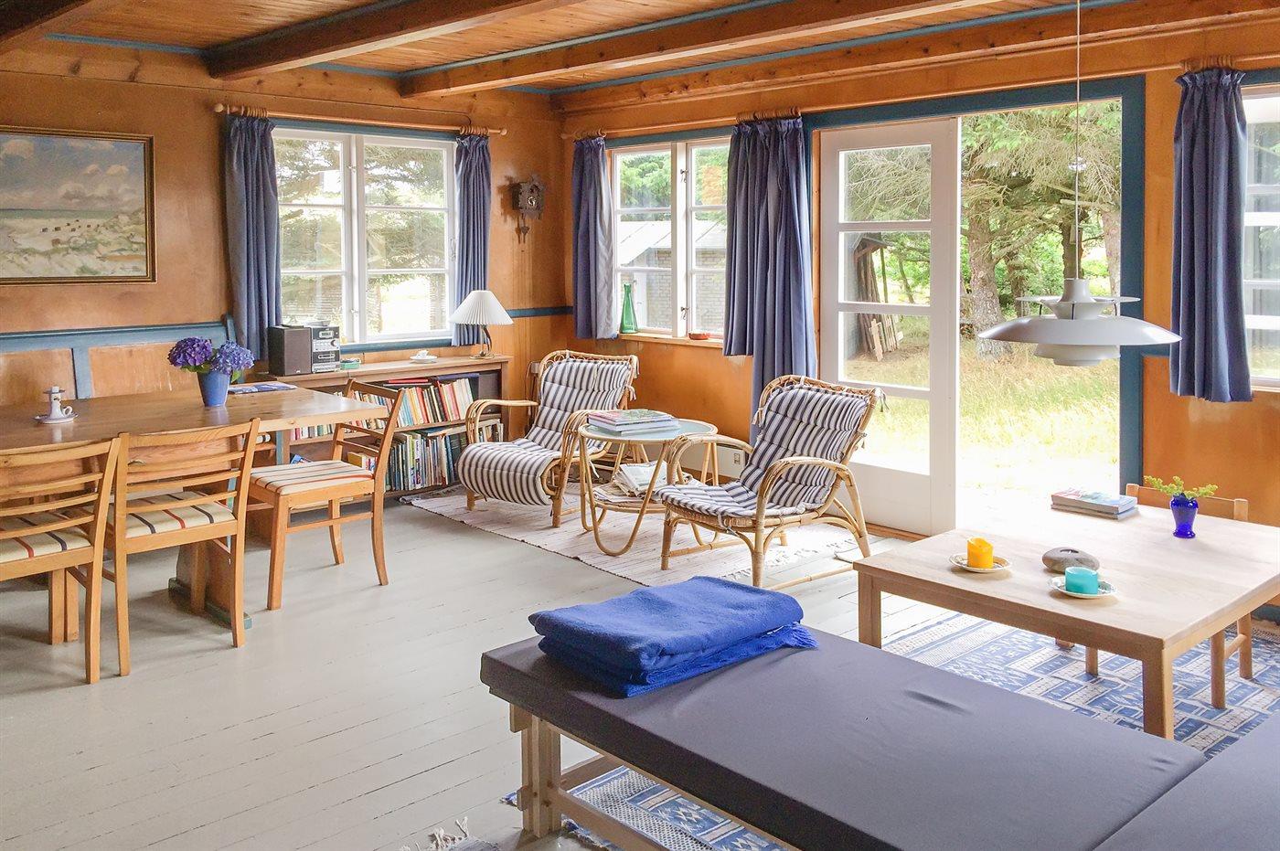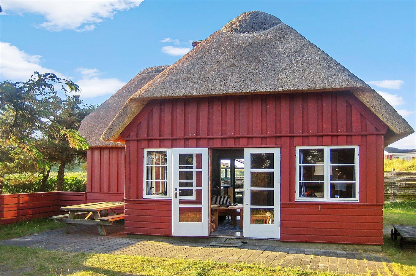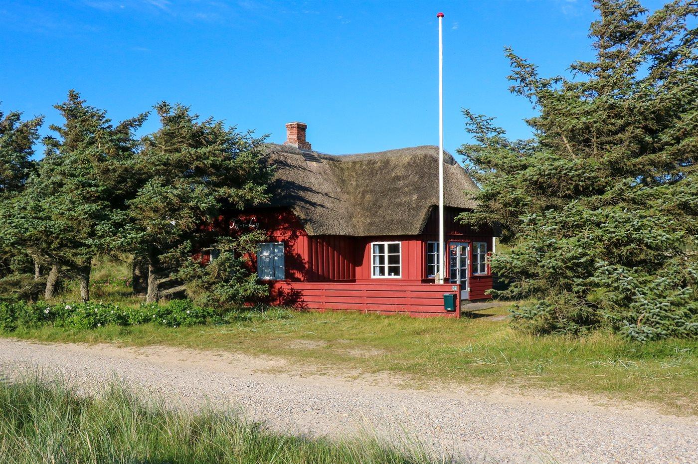 Hyggeligt ældre svenskrødt træhus med stråtag placeret i forreste klitrække, tæt på stranden direkte ud til fredede klitarealer. Et af de ældste huse i området med stemningsfuldt originalt interiør fra trediverne. Huset er optaget på kulturarvsstyrelsens liste over fredede og bevaringsværdige bygninger. Renoveret i 2006 med respekt for husets sjæl. 3 terrasser heraf en overdækket. Fra den sydvendte terrasse er der god udsigt mod de fredede klitarealer.