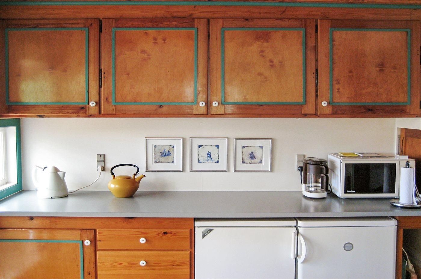 Køkkenet er udstyret med 1 køleskab. Der er 4 elkogeplader, varmluftovn, mikrobølgeovn.