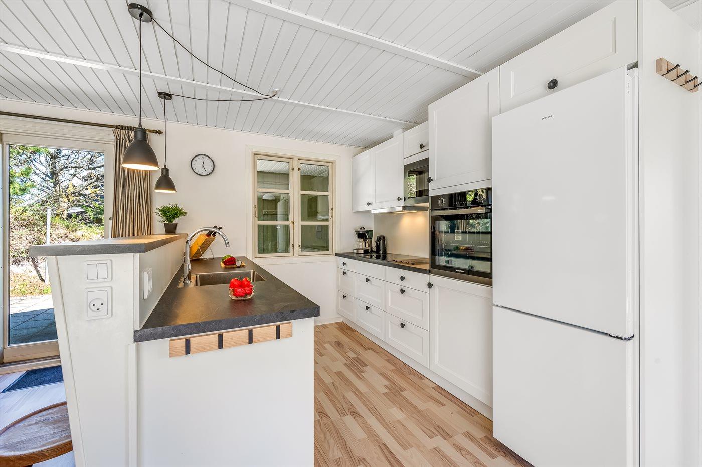 Køkkenet er udstyret med 1 køleskab. Der er 4 keramiske kogeplader, varmluftovn, mikrobølgeovn samt opvaskemaskine.