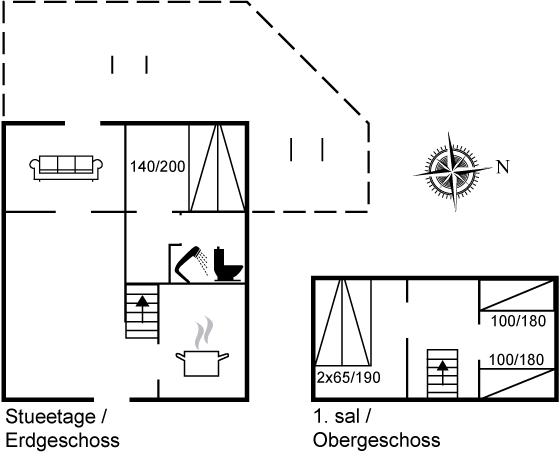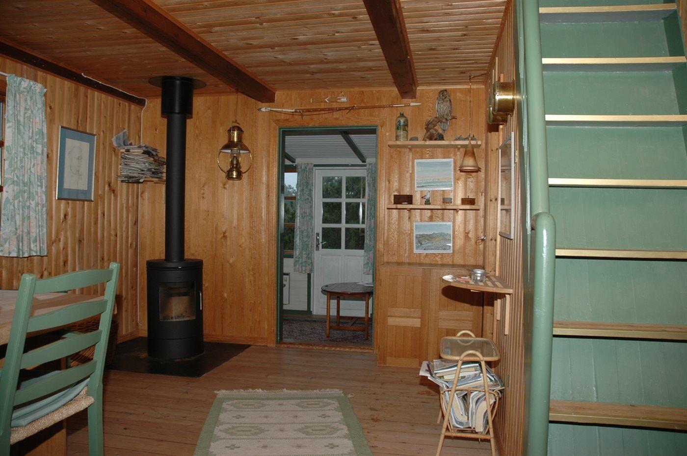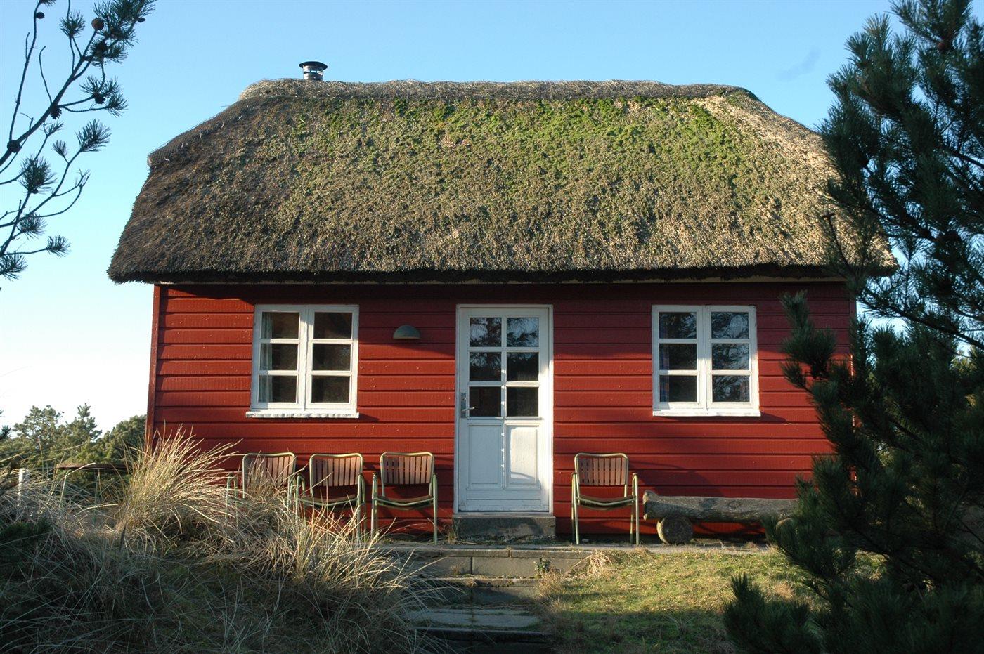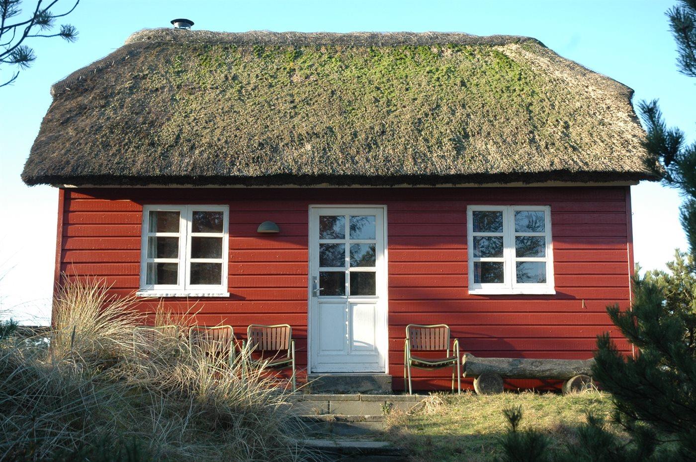 Lille hyggeligt feriehus i nordisk stil med stråtag. Velegnet til 2 voksne og op til 3 børn. Ligger på toppen af en klit med en uforstyrret udsigt over landskabet. Bemærk en stejl trappe fører op til den øverste etage som har 2 soveværelser: 1 soveværelse med senge på 2x100/180 og det andet soveværelse med en seng på 130/240 en del af lejet er kun 177 lang. Egnet til børn p.g.a. loftshøjden.