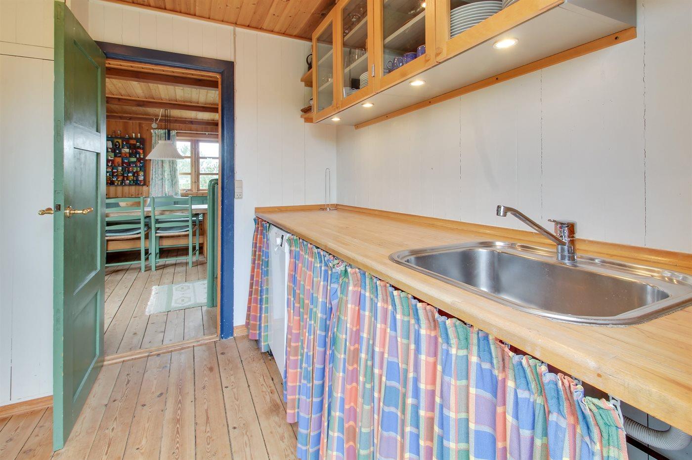 Køkkenet er udstyret med 1 køleskab. Der er 4 elkogeplader, bageovn samt opvaskemaskine.