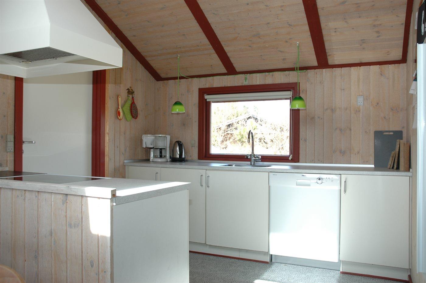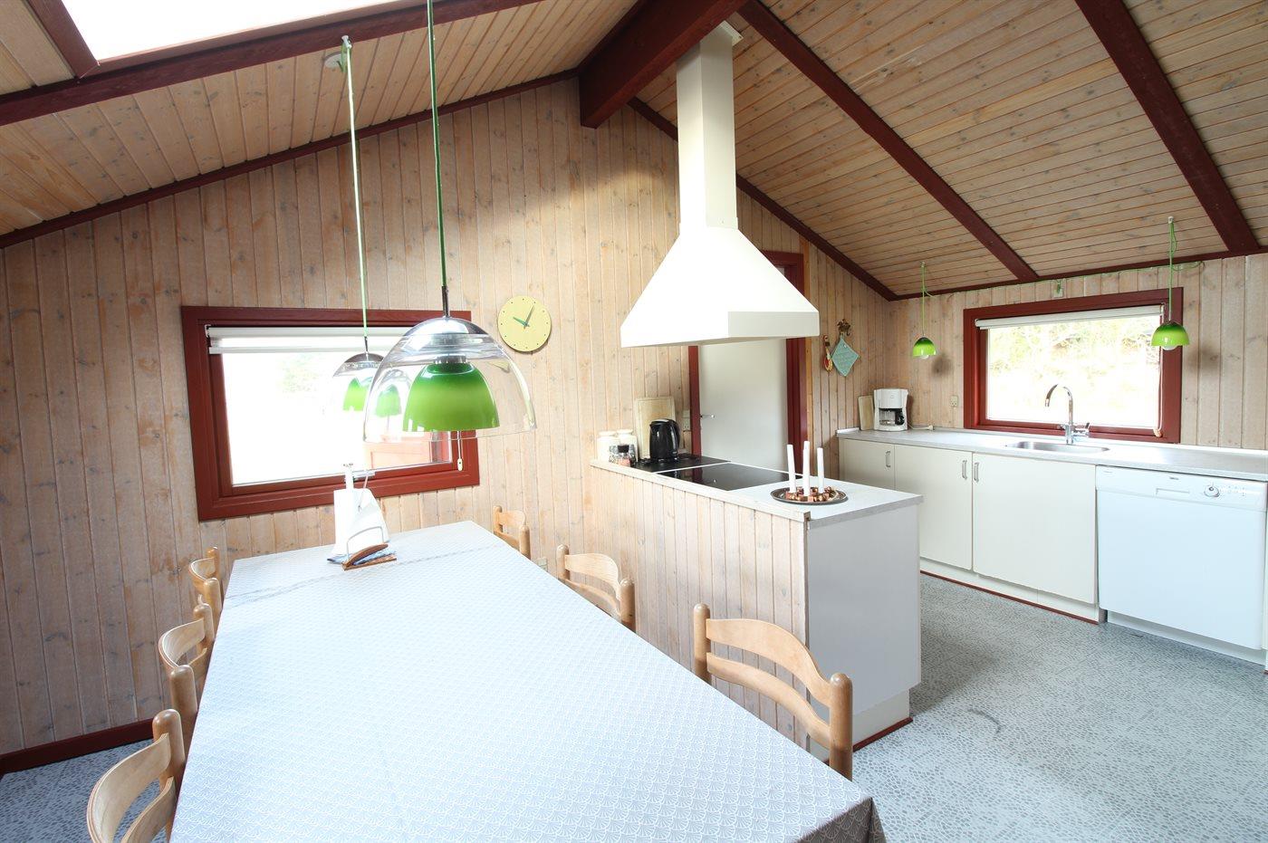 Køkkenet er udstyret med 1 køleskab. Der er 4 keramiske kogeplader, bageovn, mikrobølgeovn samt opvaskemaskine.