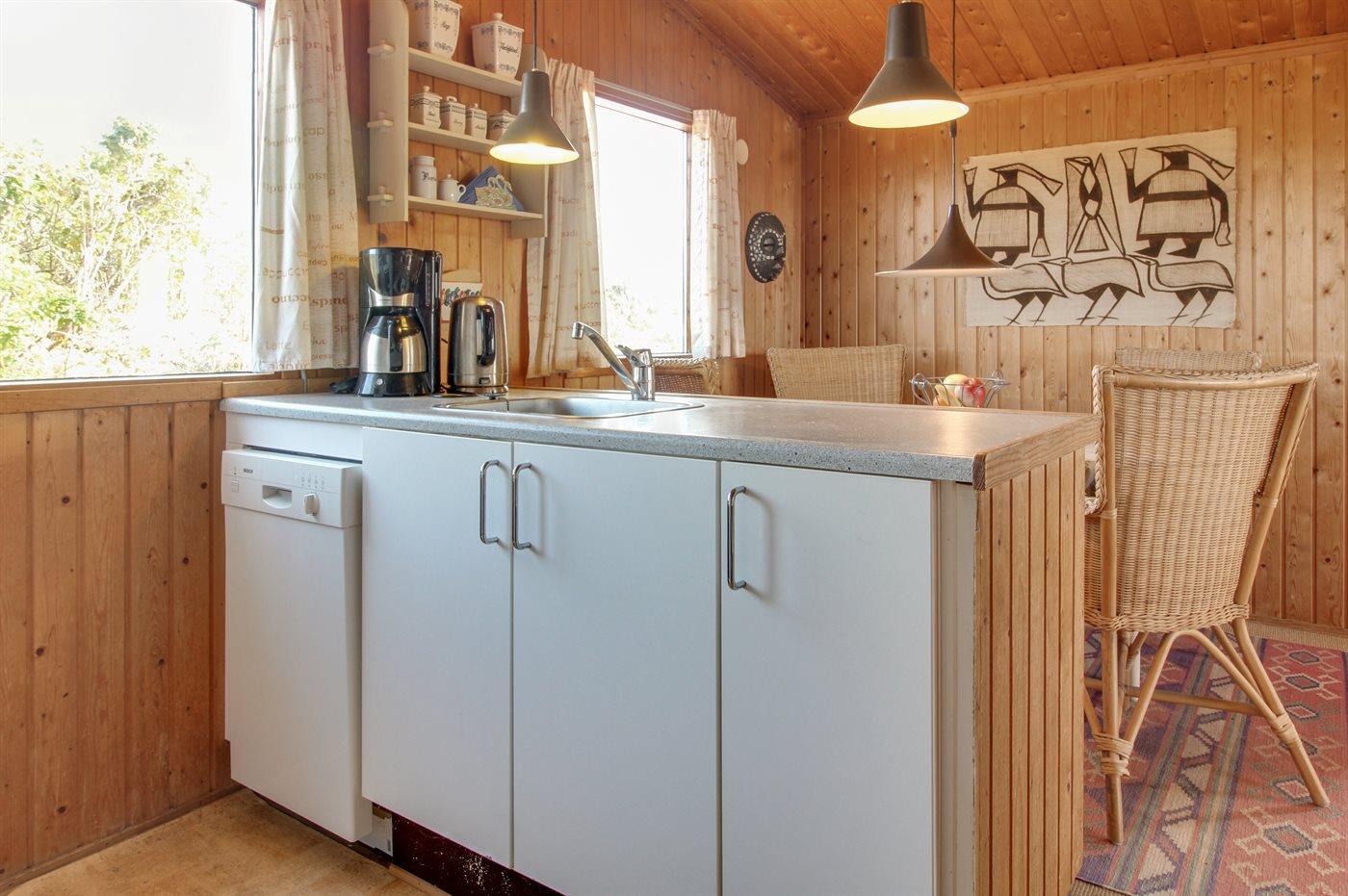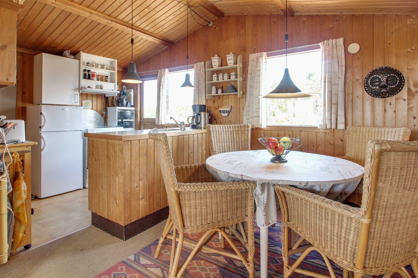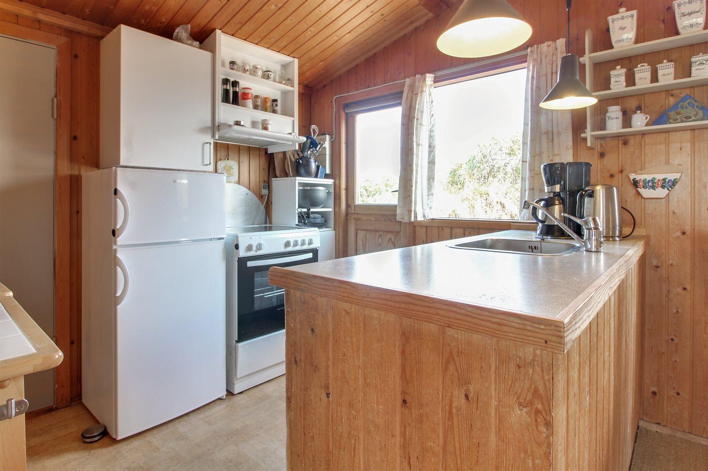 Køkkenet er udstyret med 1 køleskab. Der er 4 elkogeplader, bageovn, mikrobølgeovn samt opvaskemaskine.