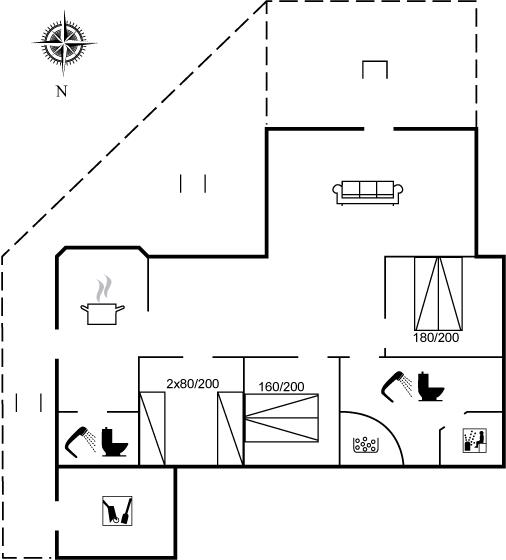Der er i alt 3 soveværelser. Sovepladserne fordeler sig på: 4 sovepladser i dobbeltsenge. 2 sovepladser i enkeltsenge.