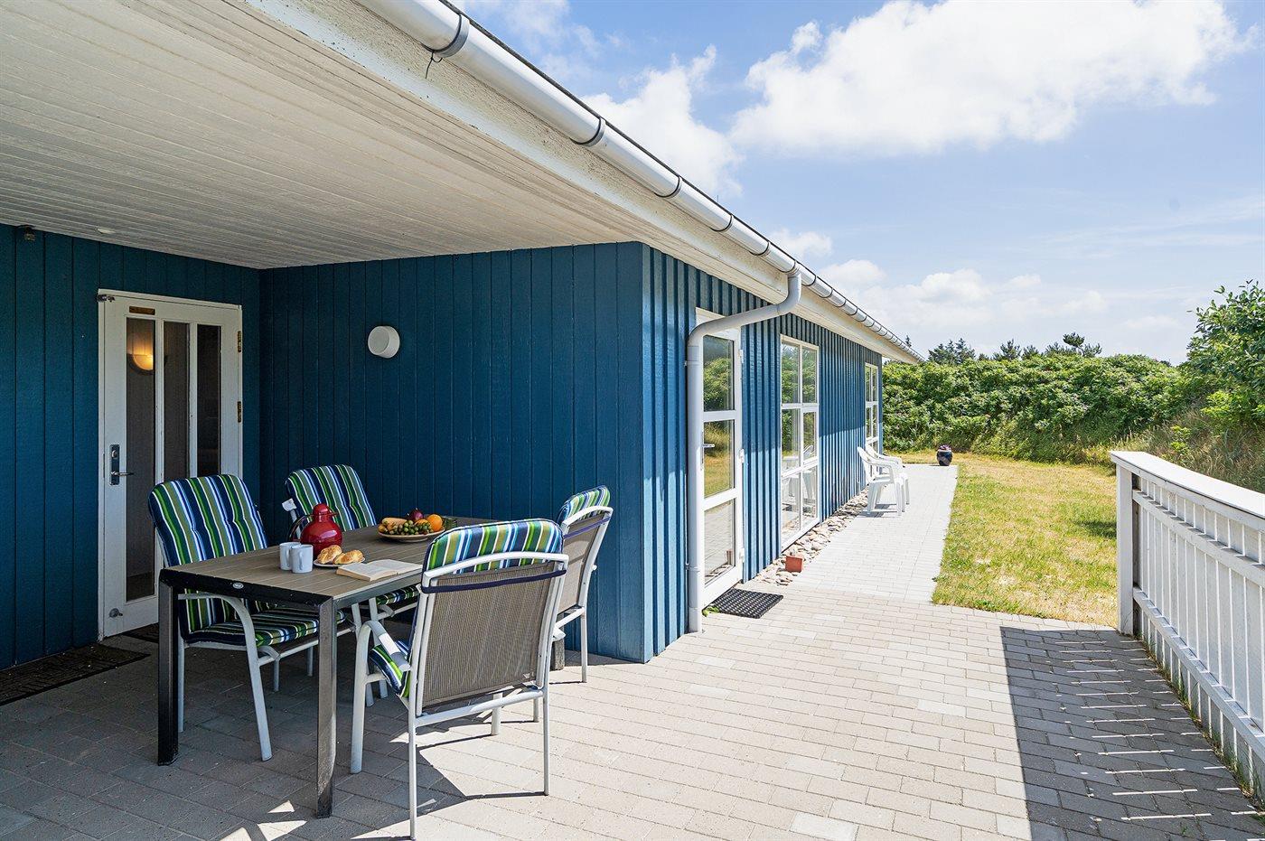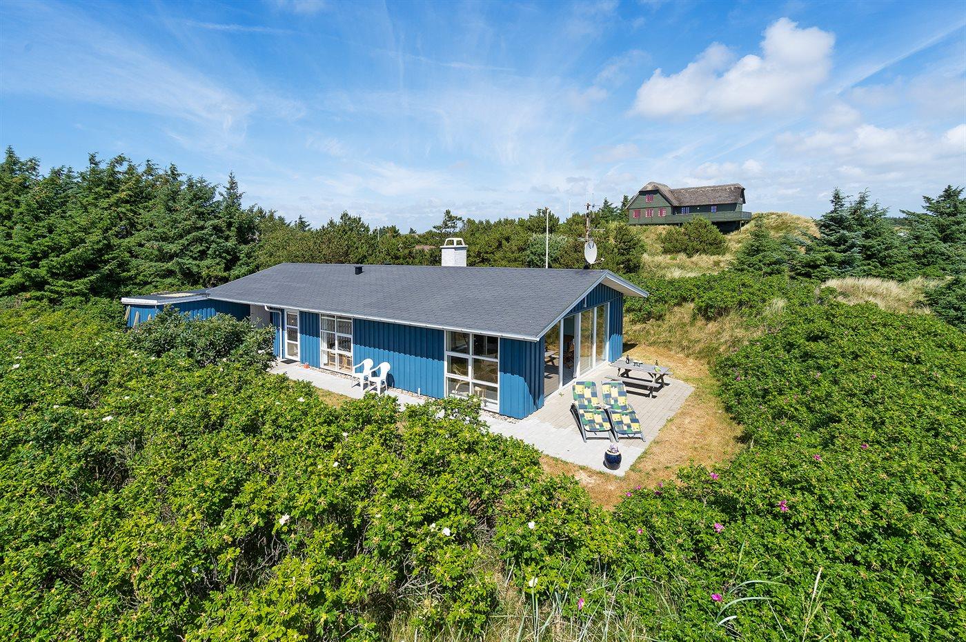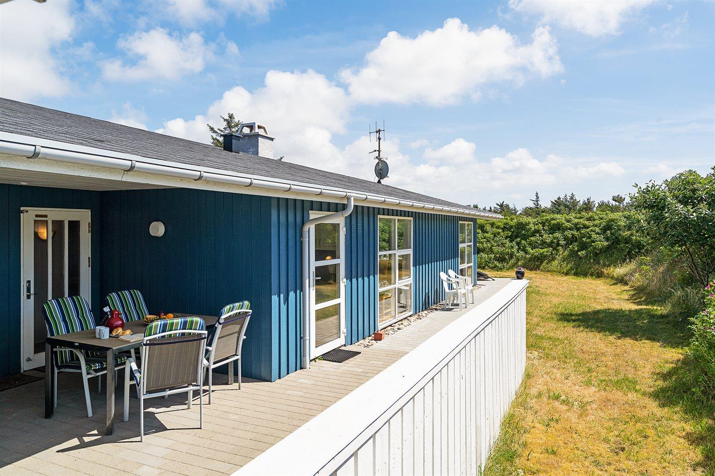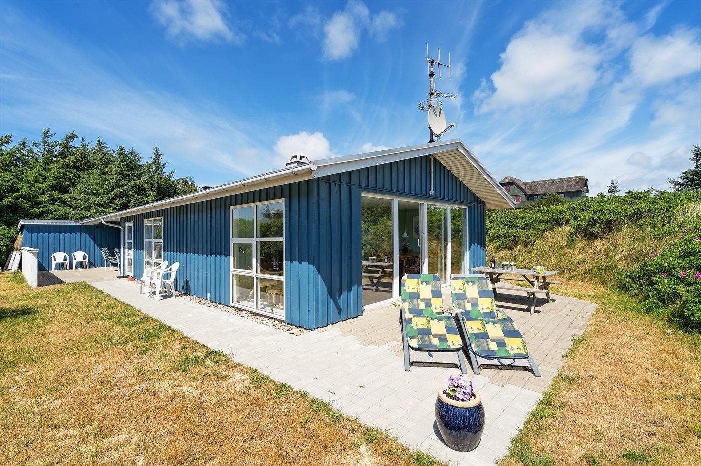 Kun 500 m fra Vesterhavet ligger dette dejlige sommerhus, som egner sig til 6 personer. Ferieboligen er på 115 m² og er bygget i 1970. I 2007 gennemgik ferieboligen en delvis renovering og er løbende vedligeholdt og renoveret. Ferieboligen har vaskemaskine, hyggelig brændeovn og sauna, og der er gode muligheder for afslapning. Ferieboligen er beliggende på en 1800 m² stor naturgrund. Der er carport til rådighed og parkering på grunden, lige ved ferieboligen. Nærmeste handelsmuligheder er beliggende i gåafstand, således er der kun mellem 100 og 300 m til handelsmuligheder med spisesteder, café, bar, dagligvarer, bager, sportstøj, kunst, smykker og meget mere. Til ferieboligen hører et 20 m² åben terrasse og 20 m² overdækket terrasse. Ligeledes er der adgang til udestue med spiseplads og hyggekrog. Sovepladserne fordeler sig på 3 værelser; 2 med dobbeltseng og 1 med 2 enkeltsenge. Køkkenet er udstyret med køleskab, fryser med en kapacitet på 60 liter, el-komfur med 4 kogeplader samt bageovn, mikrobølgeovn, opvaskemaskine, samt diverse husholdningsmaskiner og udstyr. Badeværelse med bruseniche og toilet. Ferieboligen indeholder ligeledes TV med danske og tyske kanaler, radio samt trådløs internetforbindelse.