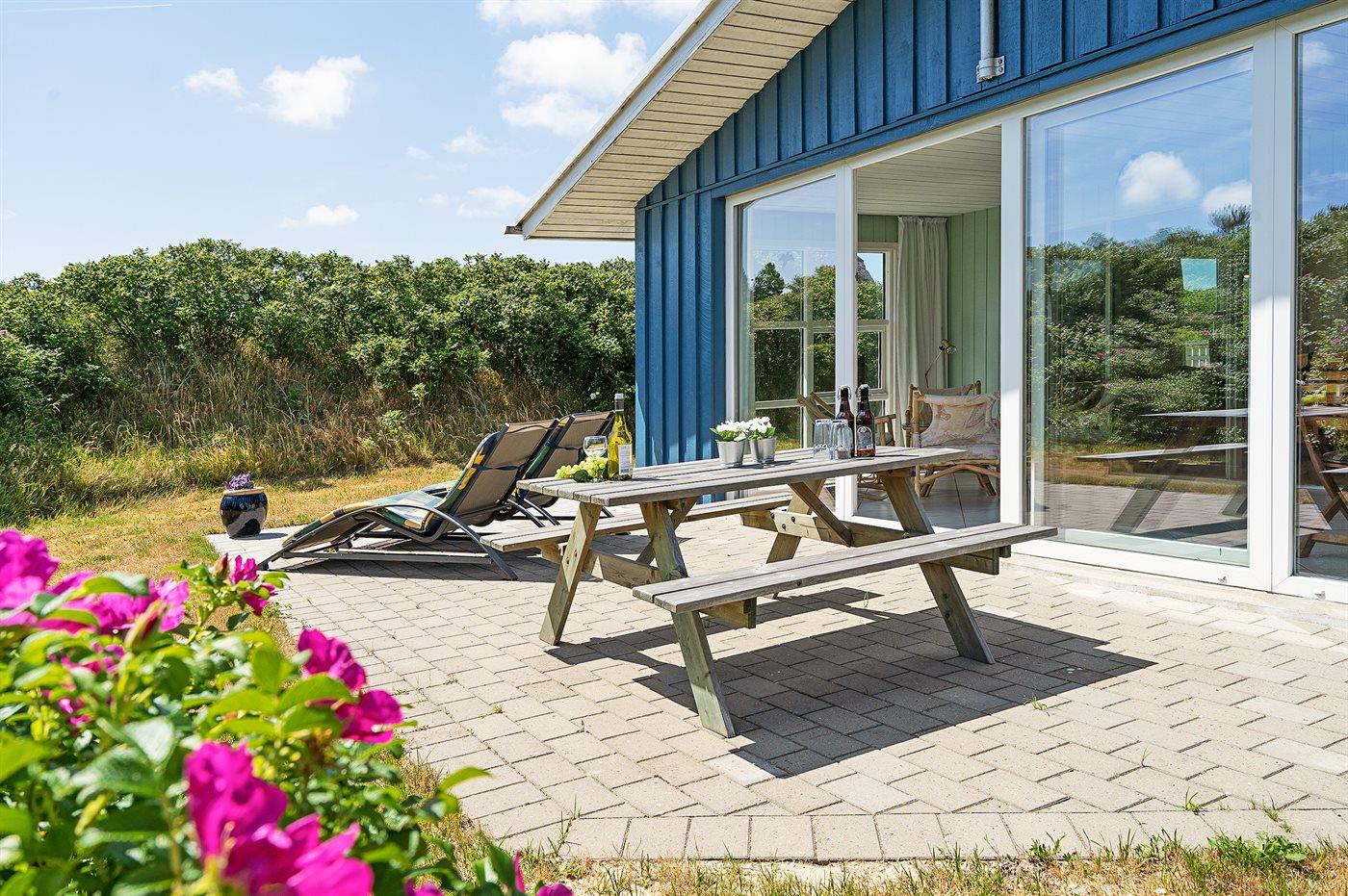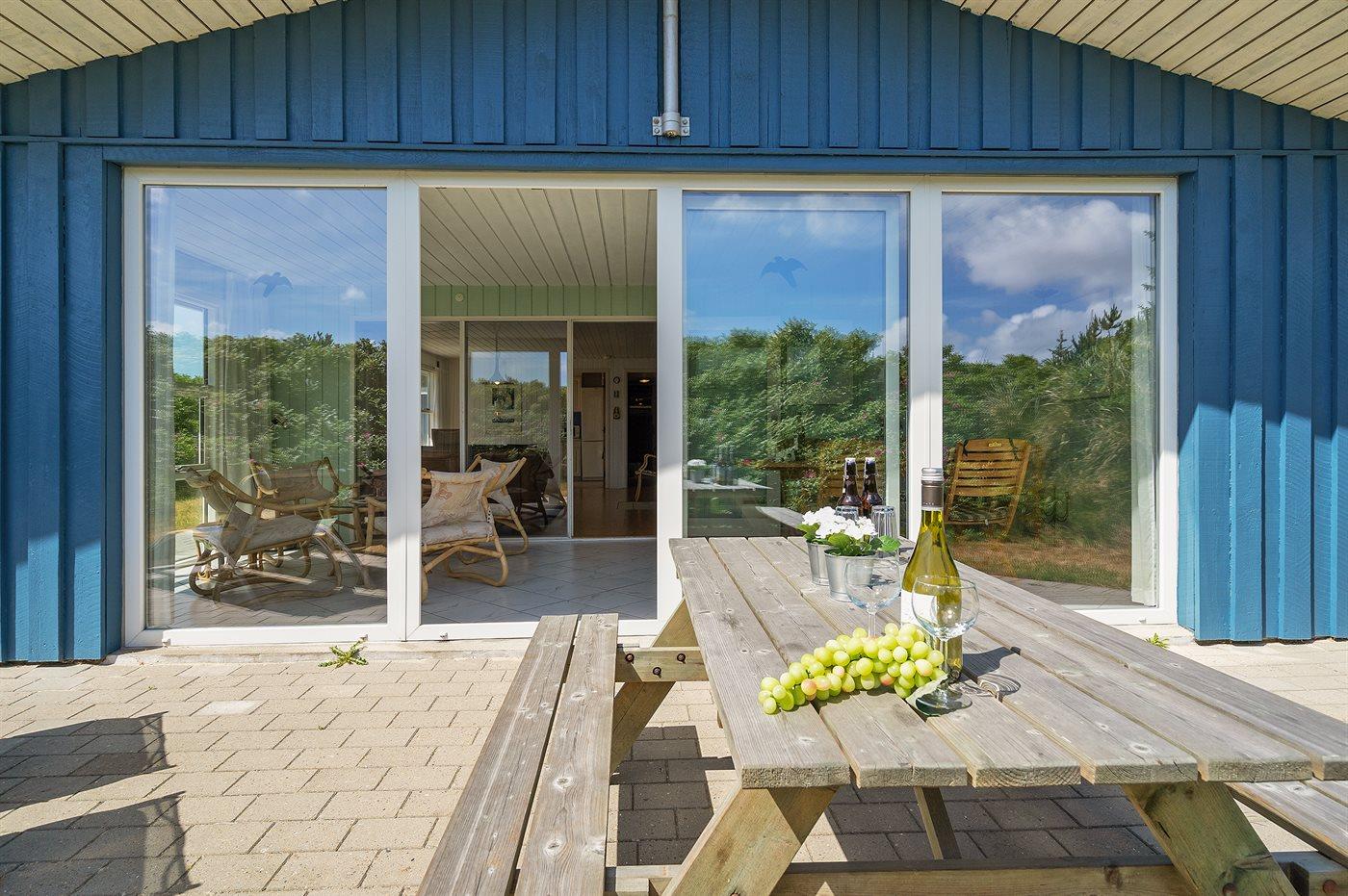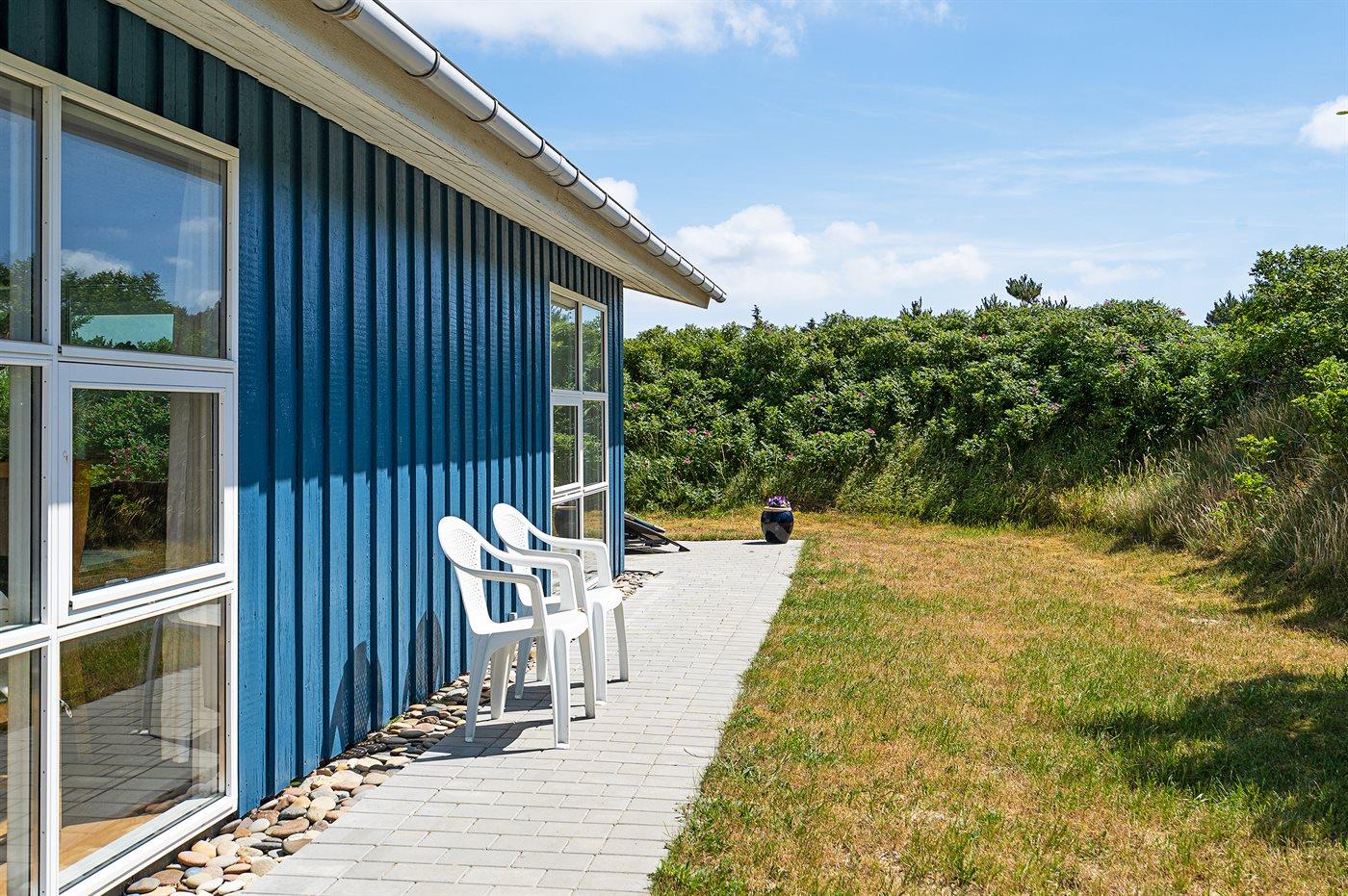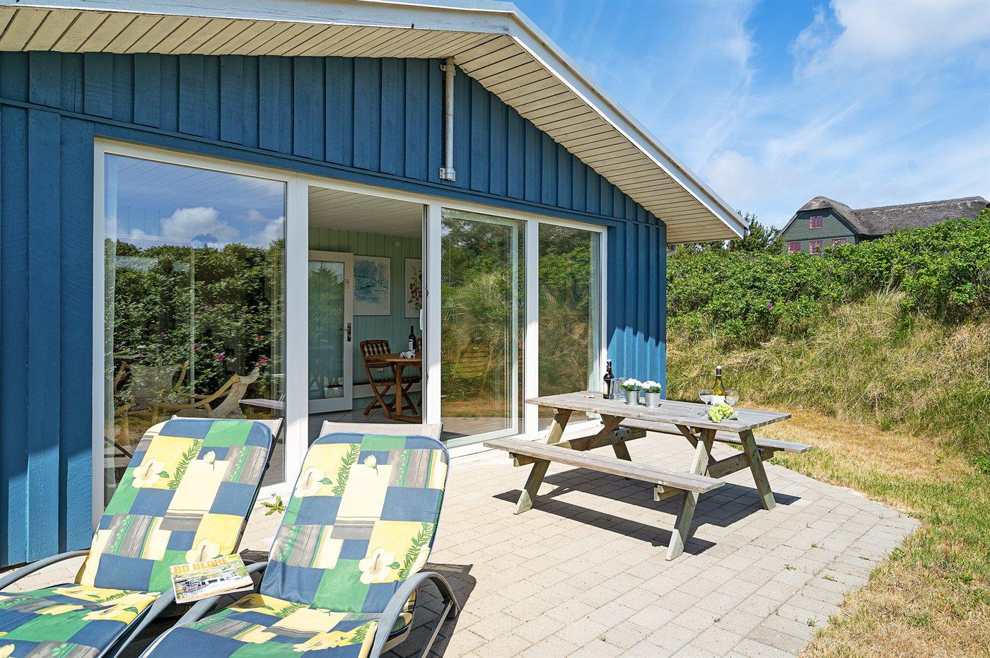 Kun 500 m fra Vesterhavet ligger dette dejlige sommerhus, som egner sig til 6 personer. Ferieboligen er på 115 m² og er bygget i 1970. I 2007 gennemgik ferieboligen en delvis renovering og er løbende vedligeholdt og renoveret. Ferieboligen har vaskemaskine, hyggelig brændeovn og sauna, og der er gode muligheder for afslapning. Ferieboligen er beliggende på en 1800 m² stor naturgrund. Der er carport til rådighed og parkering på grunden, lige ved ferieboligen. Nærmeste handelsmuligheder er beliggende i gåafstand, således er der kun mellem 100 og 300 m til handelsmuligheder med spisesteder, café, bar, dagligvarer, bager, sportstøj, kunst, smykker og meget mere. Til ferieboligen hører et 20 m² åben terrasse og 20 m² overdækket terrasse. Ligeledes er der adgang til udestue med spiseplads og hyggekrog. Sovepladserne fordeler sig på 3 værelser; 2 med dobbeltseng og 1 med 2 enkeltsenge. Køkkenet er udstyret med køleskab, fryser med en kapacitet på 60 liter, el-komfur med 4 kogeplader samt bageovn, mikrobølgeovn, opvaskemaskine, samt diverse husholdningsmaskiner og udstyr. Badeværelse med bruseniche og toilet. Ferieboligen indeholder ligeledes TV med danske og tyske kanaler, radio samt trådløs internetforbindelse.