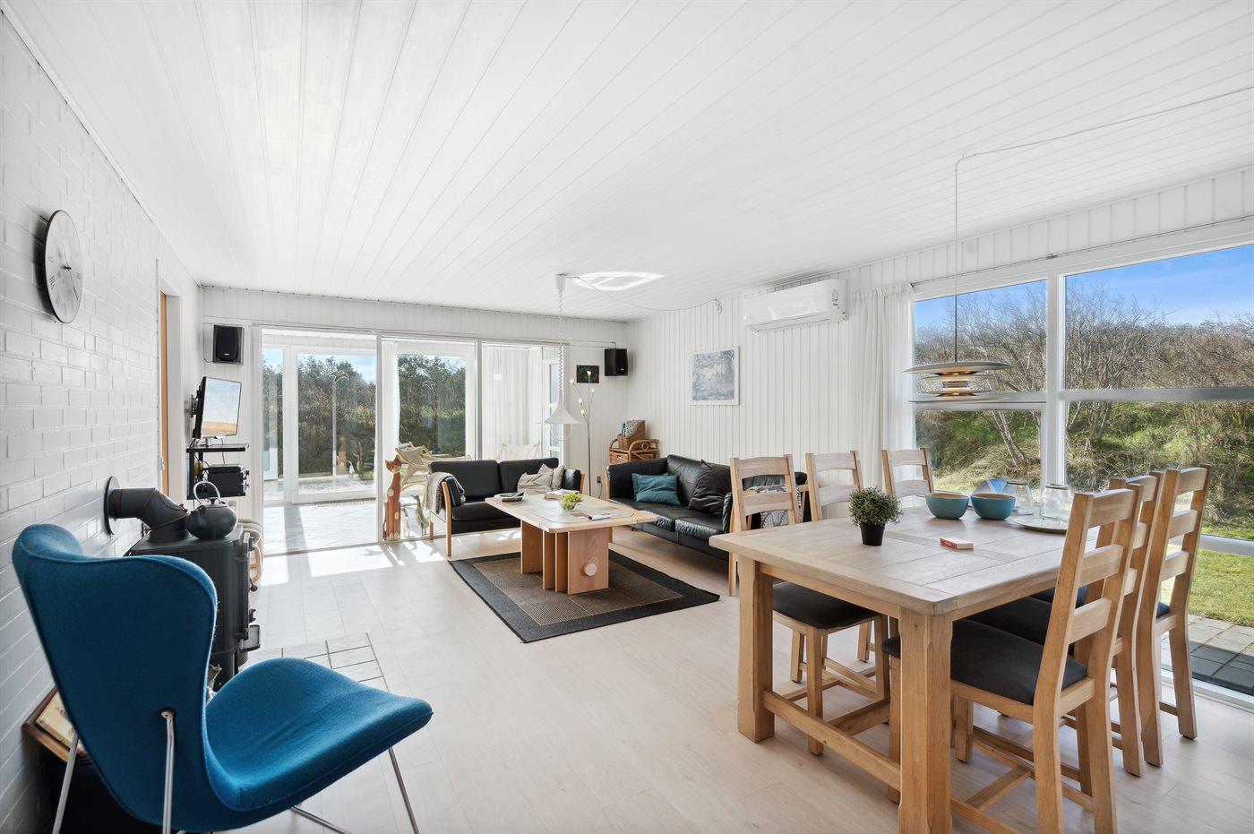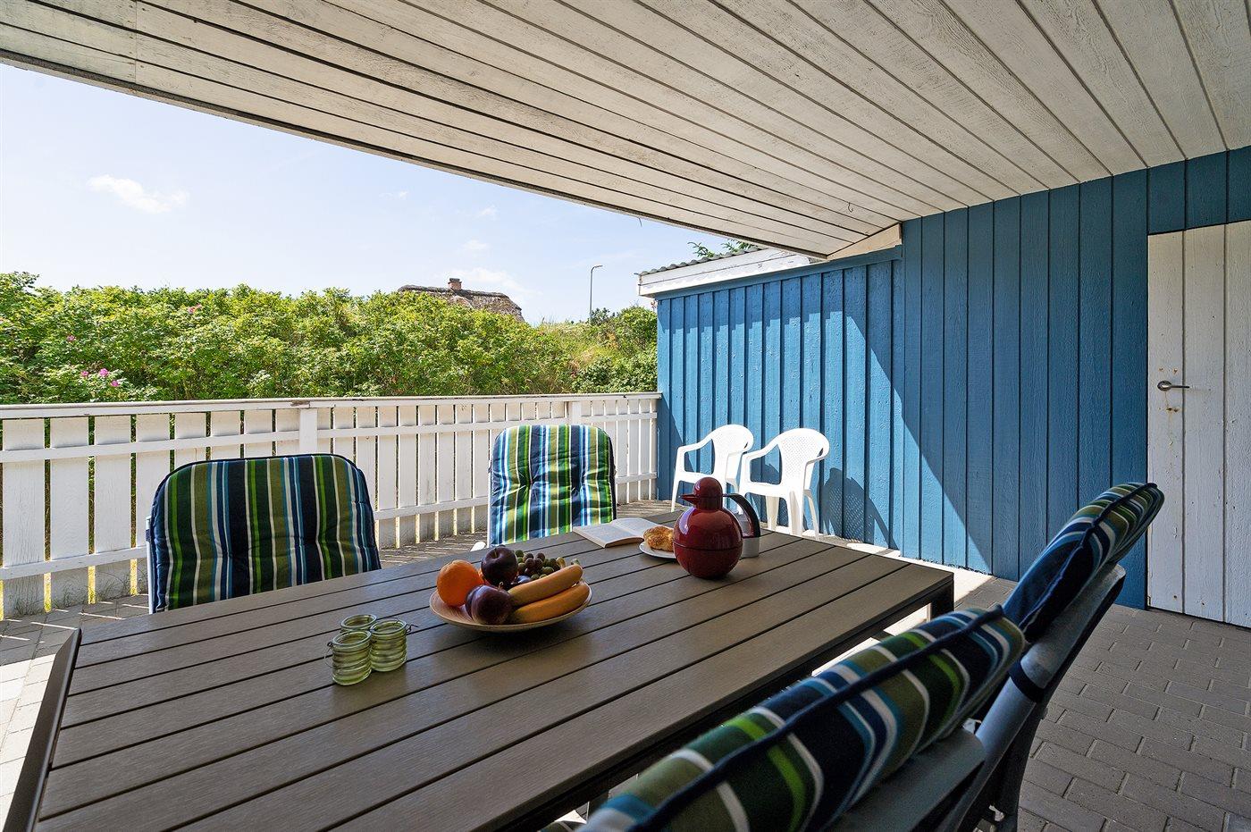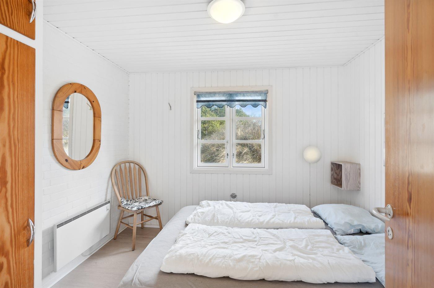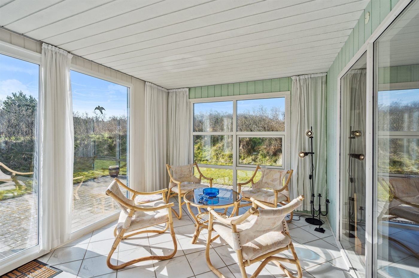 Kun 500 m fra Vesterhavet ligger dette dejlige sommerhus, som egner sig til 6 personer. Ferieboligen er på 115 m² og er bygget i 1970. I 2007 gennemgik ferieboligen en delvis renovering og er løbende vedligeholdt og renoveret. Ferieboligen har vaskemaskine, hyggelig brændeovn og sauna, og der er gode muligheder for afslapning. Ferieboligen er beliggende på en 1800 m² stor naturgrund. Der er carport til rådighed og parkering på grunden, lige ved ferieboligen. Nærmeste handelsmuligheder er beliggende i gåafstand, således er der kun mellem 100 og 300 m til handelsmuligheder med spisesteder, café, bar, dagligvarer, bager, sportstøj, kunst, smykker og meget mere. Til ferieboligen hører et 20 m² åben terrasse og 20 m² overdækket terrasse. Ligeledes er der adgang til udestue med spiseplads og hyggekrog. Sovepladserne fordeler sig på 3 værelser; 2 med dobbeltseng og 1 med 2 enkeltsenge. Køkkenet er udstyret med køleskab, fryser med en kapacitet på 60 liter, el-komfur med 4 kogeplader samt bageovn, mikrobølgeovn, opvaskemaskine, samt diverse husholdningsmaskiner og udstyr. Badeværelse med bruseniche og toilet. Ferieboligen indeholder ligeledes TV med danske og tyske kanaler, radio samt trådløs internetforbindelse.